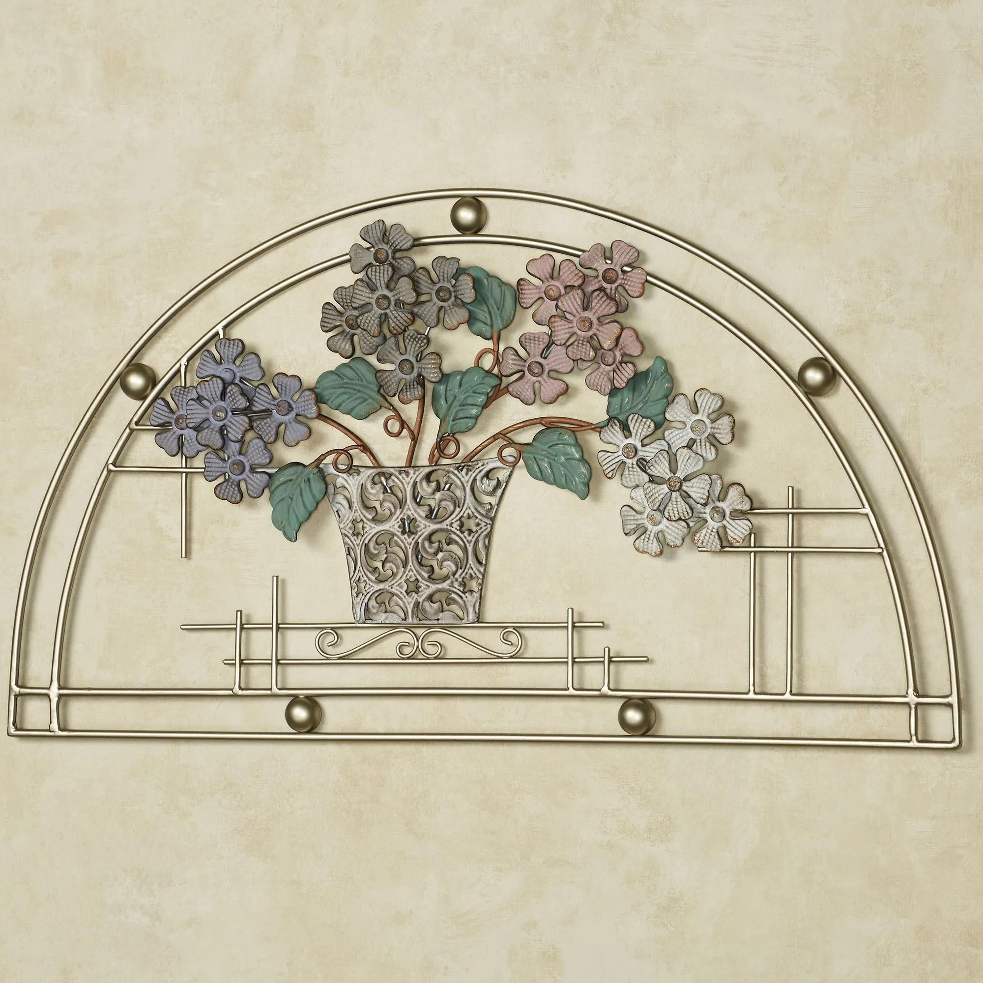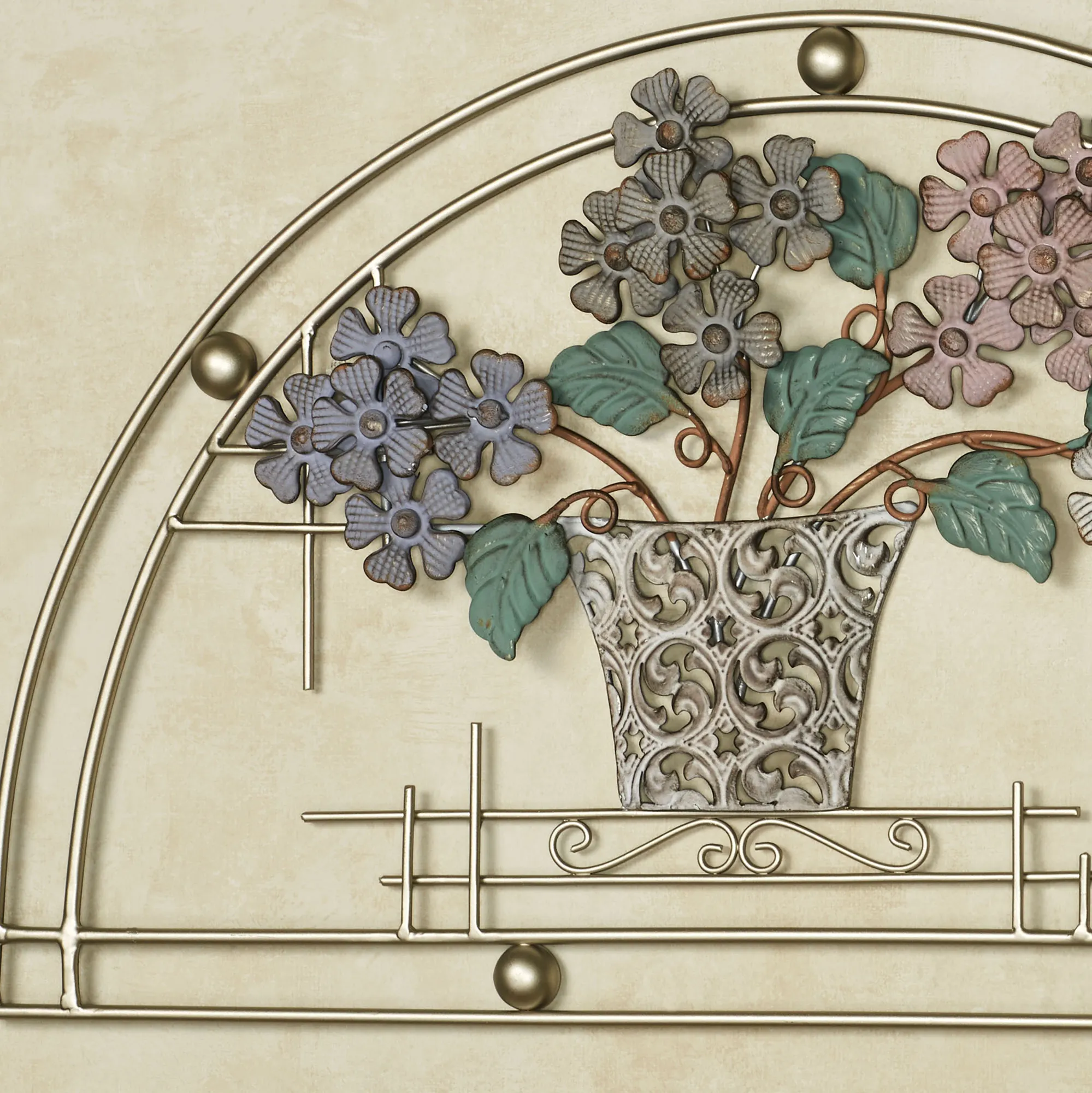 Lovely blossoms project their natural beauty Through the Window. Made of metal, this arched openwork wall art has a platinum finish and features a flower arrangement with purple, gray, pink, and ivory flowers in an ivory pot. Scrolls and orb accents add charm. Floral wall art measures 26"Wx1"Dx14"H.