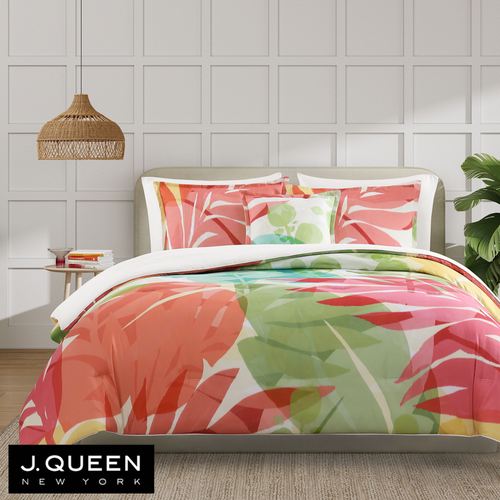 Tropical fronds sway to island breezes on the Tiki Bedding. This lightweight polyester ensemble, from J. Queen Bold, is super soft and features a modern, printed palm leaf design. The fuchsia coloration includes shades of fuchsia, green, golden yellow, coral, blue, pink, and white.