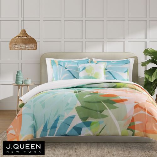 Tropical fronds sway to island breezes on the Tiki Bedding. This lightweight polyester ensemble, from J. Queen Bold, is super soft and features a modern, printed palm leaf design. The green coloration includes shades of green, lime, blue, golden yellow, coral, and white.