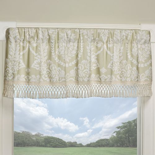 The Timeless Sage Woven Matelasse Valance will adorn your window with traditional elegance. Made with yarn-dyed cotton/polyester, this beautiful valance features random-cut woven matelasse designs of ecru leaves and medallions on a sage background. Tailored valance has 4"L bullion fringe and a 3" rod pocket. Measures 60"Wx18"L. Machine washable.