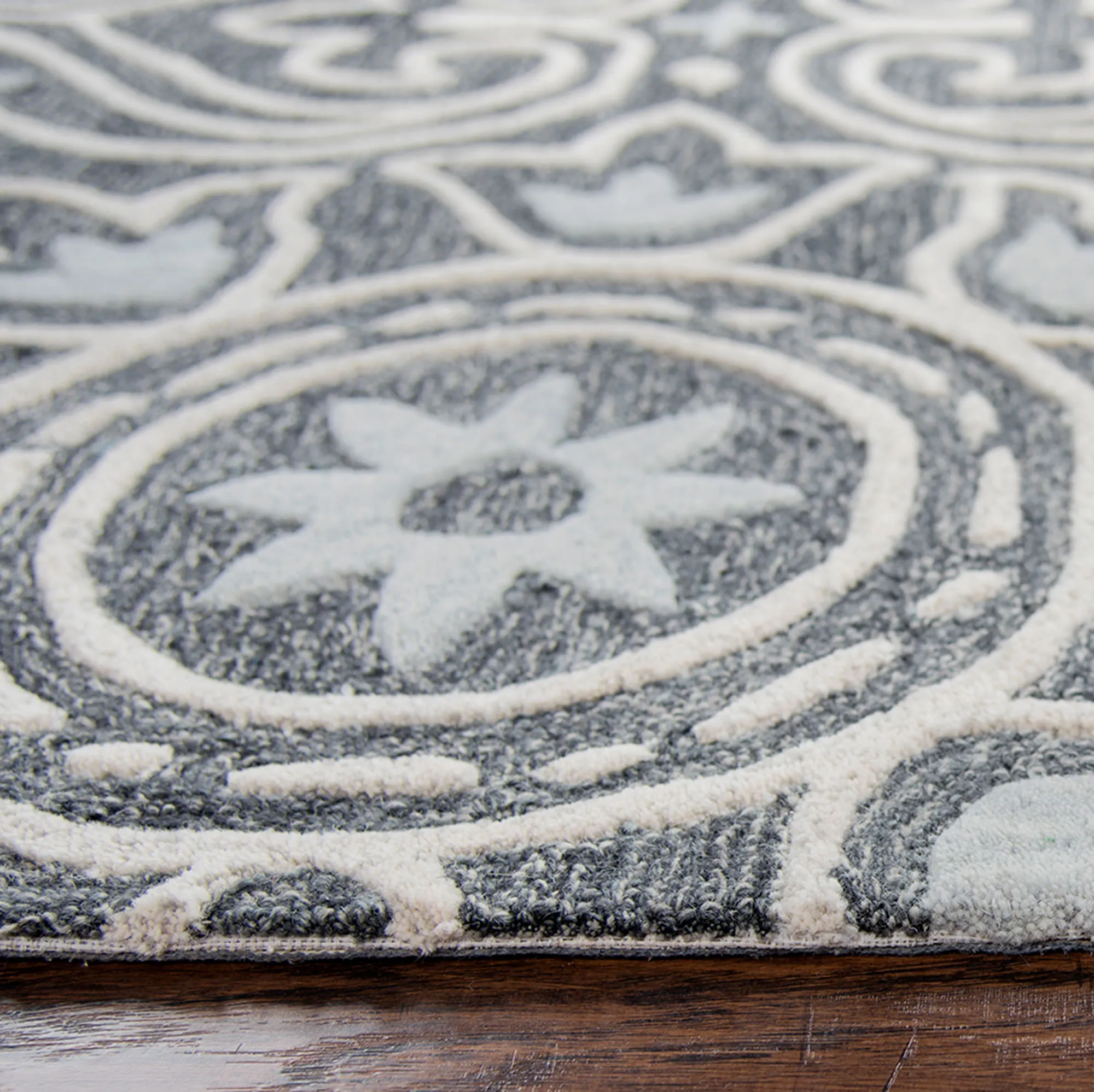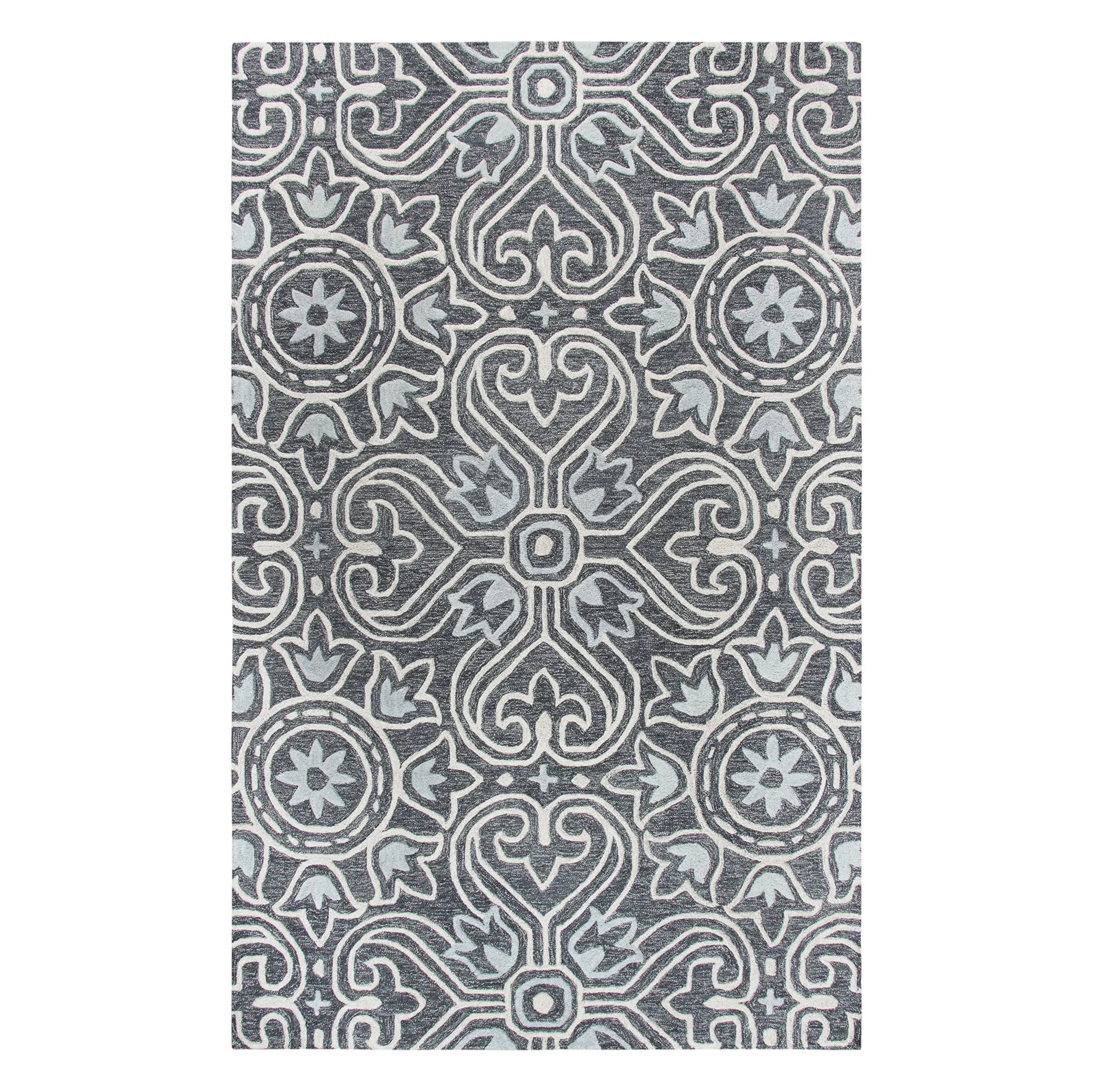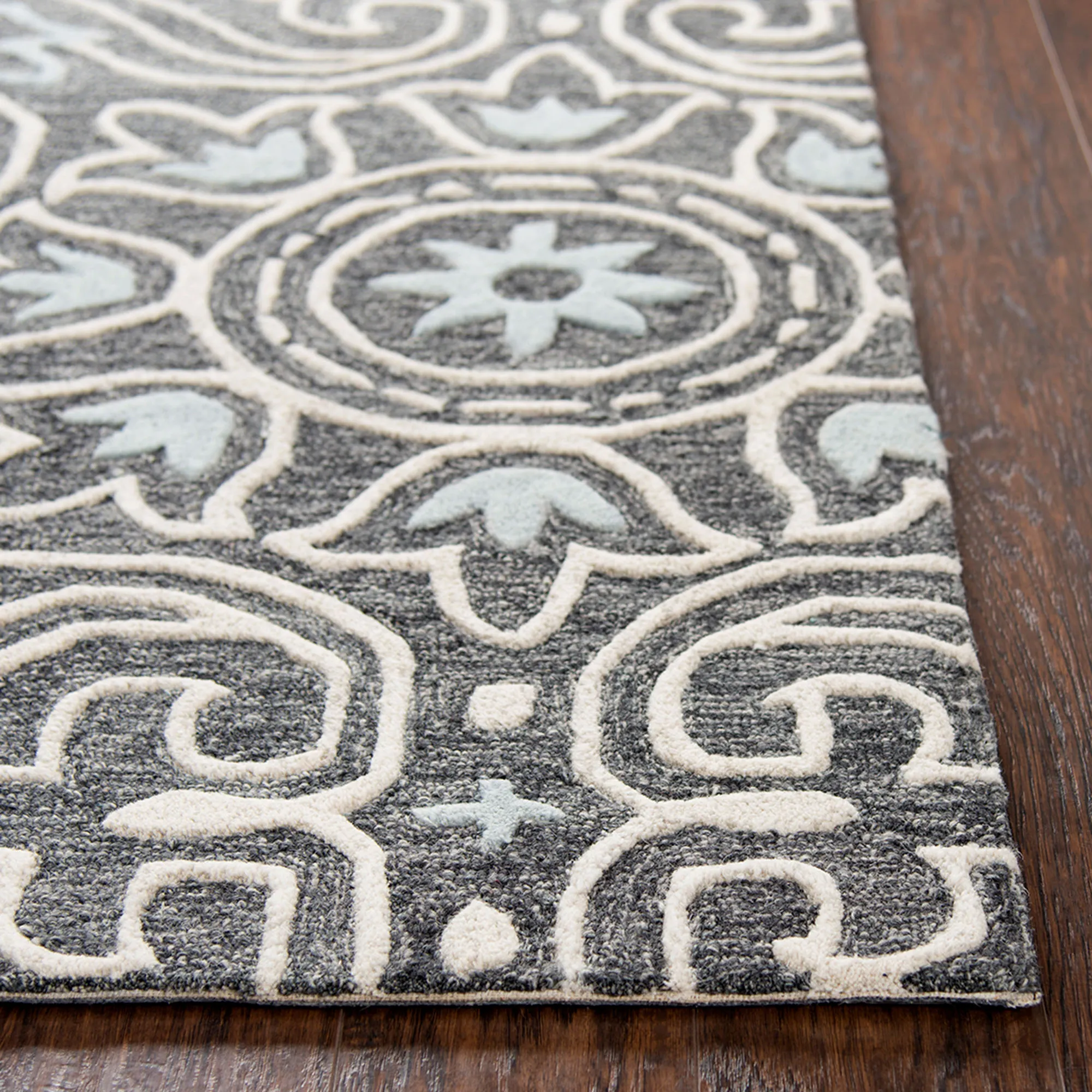 The Tina Tulip Rug elegantly swirls with medallion, tulip, and fleur patterns. This hand-tufted wool area rug, .5" thick, has handcarved and hand-hooked high-low designs in shades of dark gray, baby blue, and white. Backing is cotton canvas. We recommend professional cleaning by a rug cleaner. Imported.