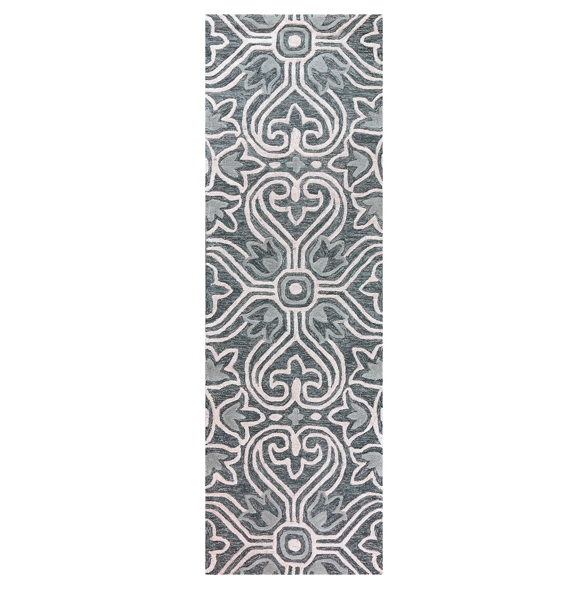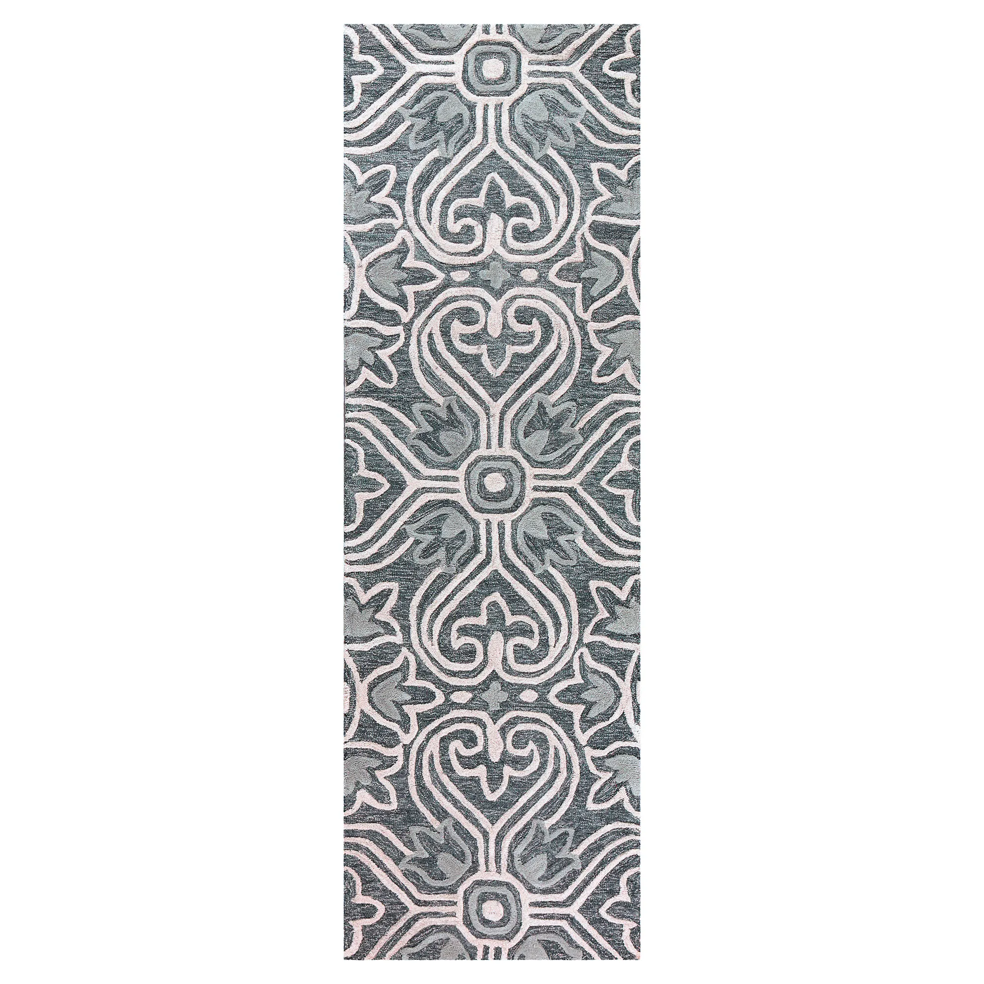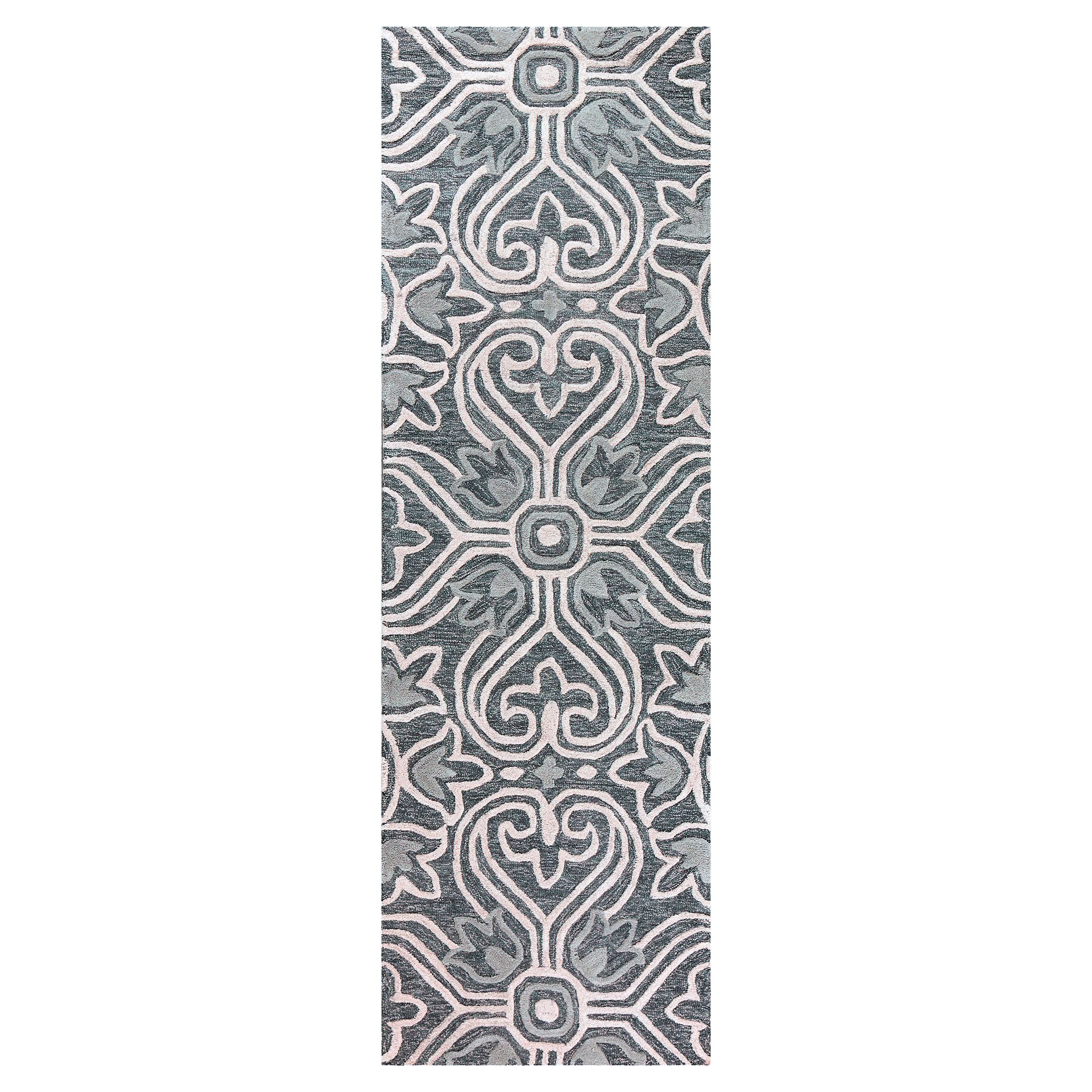 The Tina Tulip Rug elegantly swirls with medallion, tulip, and fleur patterns. This hand-tufted wool area rug, .5" thick, has handcarved and hand-hooked high-low designs in shades of dark gray, baby blue, and white. Backing is cotton canvas. We recommend professional cleaning by a rug cleaner. Imported.
