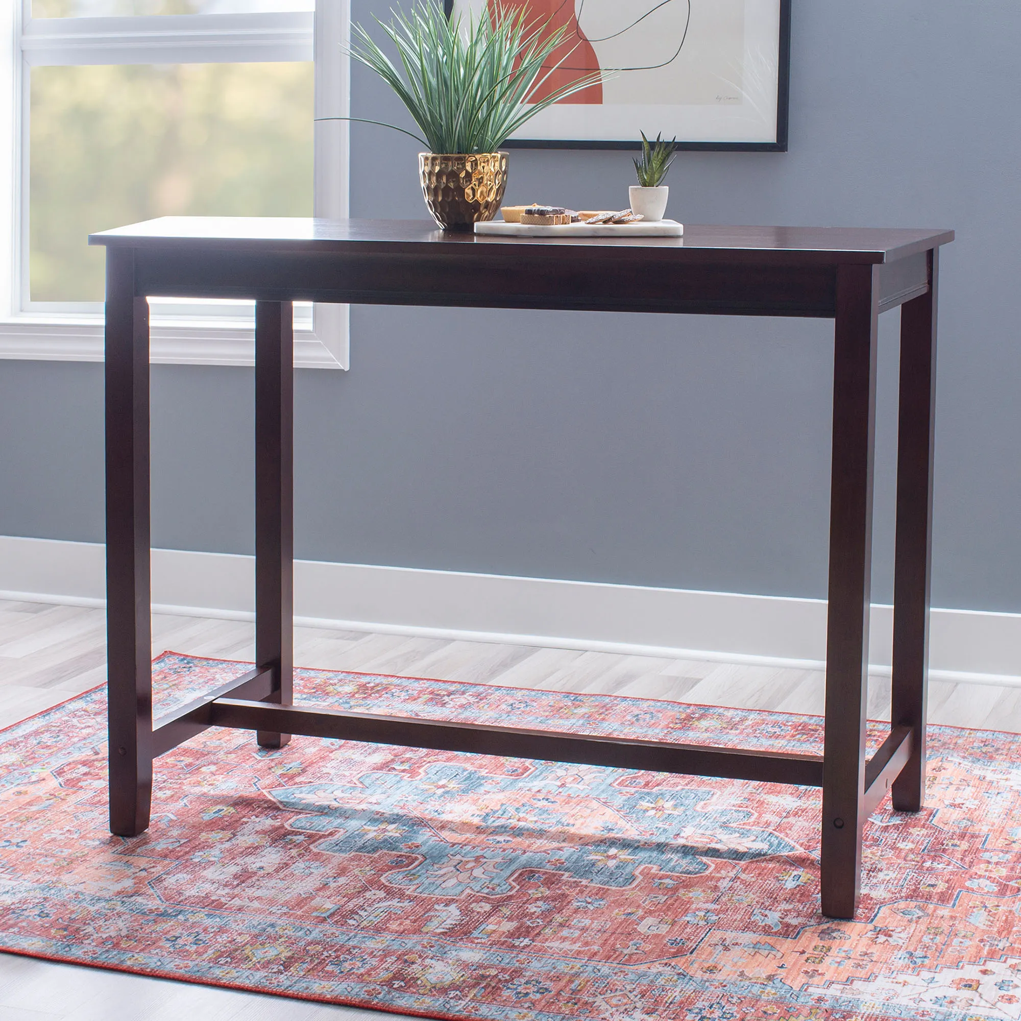 Complete your office, dining, or entryway space with the stylish Tobias Pub Table. Finished in autumn cherry, the slender table features a solid wood base, clean sleek lines, a wooden veneer top, and a bottom brace that provides a convenient footrest for the two-person seating capacity. Maximum weight is 100 lbs. Bar Pub Table measures 47"Wx24"Dx42"H and weighs approx. 49 lbs; for best results, select seating with a 30"-34" height. Counter Pub Table measures 47"Wx24"Dx36"H and weighs approx. 47 lbs; for best results, select seating with a 24"-28" height.