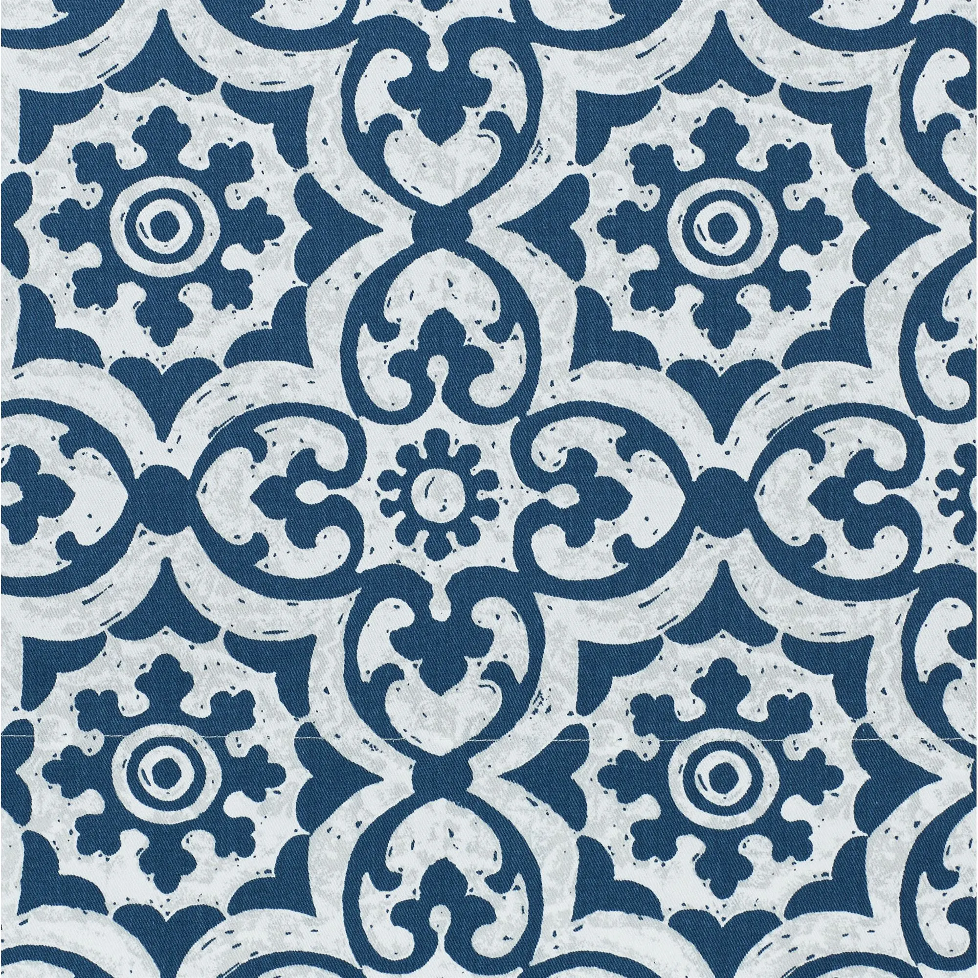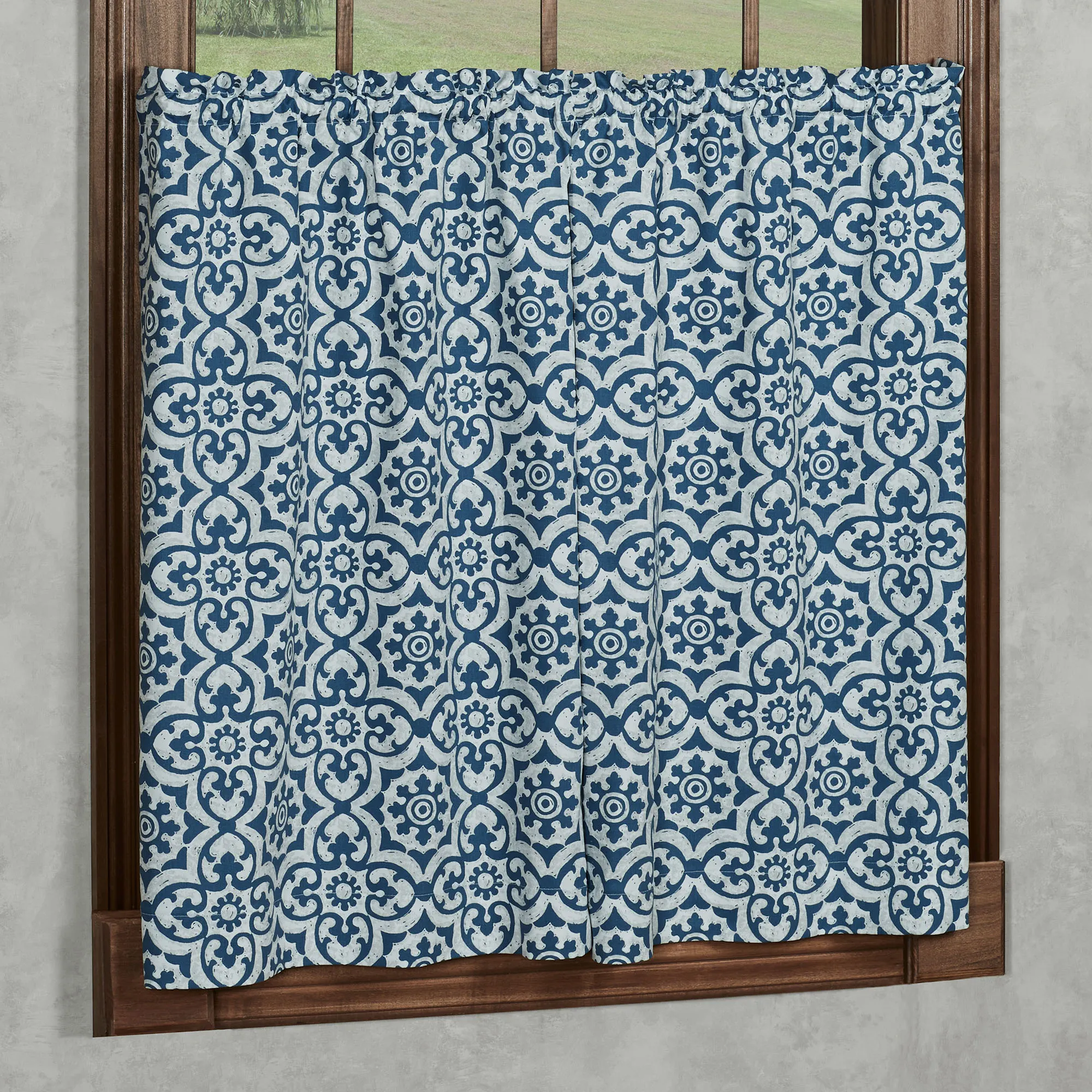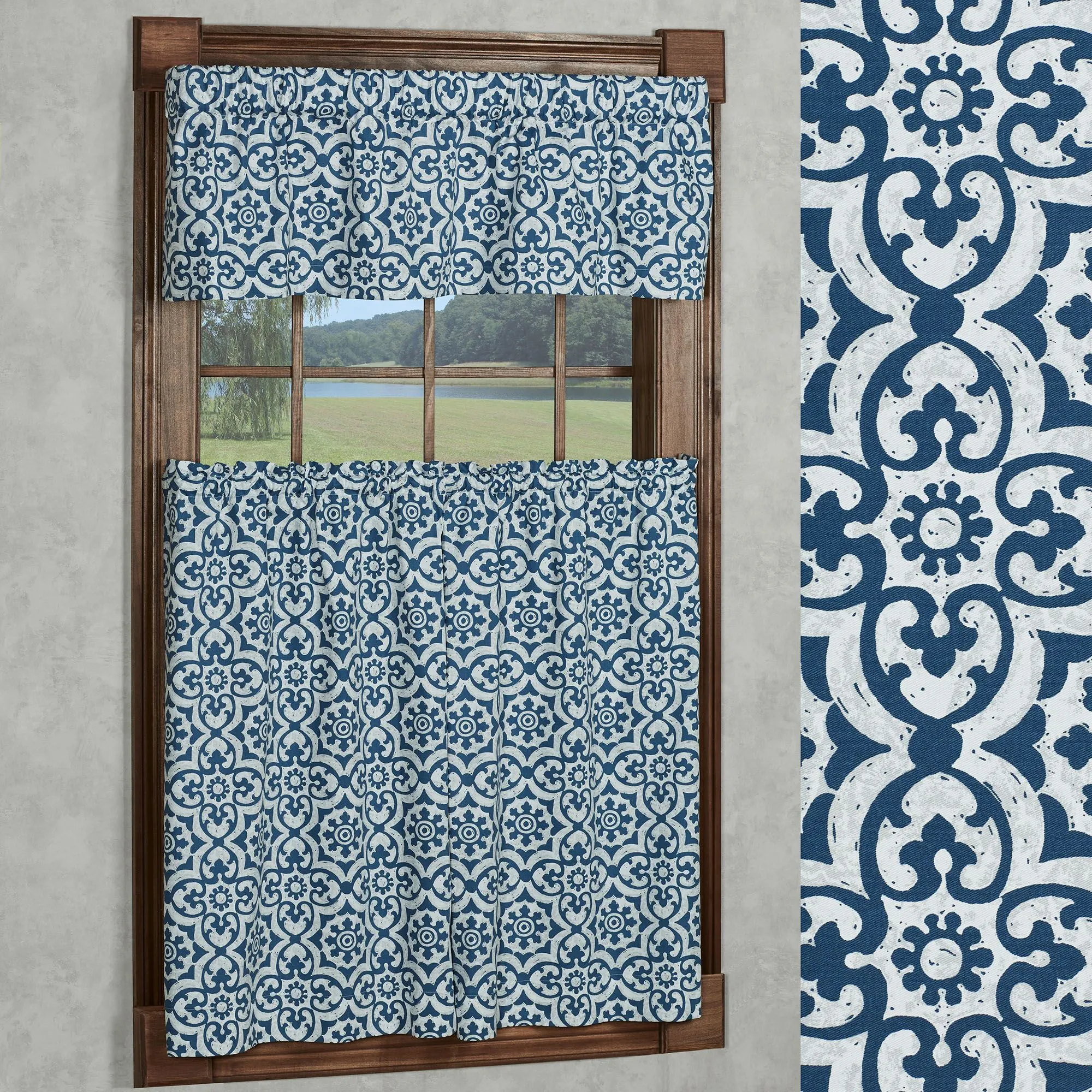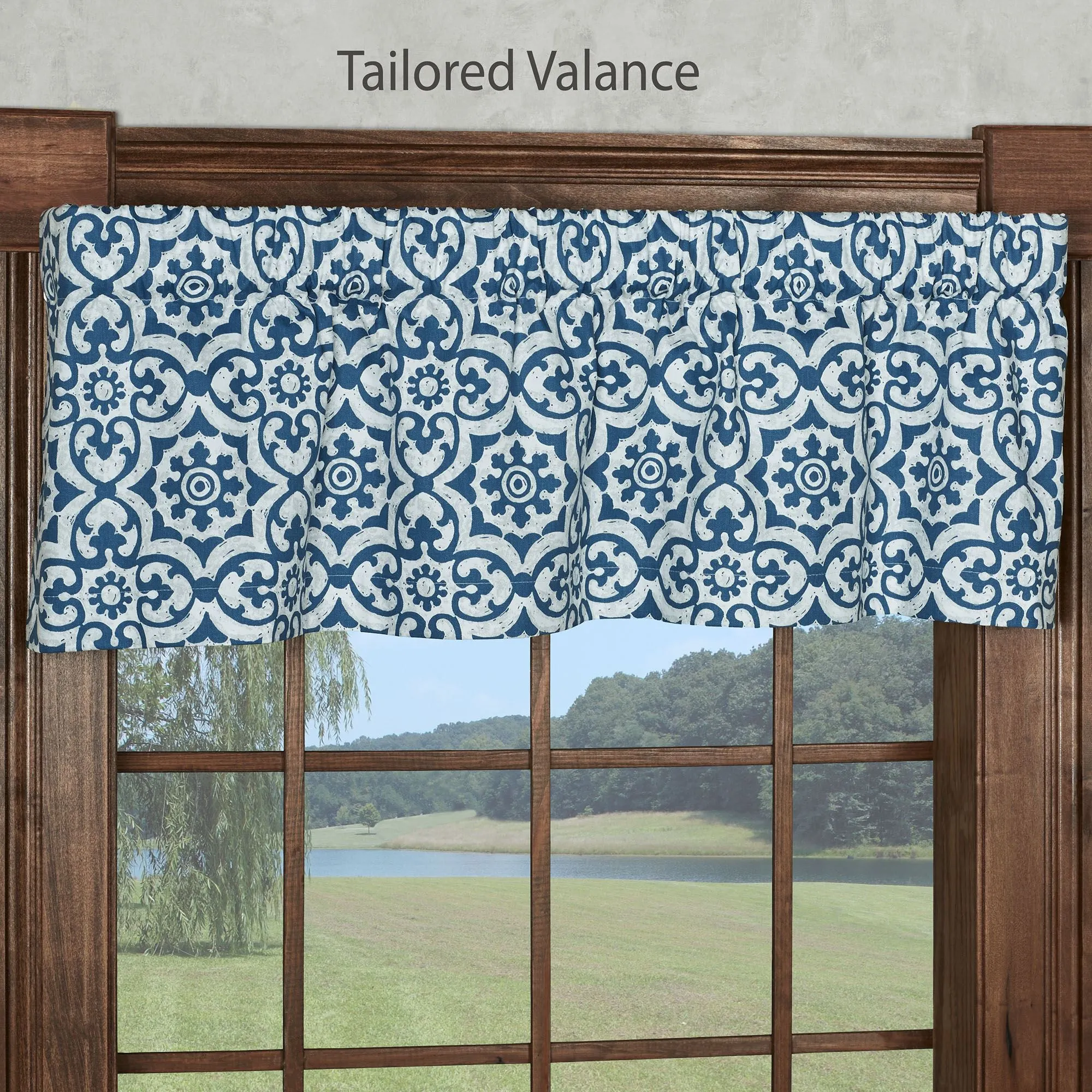 The swirling design on the Torrence Tier Window Treatment looks fascinating. The cotton window treatment features a navy motif on a white and gray background. Tiers have a 1.5" rod pocket; valances have a 3" rod pocket. Specify Tier Pair, 50"W; Tailored Valance, 50"Wx16"L; or Scalloped Valance, 50"Wx16"L. The Scalloped Valance has a piped bottom edge and a polyester/cotton lining. Machine washable.