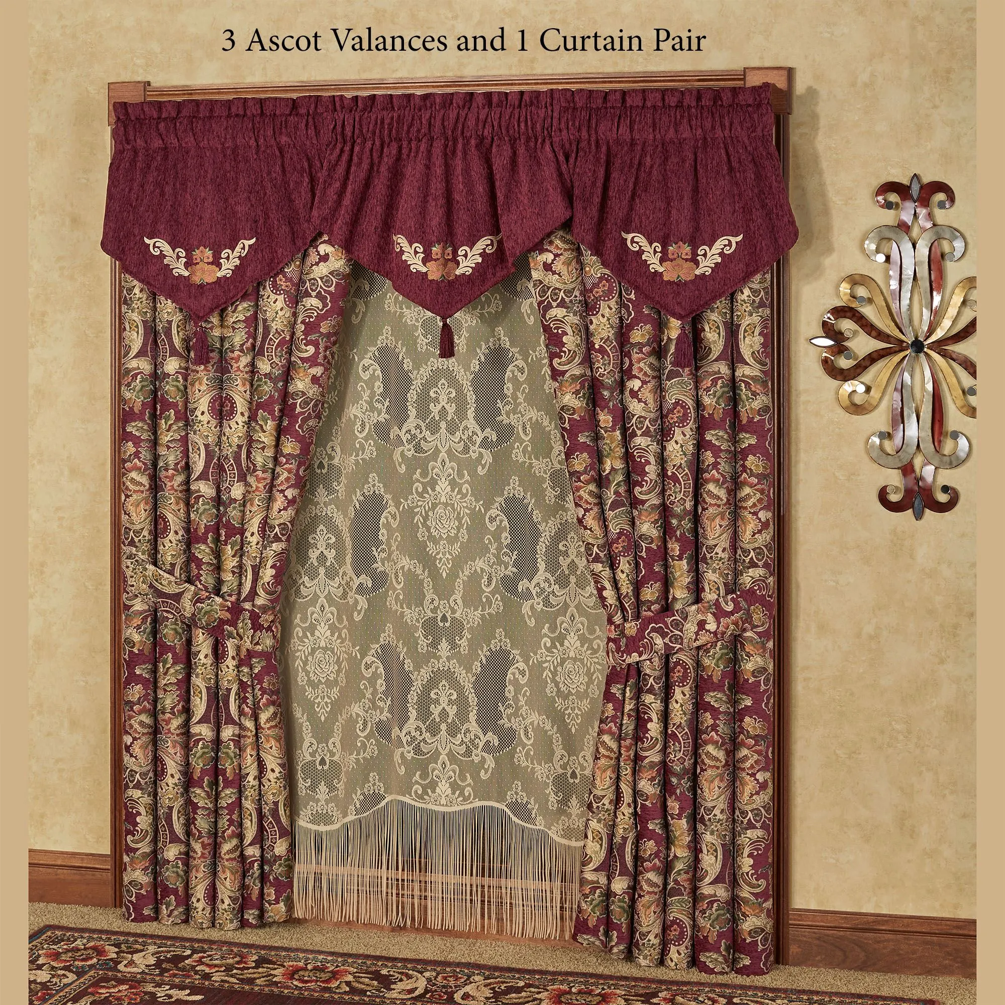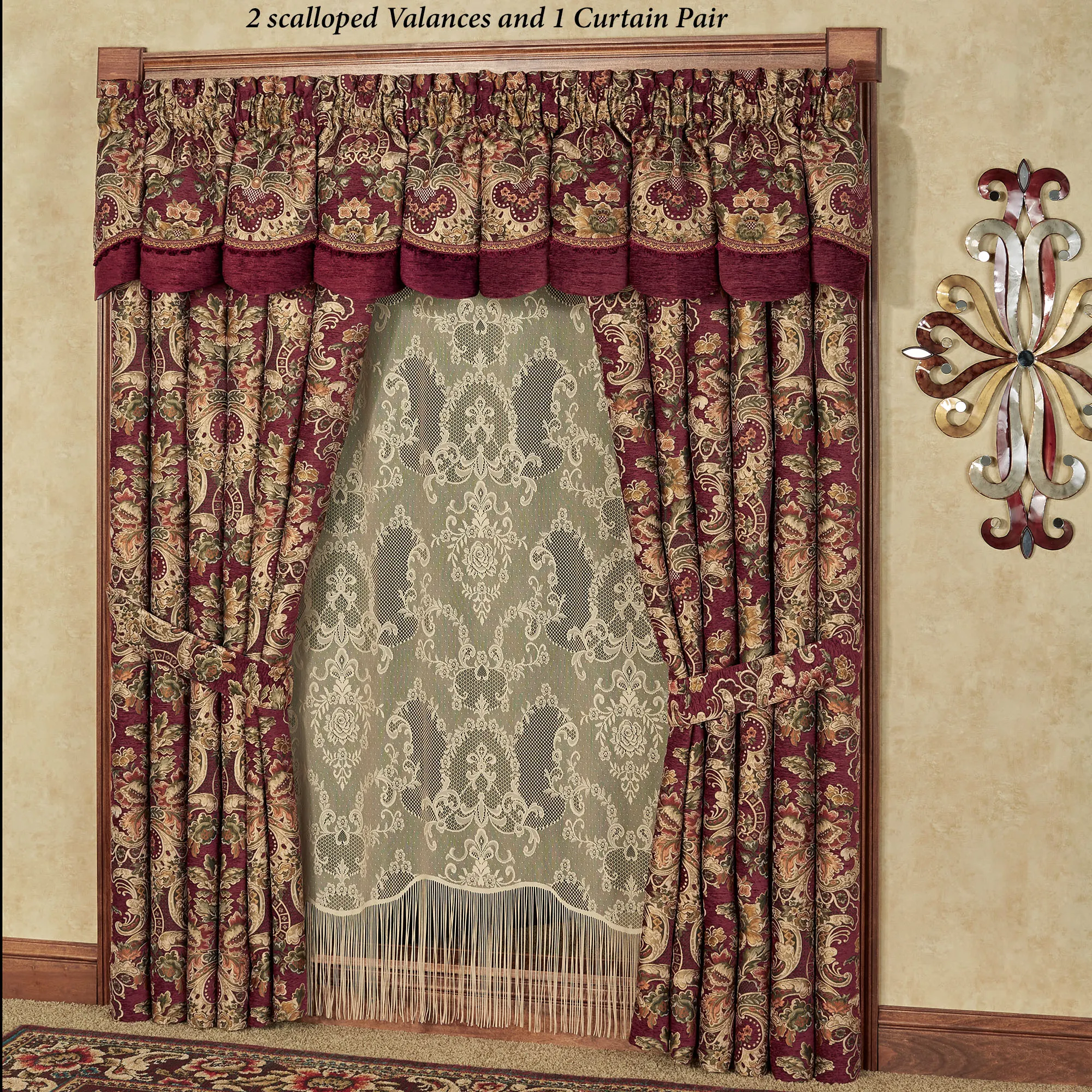 The lined Window Treatment has a 3" rod pocket. The tailored Wide Curtain Pair has the woven Jacobean pattern. Tiebacks are included. Curtains are available in two lengths. Each Ascot Valance is soft burgundy chenille with scroll embroidery and a tassel. Scalloped Valance has the woven Jacobean pattern, gimp trim, and soft burgundy chenille.