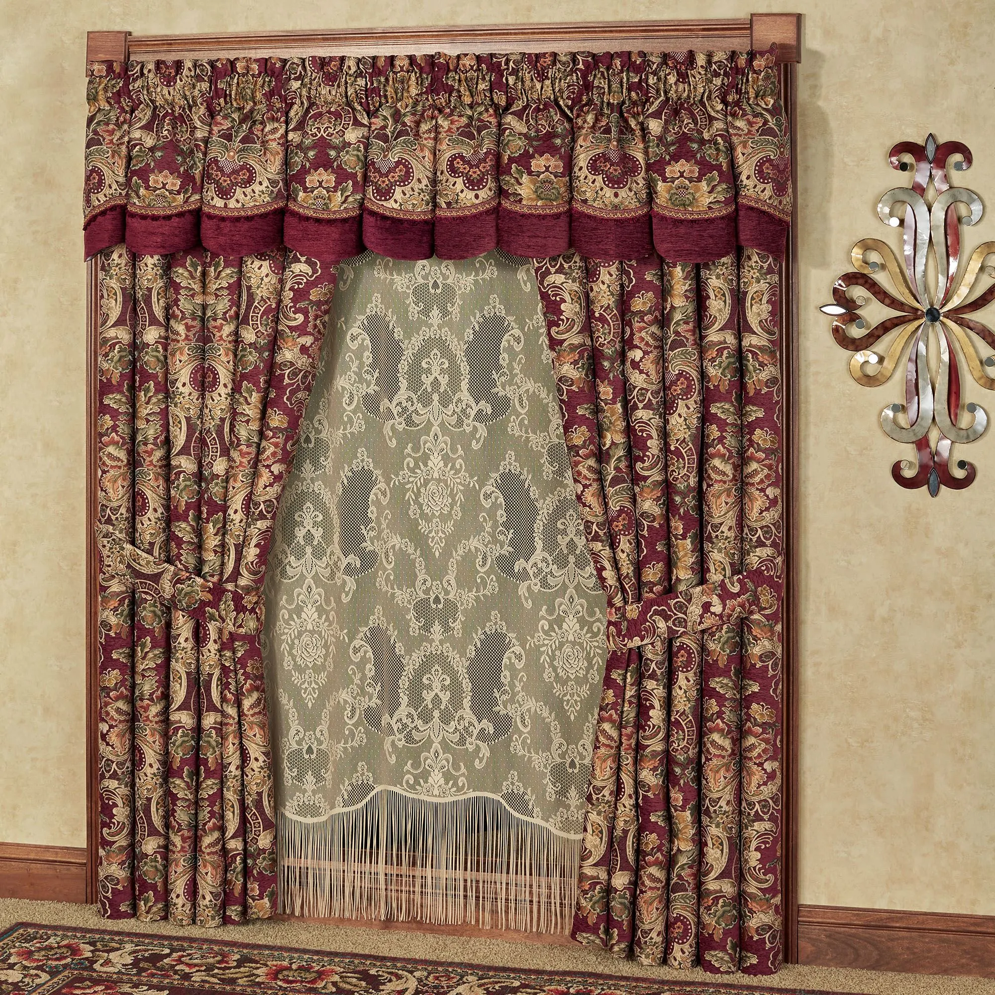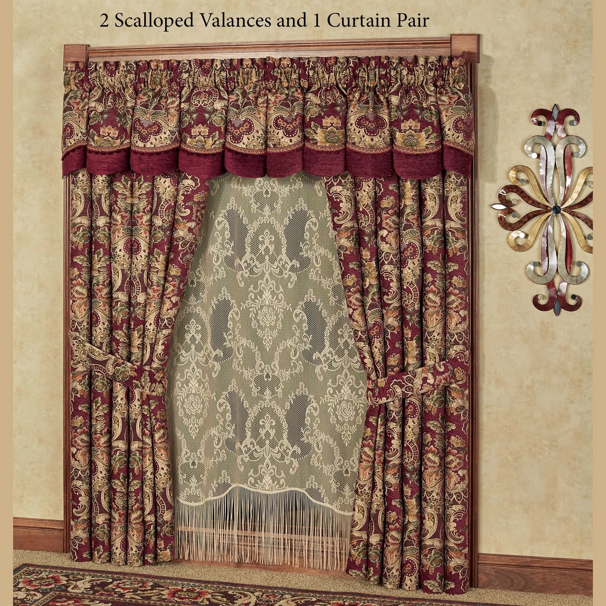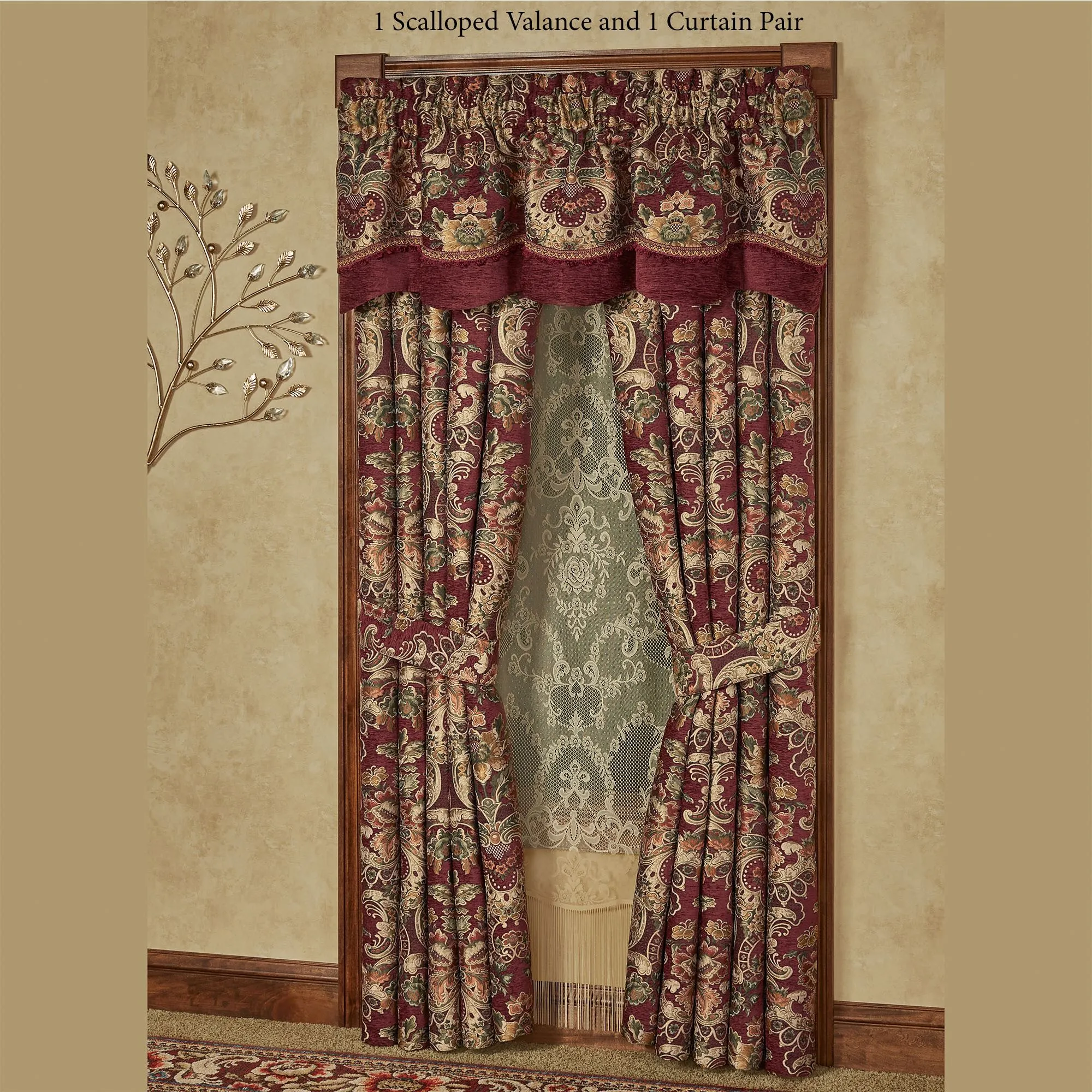 Regally inspired by beautiful Jacobean floral motifs, the Tosca Window Treatment blooms with lavish style. The polyester window treatment delights with woven blossoms in rich shades of green, orange, light gold, and warm vermillion on soft burgundy chenille. The lined window treatment has a 3" rod pocket. Specify Scalloped Valance or Wide Curtain Pair. The Scalloped Valance also has gimp trim and soft burgundy chenille on the bottom. The tailored Wide Curtain Pair includes tiebacks. Dry clean. Imported. The curtain pair width is the total width of two panels together.