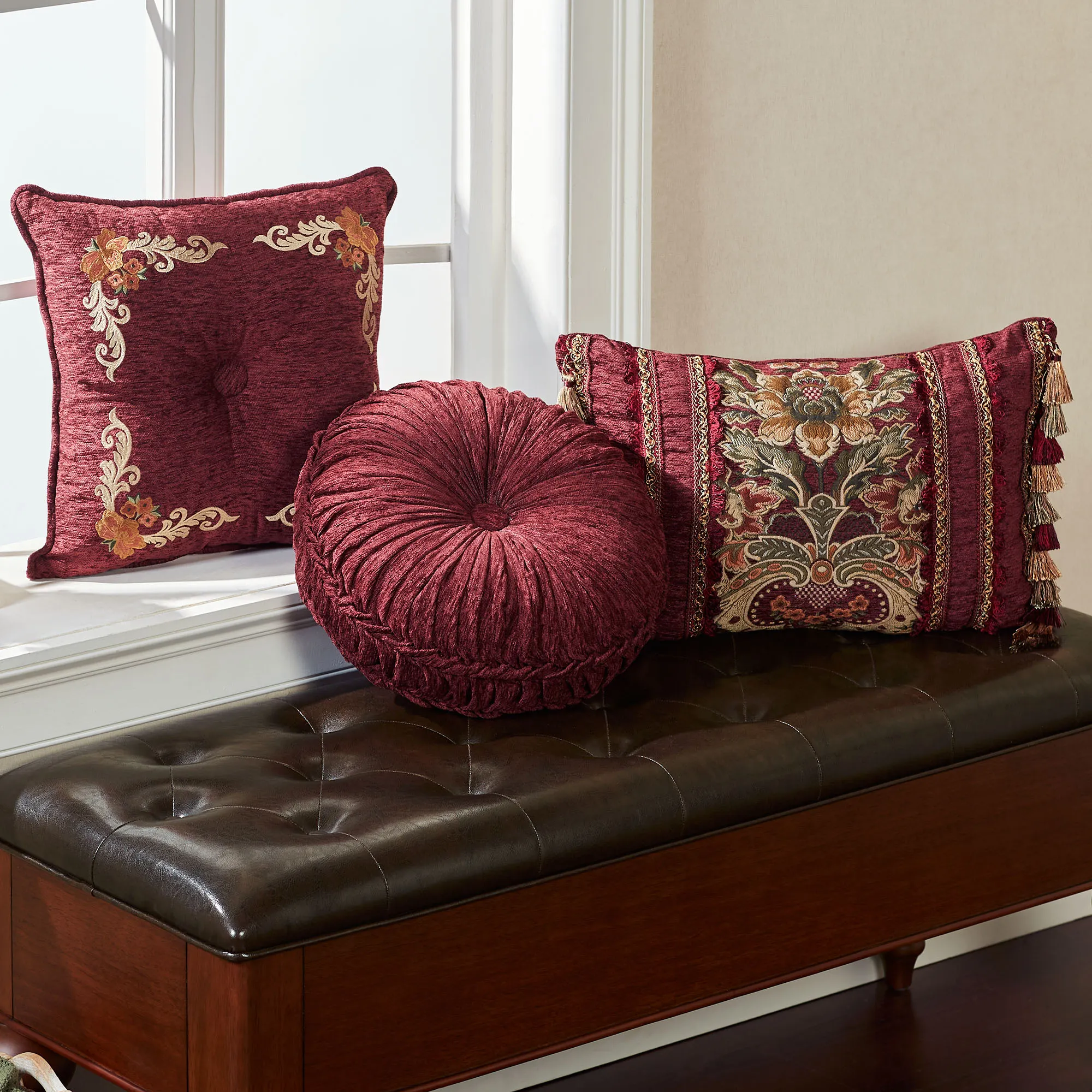 The regal Tosca Decorative Pillows adorn your room with lavish style. These polyester decorative pillows are soft burgundy chenille. The piped, tufted Square, 18", has scroll embroidery in green, gold, light gold, and warm vermillion; zipper closure. Rectangle, 15"x22", has a woven Jacobean floral pattern in green, orange, light gold, and warm vermillion; the pillow also has gimp trim and 3" tassel fringe. The handmade, reversible Round, 15", has pleats, a button tuft, and a 3" side gusset. Fill is polyester. Spot clean. Imported.