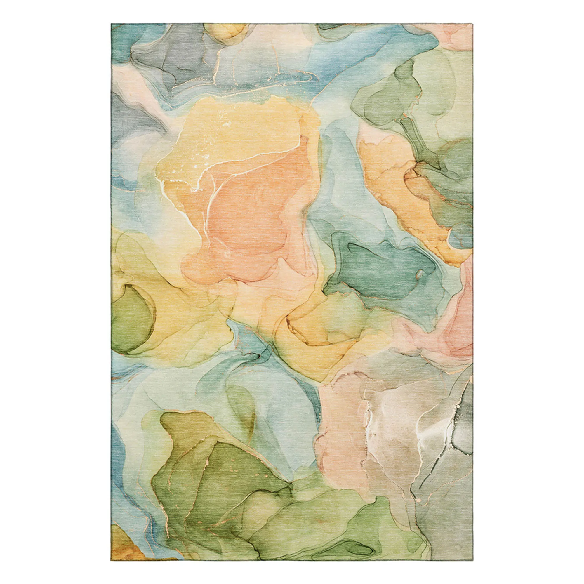 Prismatic pastel tones embellish your space with a Touch of Beauty. Power-loomed from polyester, the .39" thick plush rug features a printed tonal color palette that mimics the ebb and flow of alcohol ink or watercolor paint. Shades of blue, green, aloe, gold, peach, sky, gray, teal, and beige boldly fill the design. Backing is nonskid cotton canvas. The machine washable rug can be used in your indoor or covered outdoor space. Machine wash or spot clean and rinse with a garden hose. Imported/USA.