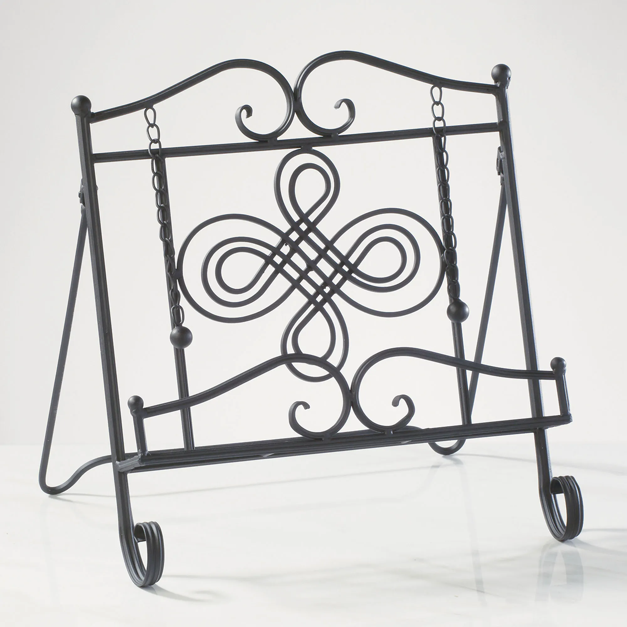 The Townsend Black Cookbook Stand is a quaint accent with an old-fashioned appeal, yet remains remarkably practical to anyone who spends some time in the kitchen. Handcrafted from wrought iron with a cloverleaf openwork scroll design, the cookbook stand is excellent as both a charming display piece and a convenient aid, featuring two weighted chains to hold open cookbook pages. With a handpainted finish, this cookbook holder is 13"Wx10"Dx13.5"H.