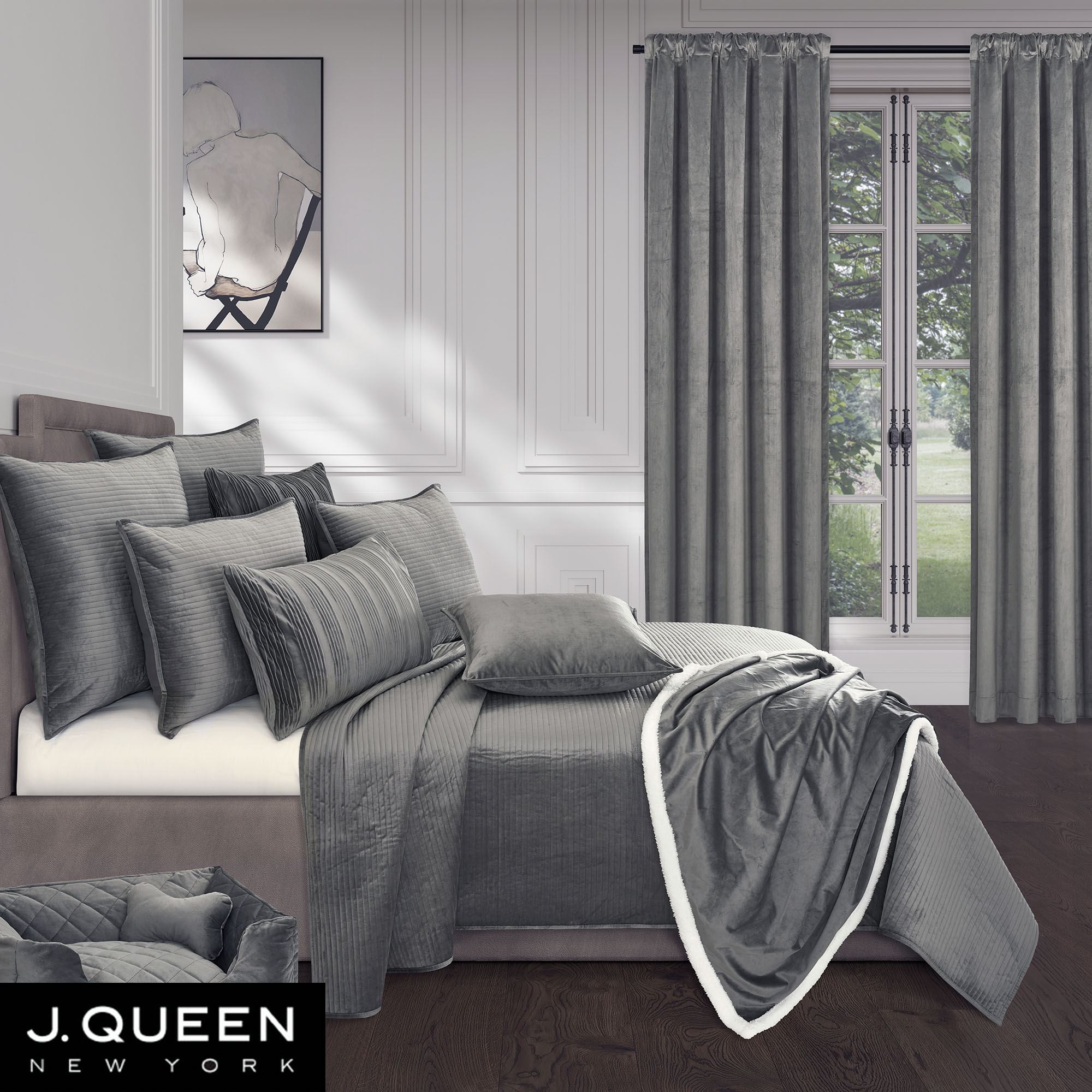 Update your bedroom with the chic Townsend Charcoal Velvet Bedding by J. Queen New York. The Quilt Set includes a quilt and two shams. This solid charcoal bedding is plush polyester velvet. The heavyweight quilt has channel quilting and a solid color backing. Fill is polyester. Dry clean. Imported. Sorry, some pillows shown on the bed are not available.