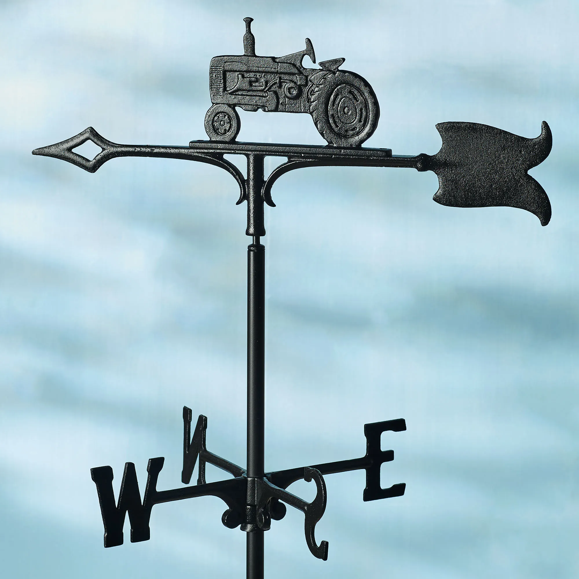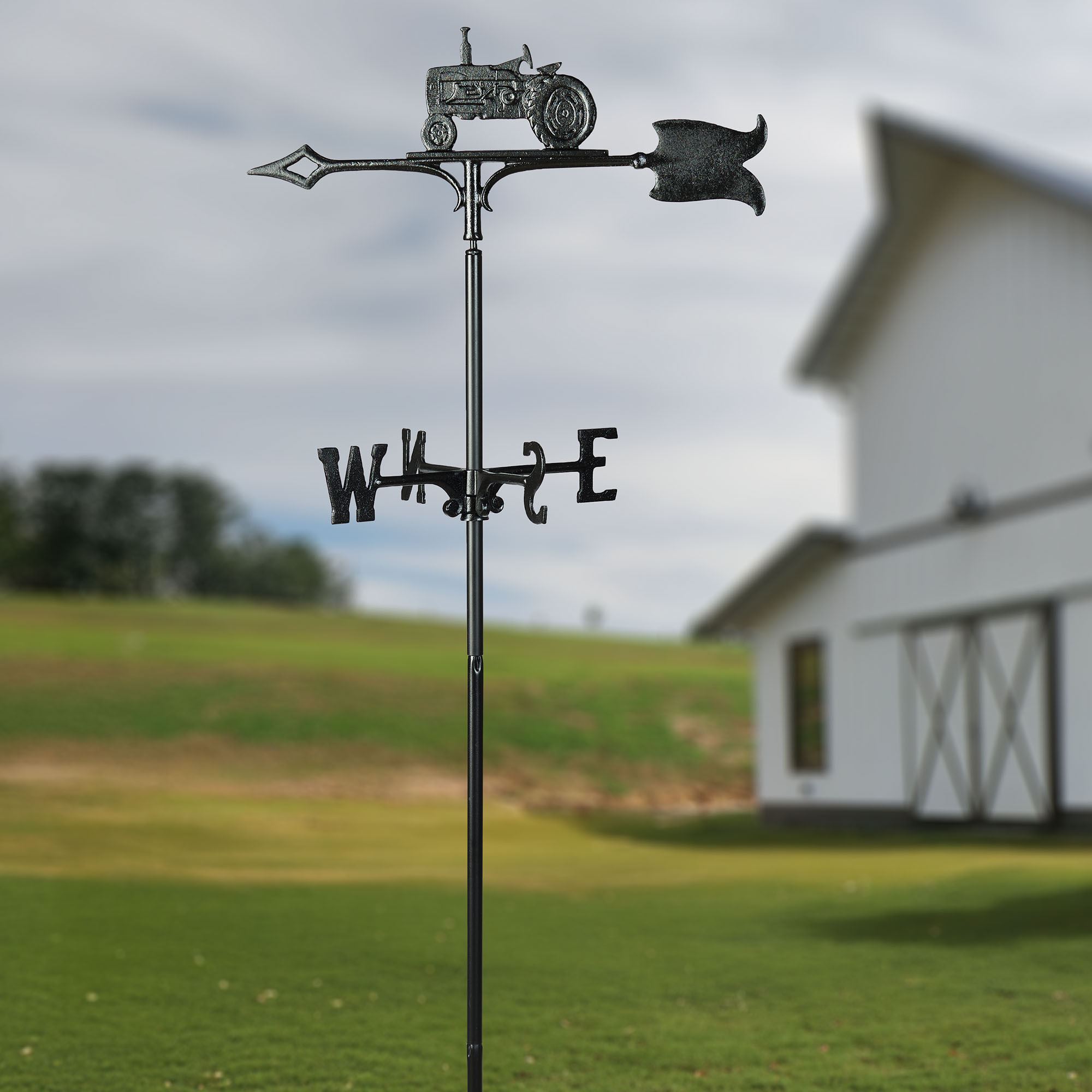 The Tractor Garden Weathervane Stake keeps an eye on the wind while adding a touch of charm. Finished in classic black, the aluminum design features bold "N," "E," "S," and "W" indicators below the spinning arrow and detailed, stamped decorative design. Overall, the arrow itself measures 23.5"Wx4.5"H. A classic tractor tops the vane. The tractor accent measures 6"Wx8"H; the weathervane measures 63"H overall. The staked weathervane can be driven into the ground to your desired height and is perfect outdoors year round. USA/Imported.