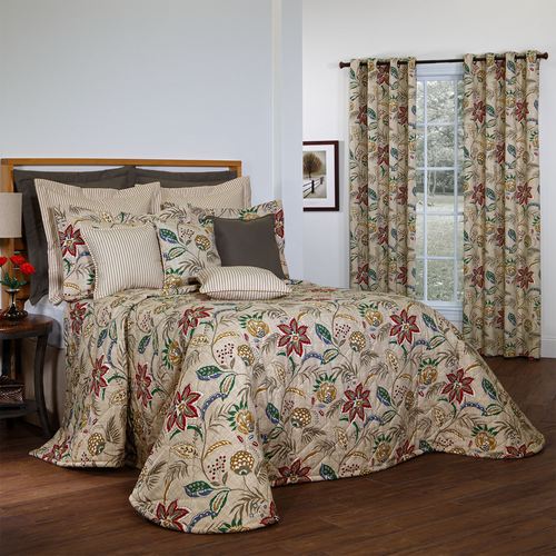 Florals, scrolling vines, and leaves decorate the Tradewinds II Bedspread with rustic style. The throw-style, woven cotton bedspread features a printed design in shades of green, gold, warm brown, mineral, ivory, blue, and red on a mingled light brown/off-white background. The bedspread also has diamond quilting, bottom bell corners, jumbo piping, an approx. 21" drop, and an off-white cotton/polyester backing. Fill is polyester. Dry clean.