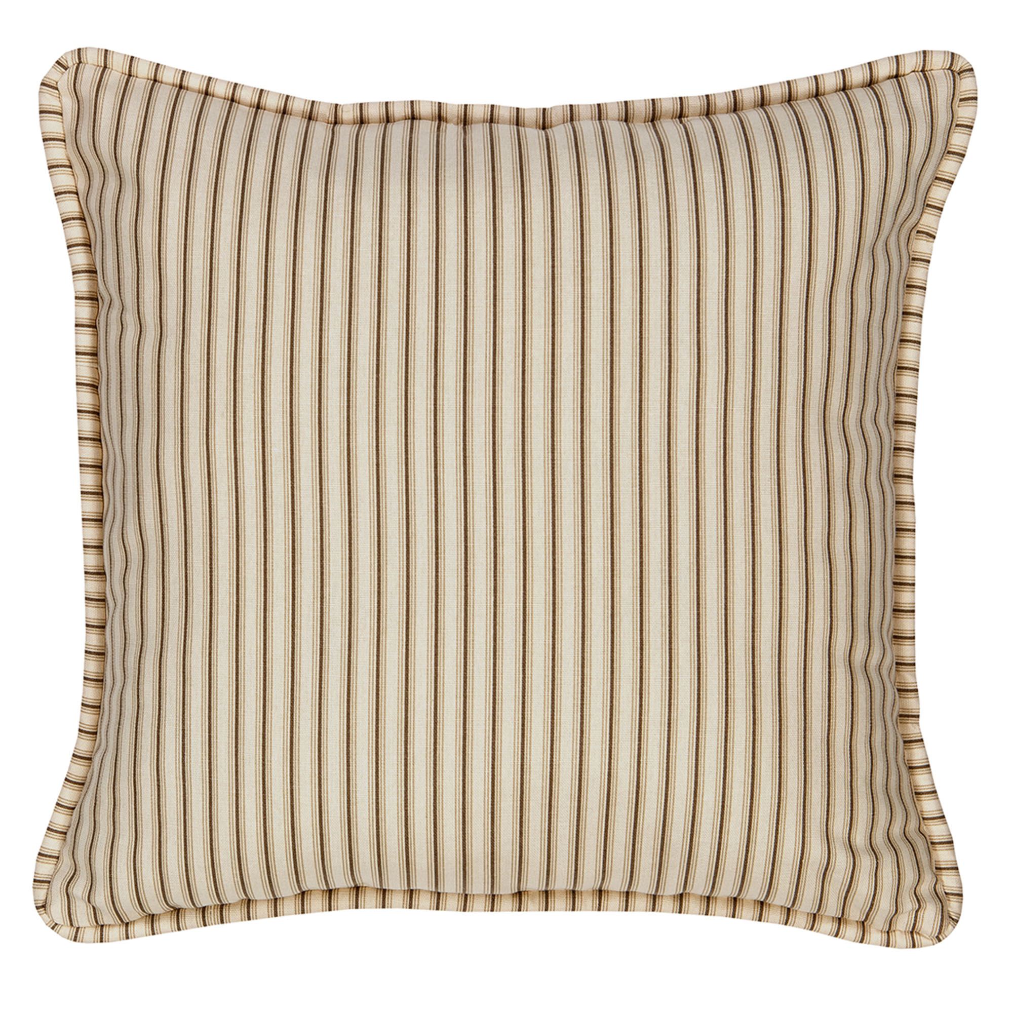 The flanged Striped European Sham has printed stripes in ecru and chocolate and a French back closure.