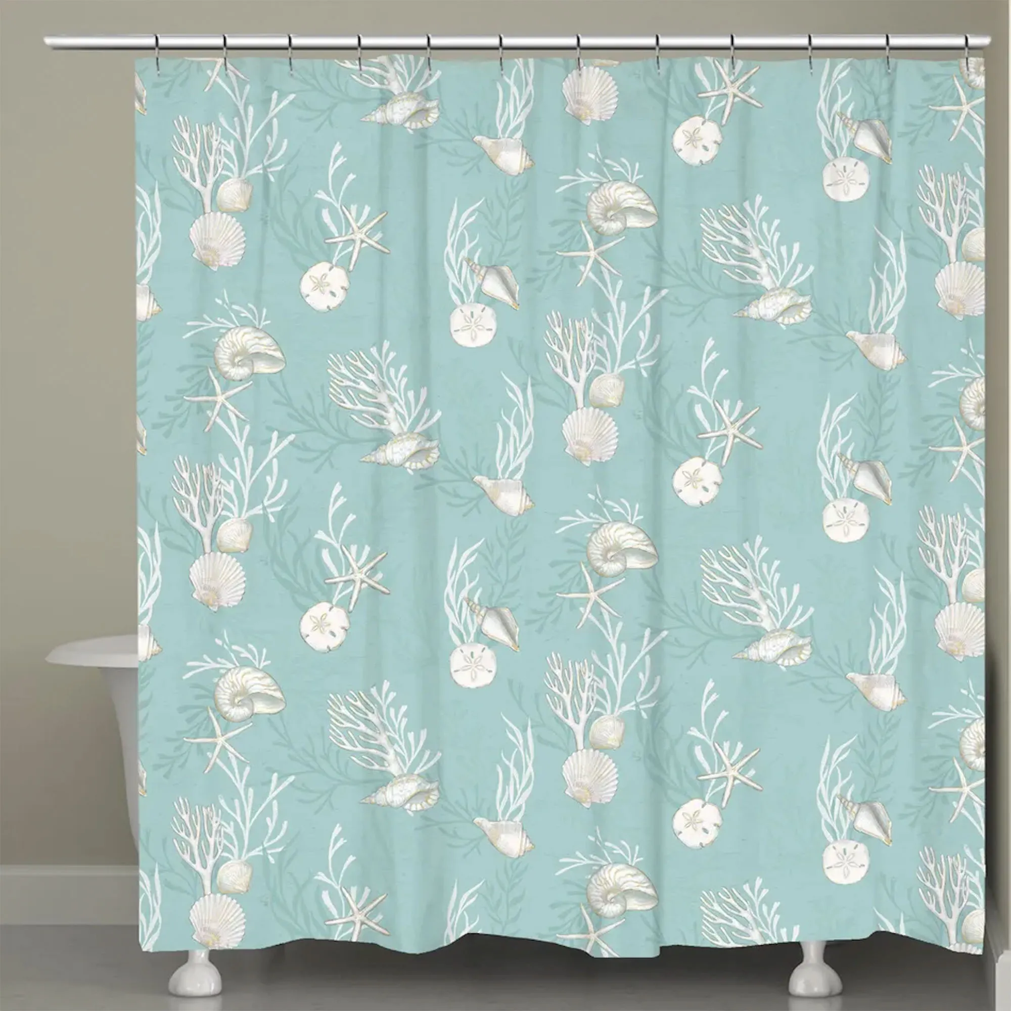 Dive into your daily routine and create a Tranquil Morning with this coastal shower curtain. With artwork by Janelle Penner presented by Laural Home(R), the printed polyester shower curtain features scattered coral, seaweed, starfish, scallop seashells, nautilus, sand dollars, and conch shells. The iconic beach sights have ivory, gray, and natural neutral tones that pop from the aqua ground. The easy-care shower curtain offers a quick-dry, water-repellent design that resists wrinkling and fading. We recommend the use of a waterproof liner. Measures 71"Wx72"L. Machine washable. USA/Imported.