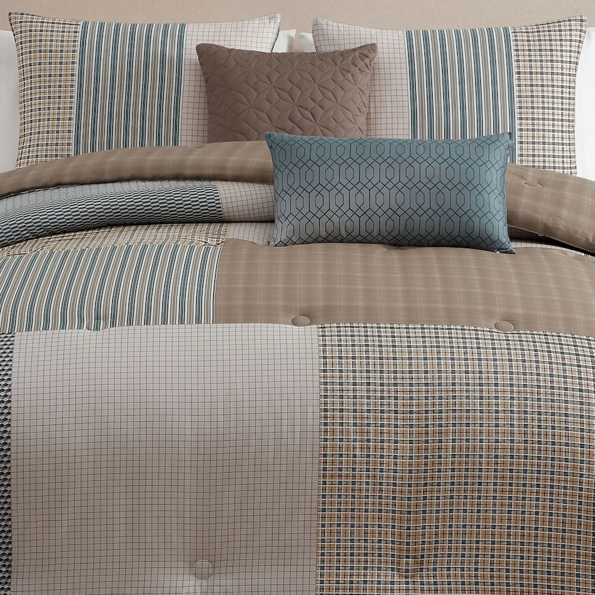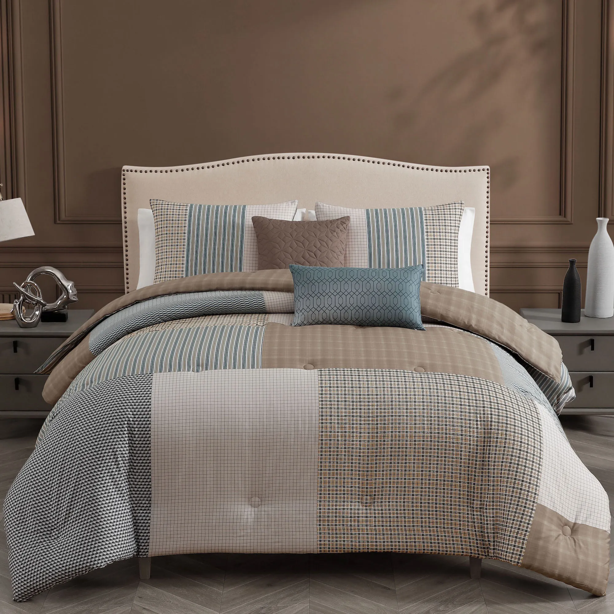Tranquil Patch Reversible Light Brown and Blue Plaid Color Block 5 pc Comforter Bed Set