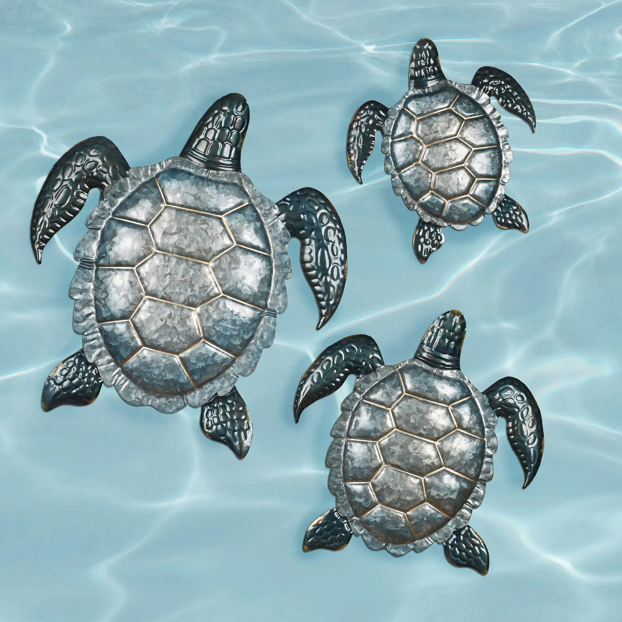 Bring a relaxing day at the beach to your home with the Tranquil Sea Turtle Wall Art Set. Pressed metal accents have gray tones with gold accents and a blue wash. The highly polished head and flippers contrast nicely with the galvanized shell. The unique nanometer paint and powder-coat finish resist fading and rust. Indoor/outdoor year-round use. Small is 10.5"Wx1"Dx11.5"H. Medium is 13.5"Wx1"Dx14.5"H. Large is 17"Wx1.5"Dx18.5"H.