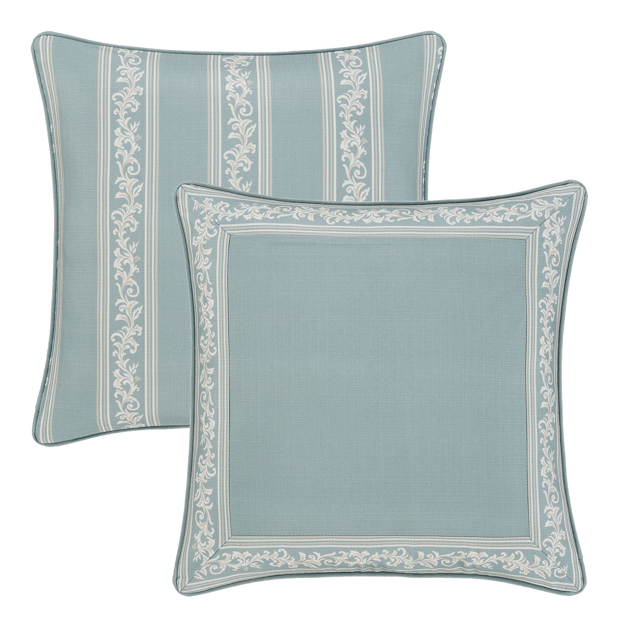 The piped European Sham has a pieced, woven slubbed aqua center, mitred corners, damask and stripe designs, and a zipper closure; reverses to vertical stripe and damask designs.