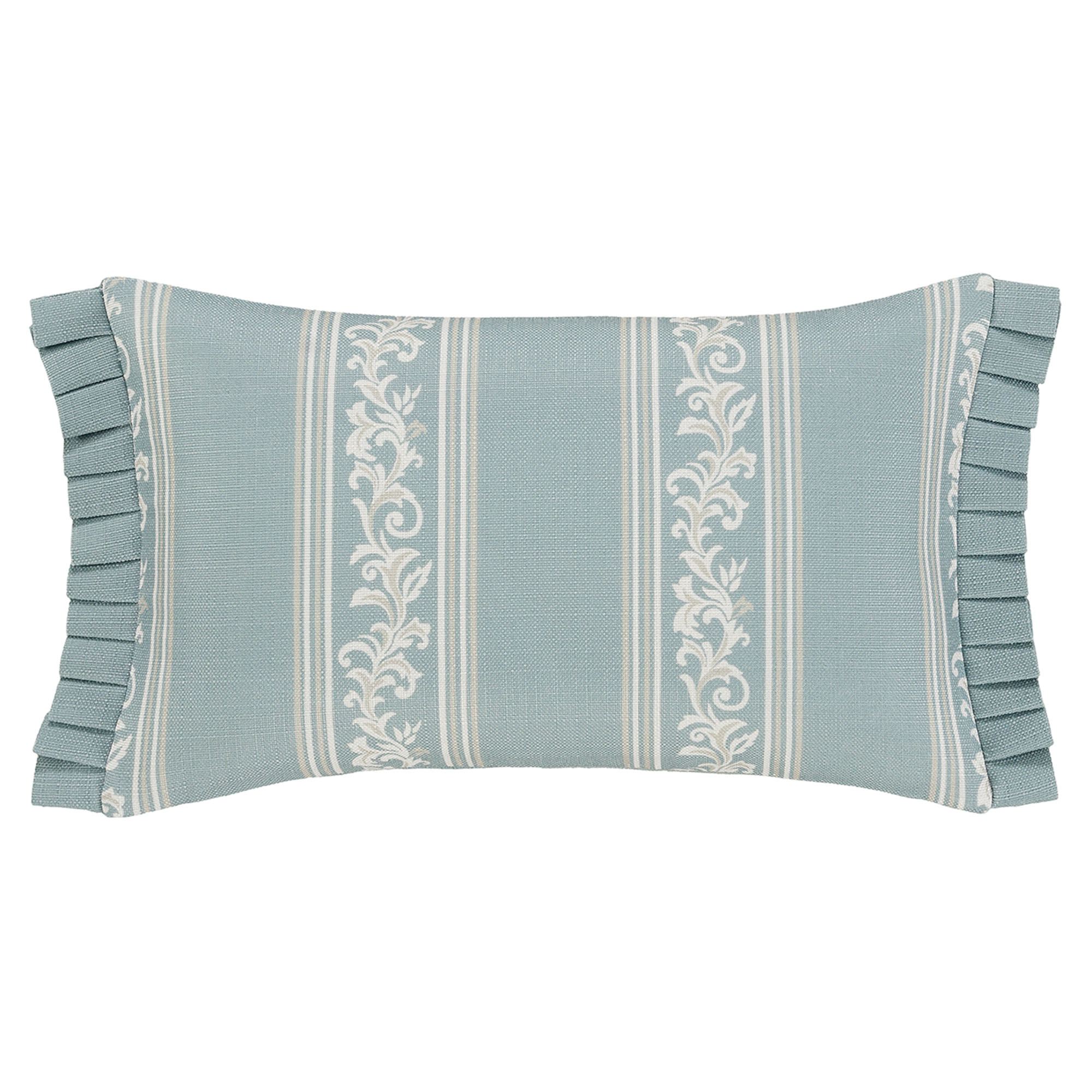 Pillows: Spot clean. The piped 18" Square has embroidered quatrefoil designs. The piped 20" Square has grand damask designs and reverses to vertical damask and stripe designs. The Rectangle has vertical damask and stripe designs and a pleated flange on the length ends.