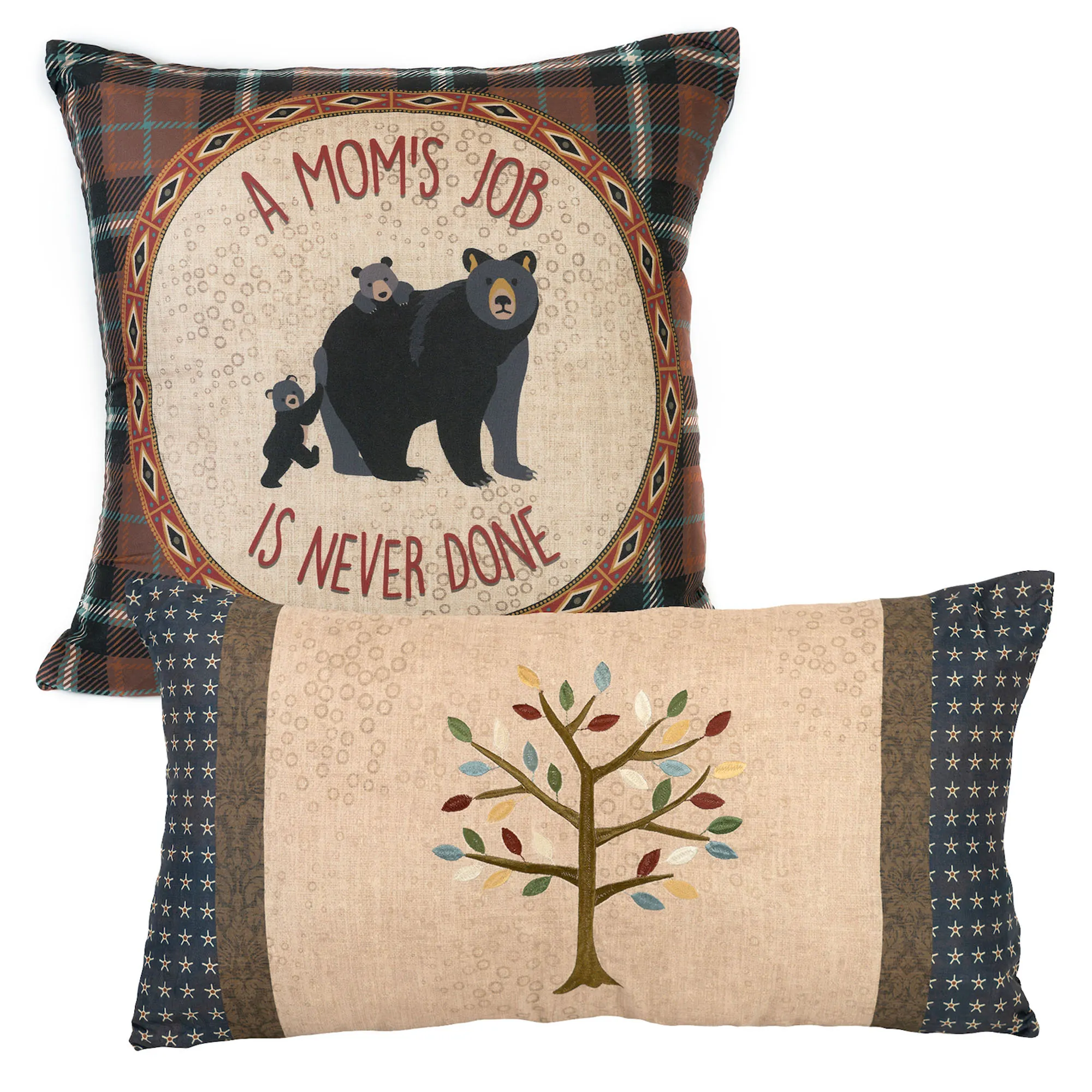 The Pillow Set of Two includes one square pillow and one rectangle pillow. The pillows are reversible and have tailored edges. Square pillow is plaid with a center circle reading "A Mom's Job Is Never Done" alongside a black bear mom and two cubs. Rectangle pillow has a beige center with a coordinating embroidered tree with colorful leaves; brown damask bands and blue star ends complete the look. Spot clean the pillows.