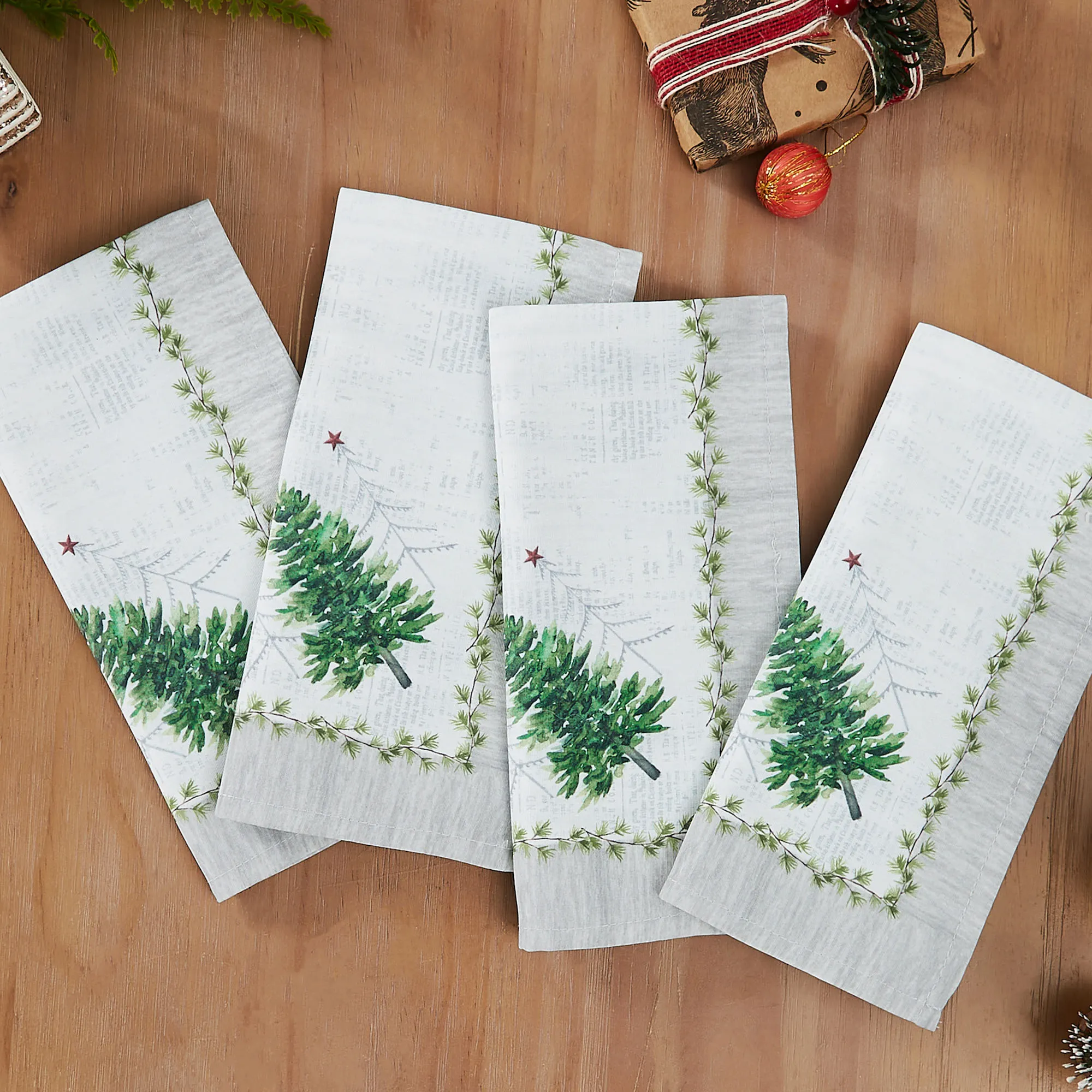 Don't forget to decorate your table with the festive Trees Table Linens. These polyester Christmas table accessories have printed tree and star designs and a printed background. Colors include shades of green, gold, ivory, and gray. Choose Oblong Tablecloth, Table Runner, Placemat Set of 4, or Napkin Set of 4. Machine washable. Imported.