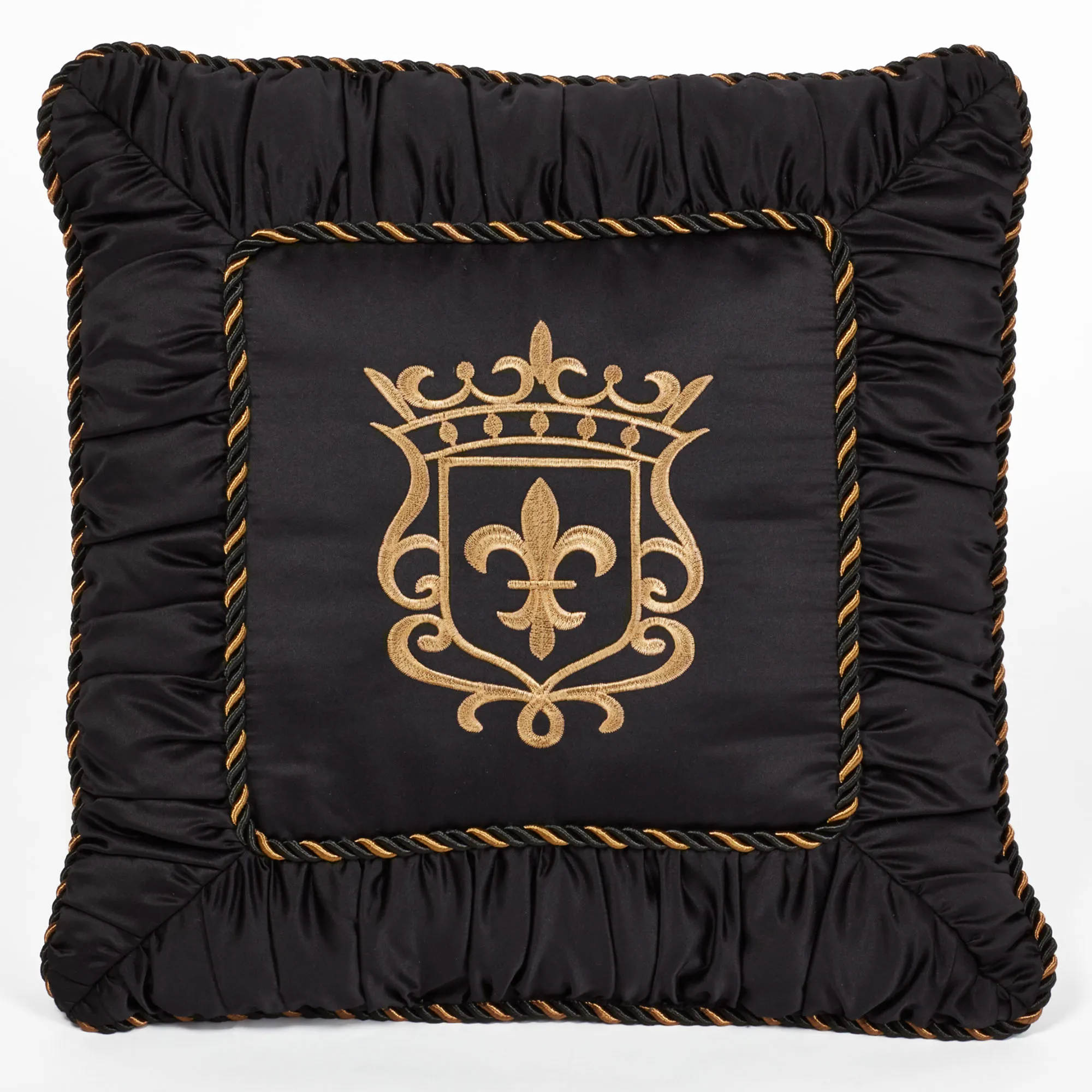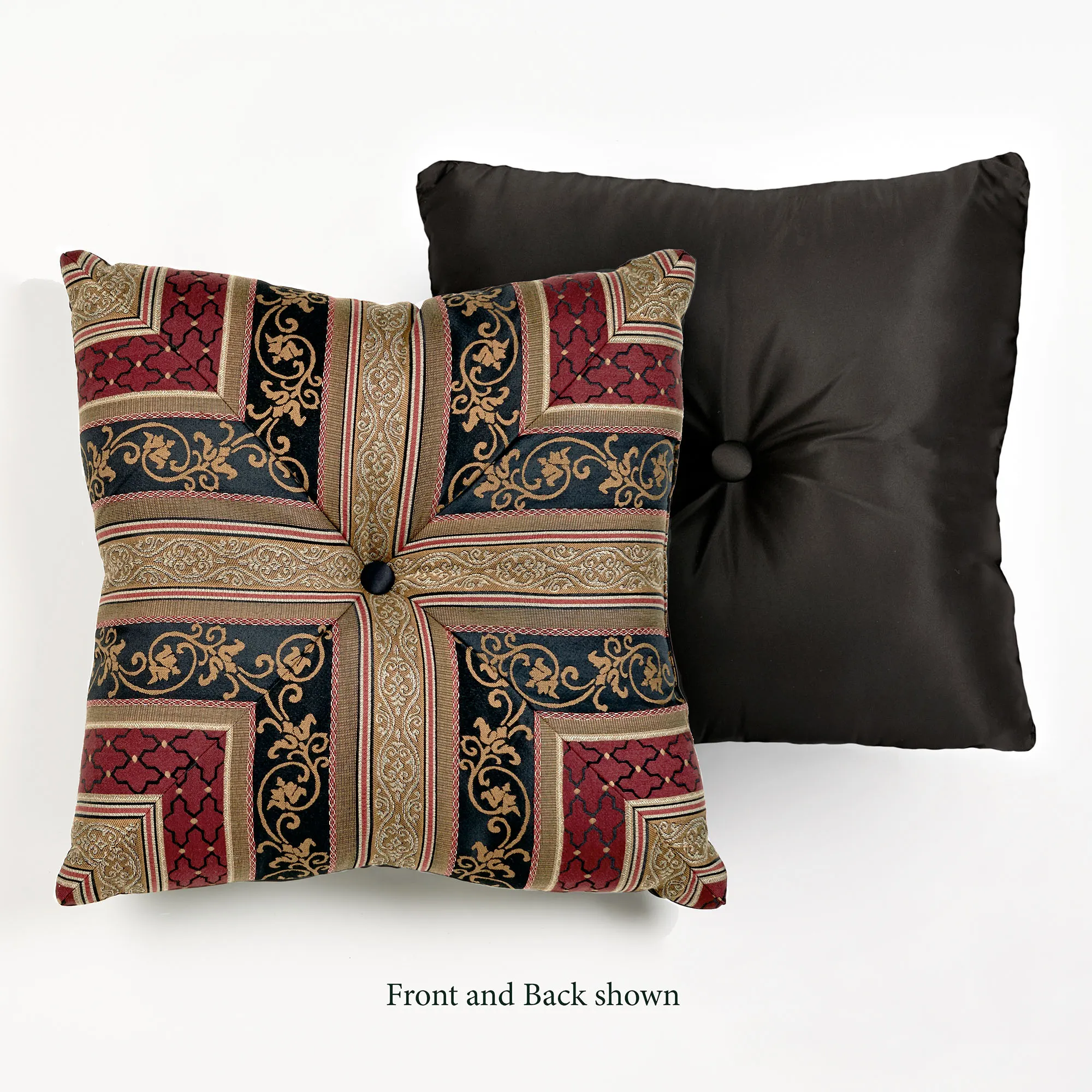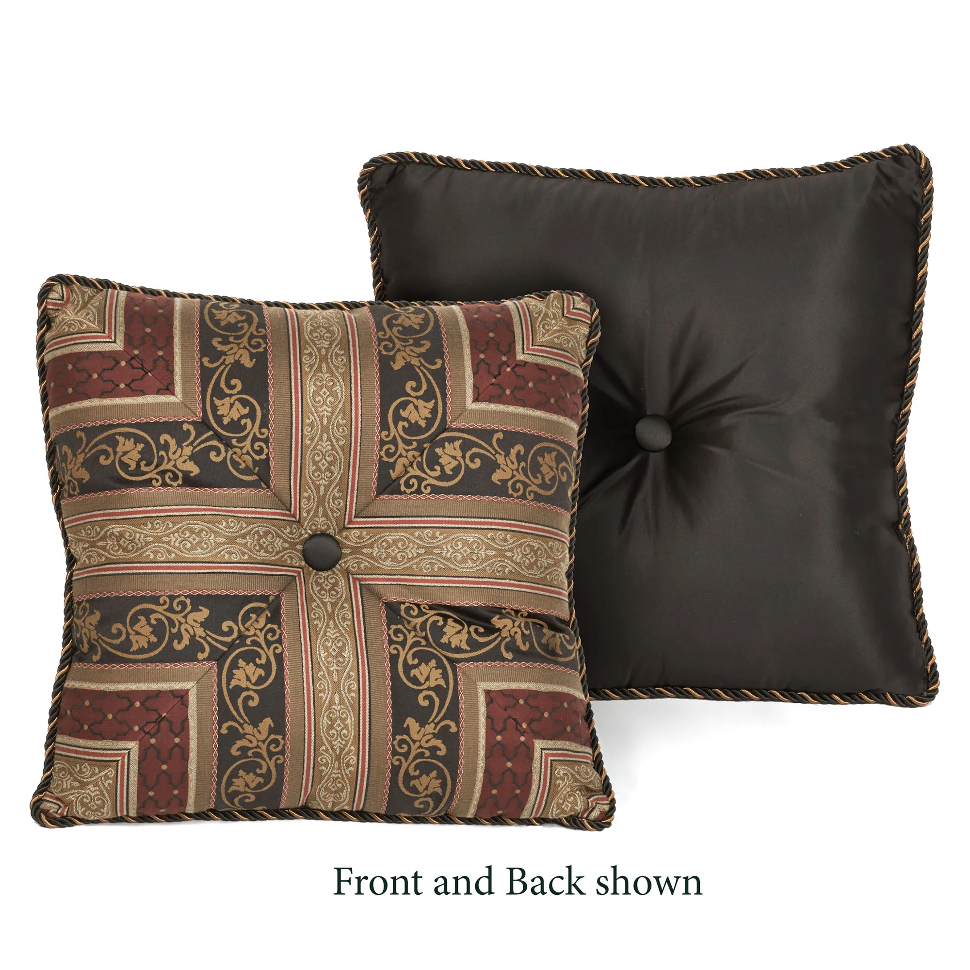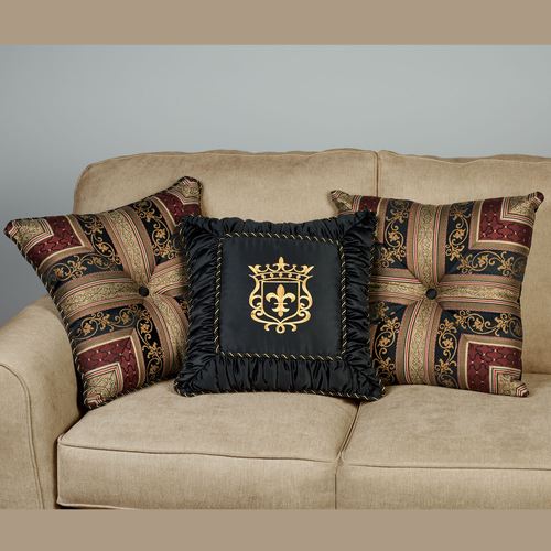 The polyester Triomphe Decorative Pillows have a refined Old World style. The black Embroidered Square Pillow, 18", has an embroidered gold crest and twist cording; outer edges are shirred. The pieced, mitred Tailored Square Pillow, 20", has a stripe pattern, scrolling leaves, geometrics, and a button tuft; back is black. The pieced, mitred Corded Square Pillow, 20", has a stripe pattern, scrolling leaves, geometrics, a button tuft, and cording; back is black. The stripe pattern includes rich colors of burgundy, gold, black, ivory, taupe, and ember glow. Fill is polyester. Spot clean. Imported.