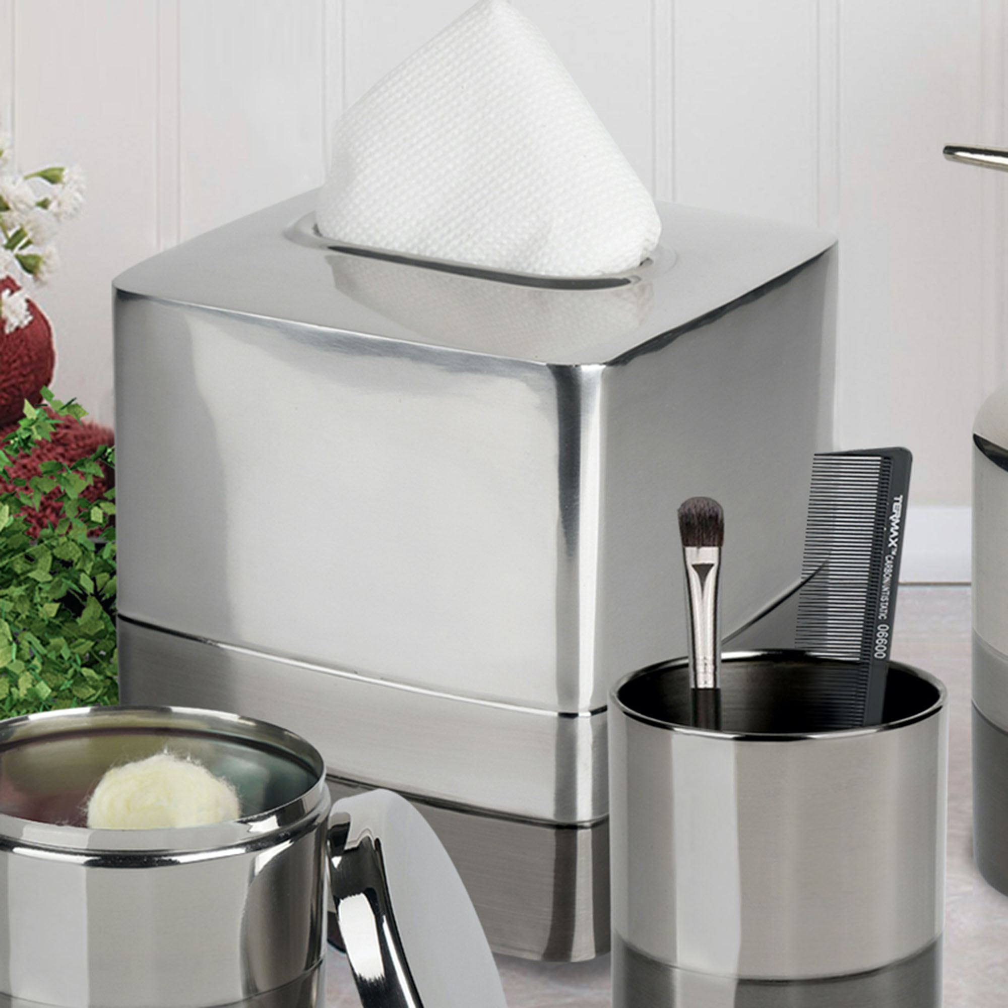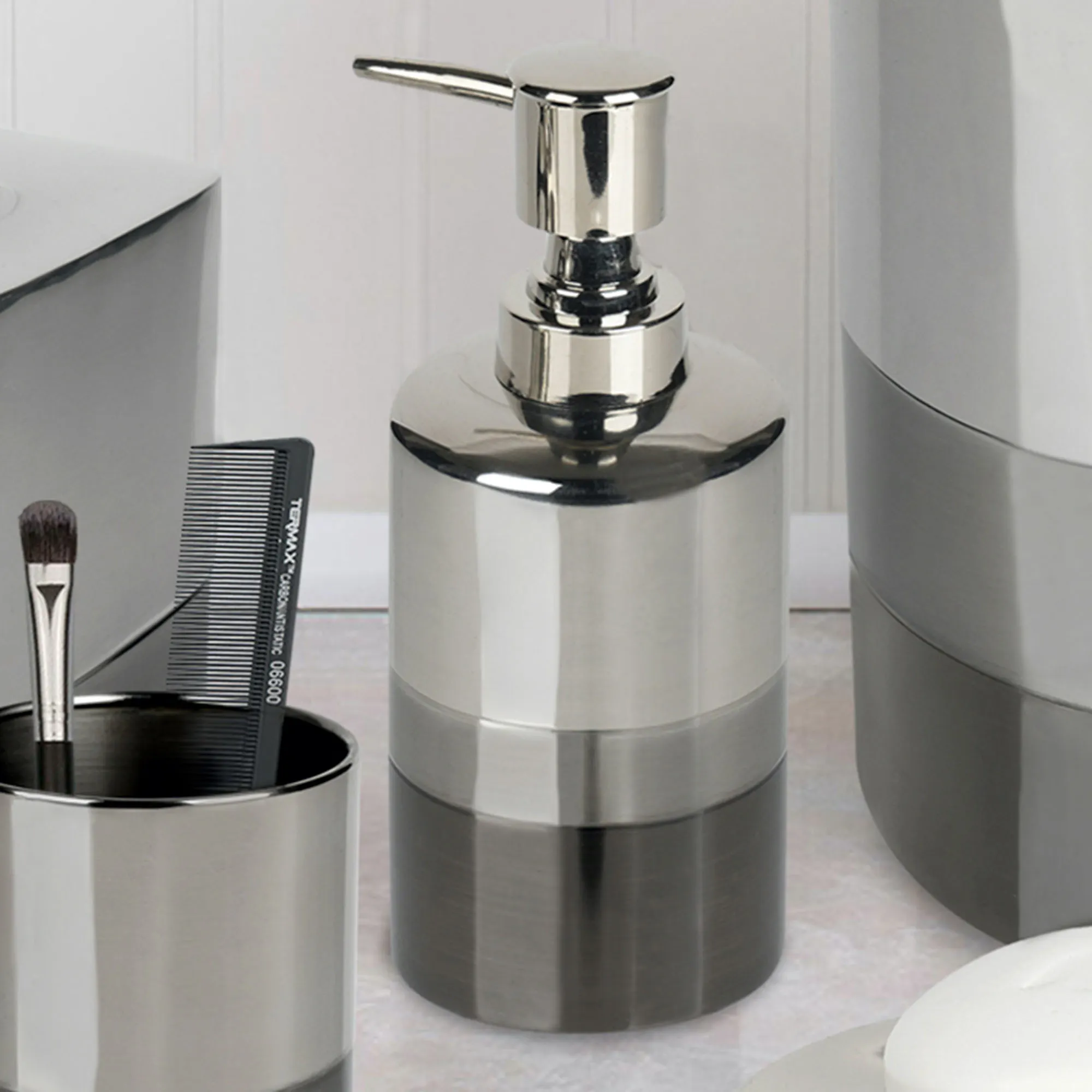 The Triune Metal Bath Accessories fill a space with a high-class, sleek shine. Crafted from horizontal bands, these metal designs feature gray, dark gray, and charcoal hues with a glossy sheen. Specify Lotion/Soap Dispenser, Tissue Cover, Wastebasket, Soap Dish, Toothbrush Holder, Tumbler, or Covered Jar.