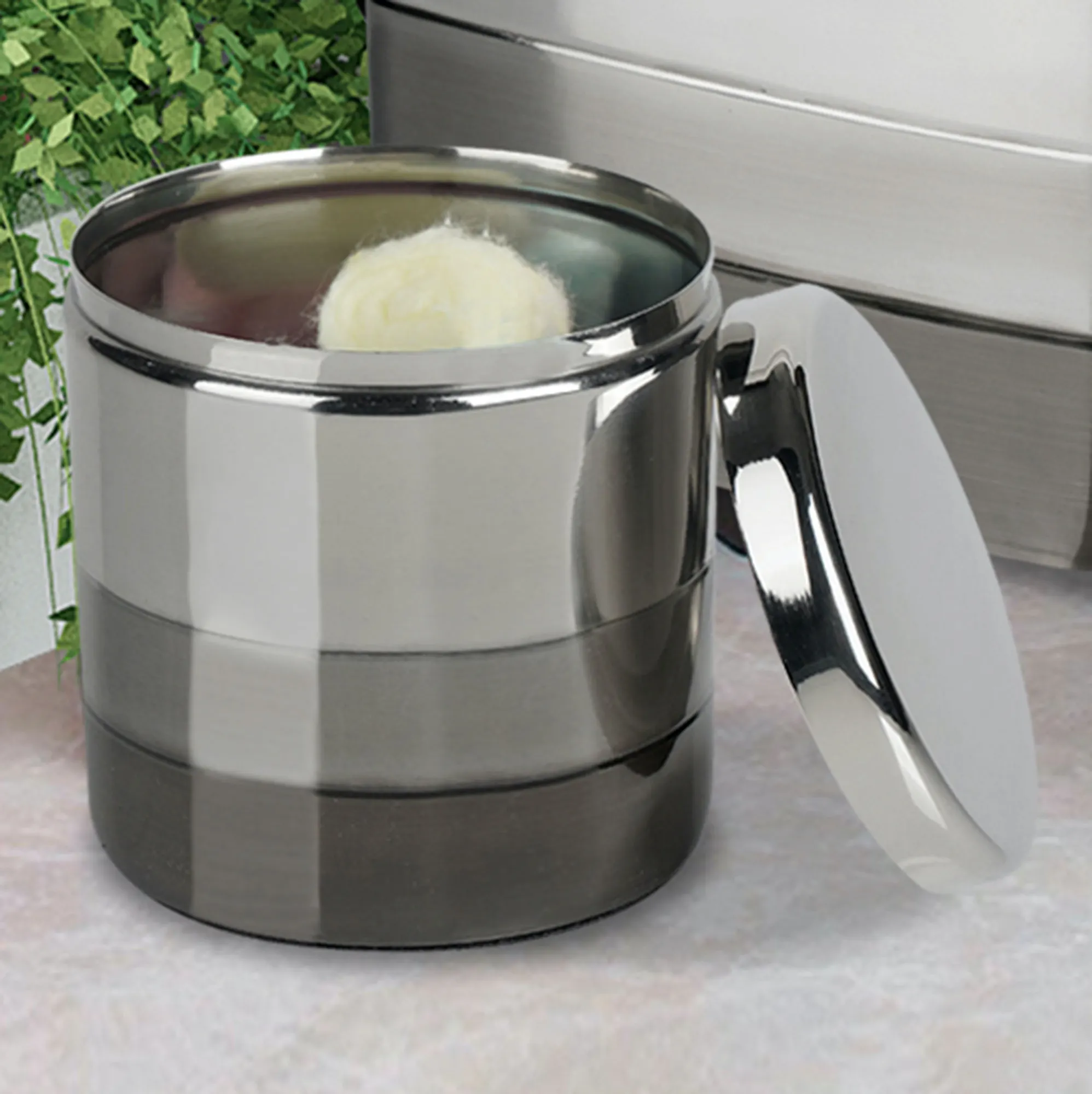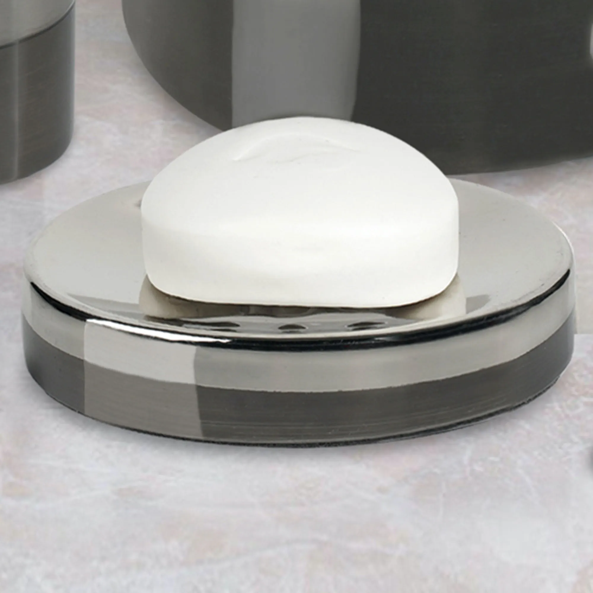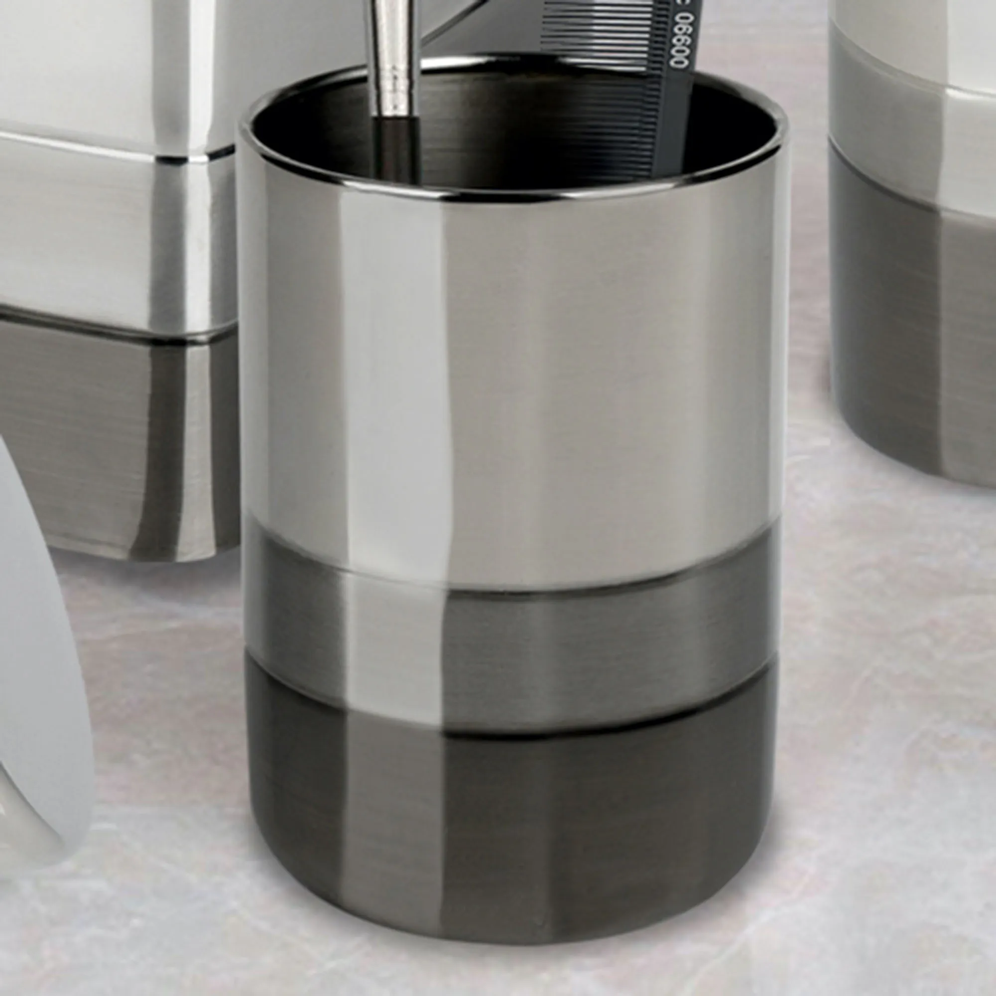 The Triune Metal Bath Accessories fill a space with a high-class, sleek shine. Crafted from horizontal bands, these metal designs feature gray, dark gray, and charcoal hues with a glossy sheen. Specify Lotion/Soap Dispenser, Tissue Cover, Wastebasket, Soap Dish, Toothbrush Holder, Tumbler, or Covered Jar.