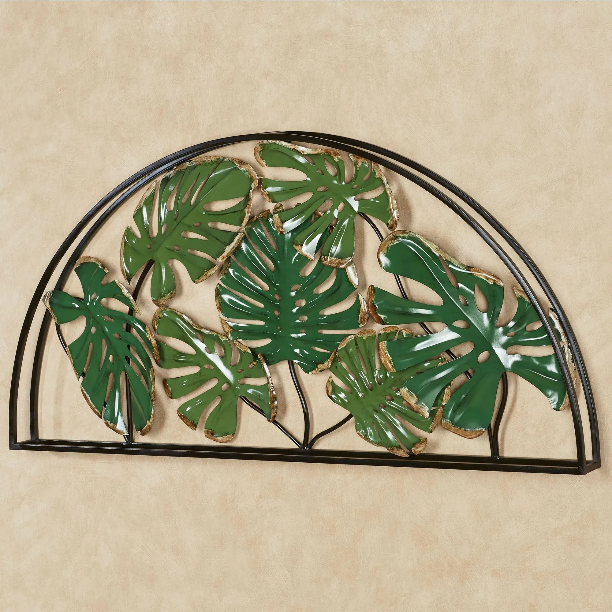 The Tropic Monstera Arched Wall Art offers a glimpse of tropical paradise. In an openwork black frame with bronze highlights, the dimensional metal wall art features vining monstera leaves in vibrant green hues with golden tips. Measures 41"Wx2.5"Dx21"H.