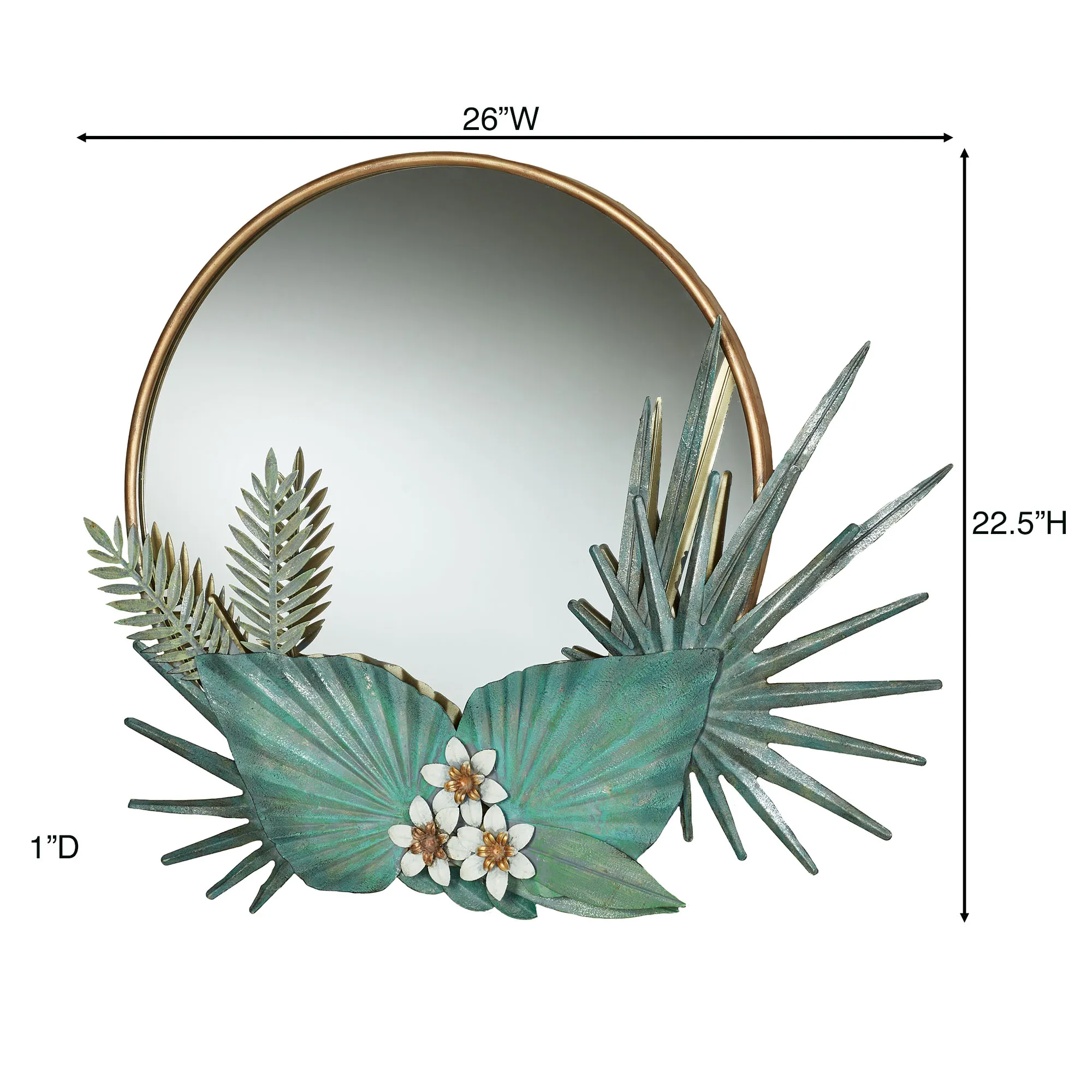 Palm leaves, fern fronds, and flowers are welcoming Tropic Reflections. This metal wall mirror has a central 19" dia. glass mirror and various textured leaves and flower designs. Colors include handpainted shades of green, gold, and ivory. Measures 26"Wx1"Dx22.5"H.