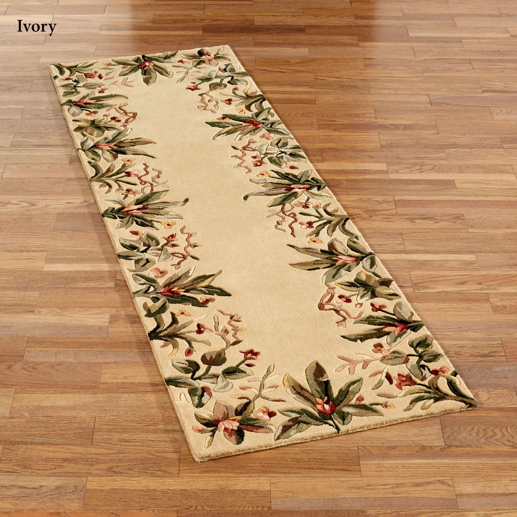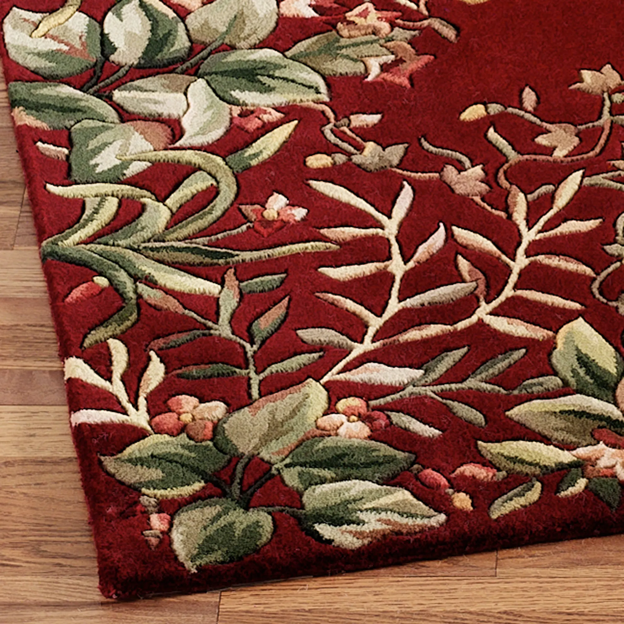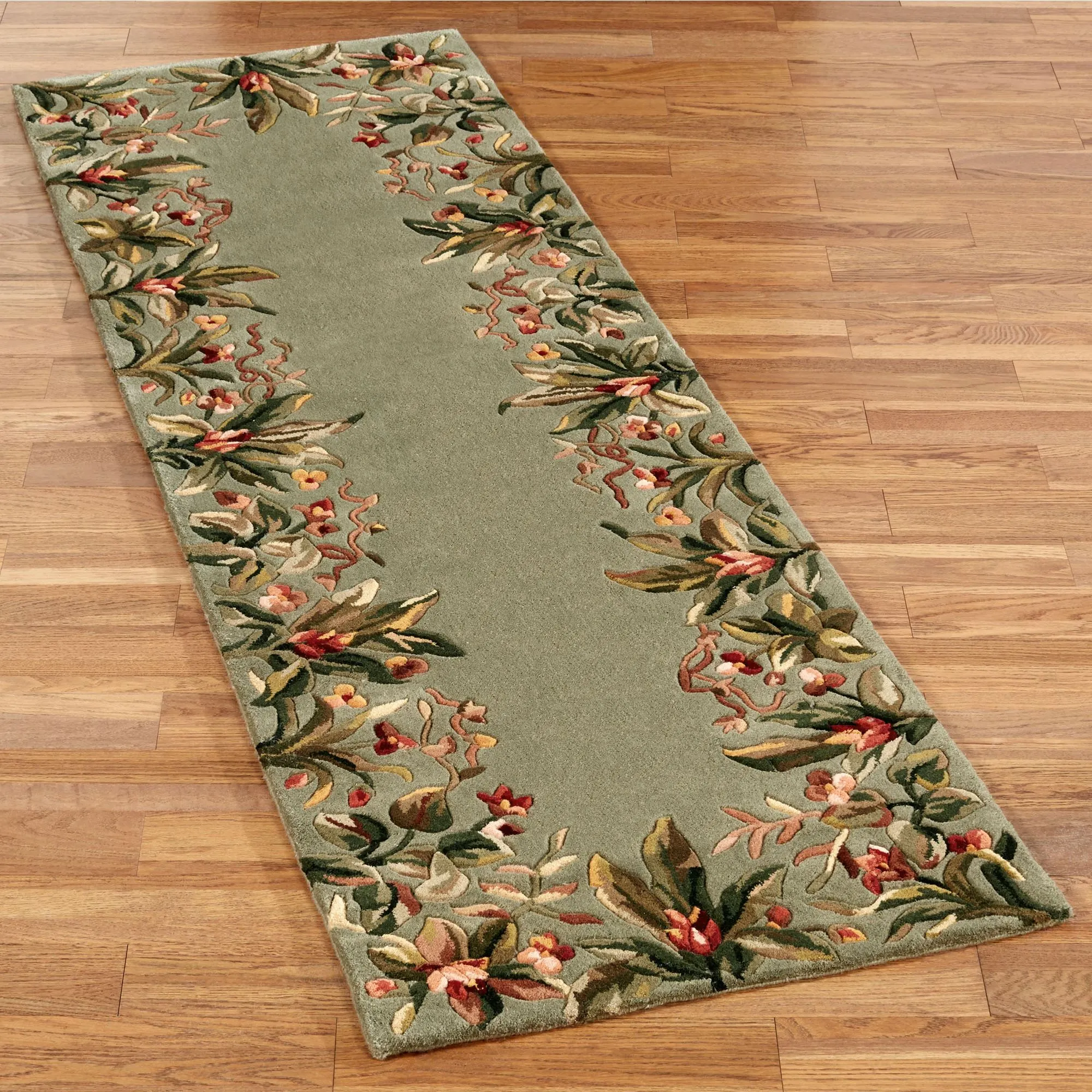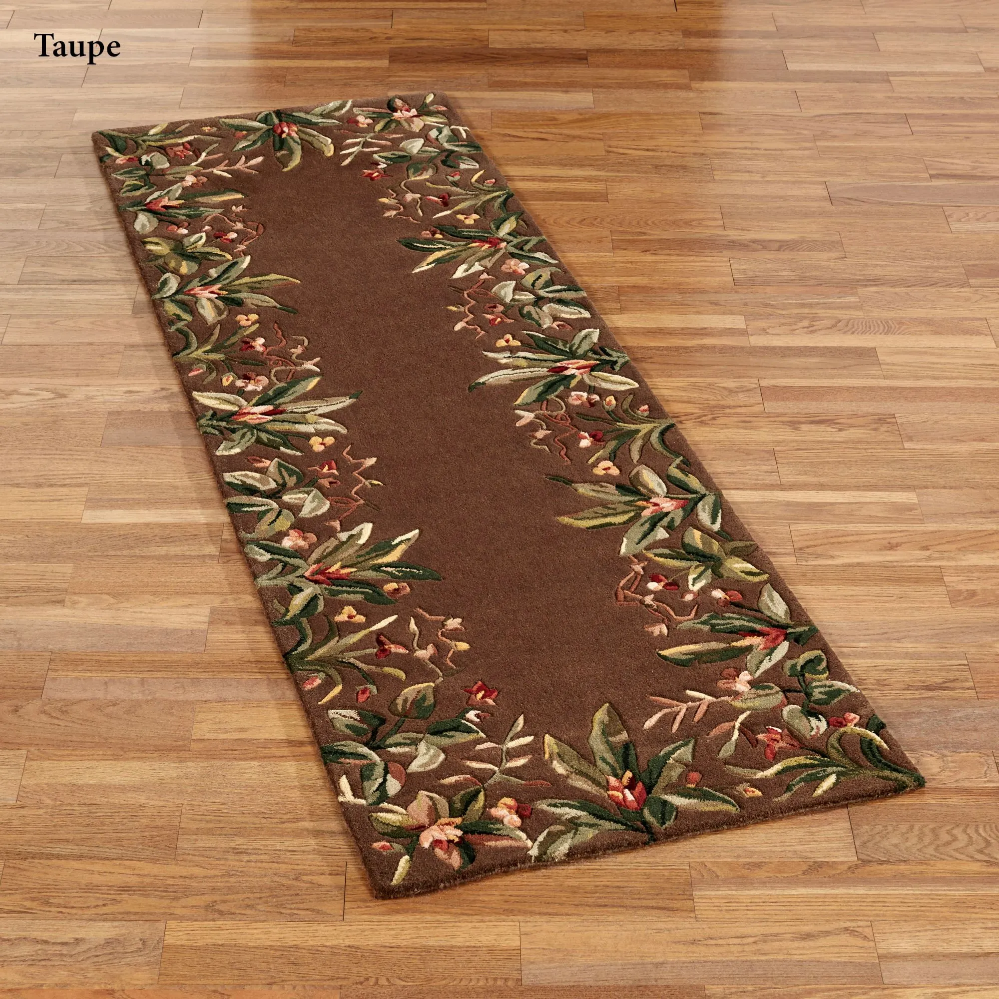 The lush foliage of the tropics is taking over on the Island Flora Rug Runner. A solid field is decorated from every angle with vibrantly colored exotic plants. Handcarving adds dimension to the florals and foliage of this plush, .5" thick, hand-tufted wool rug. Accent colors include shades of green, red, and brown. Backing is cloth-covered latex. We recommend professional cleaning by a rug cleaner. Imported.