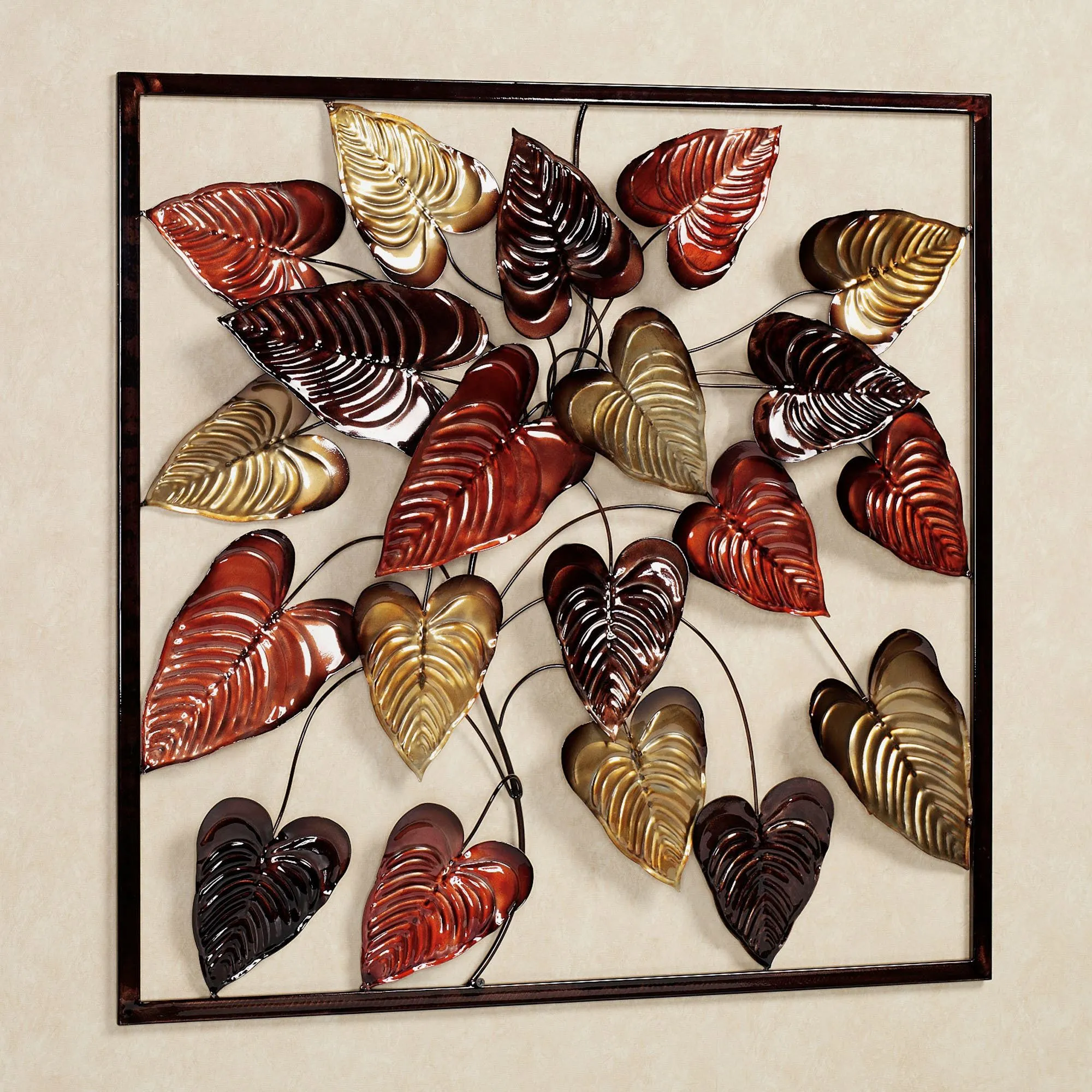 The metal Tropical Bouquet Wall Art is a unique way to add an exotic flair to your decor. Wall art features an array of palm leaves finished in copper, gold, and bronze and will look lovely anywhere in your home. Leaves are framed by a bronze frame. Tropical wall art measures 32" sq.