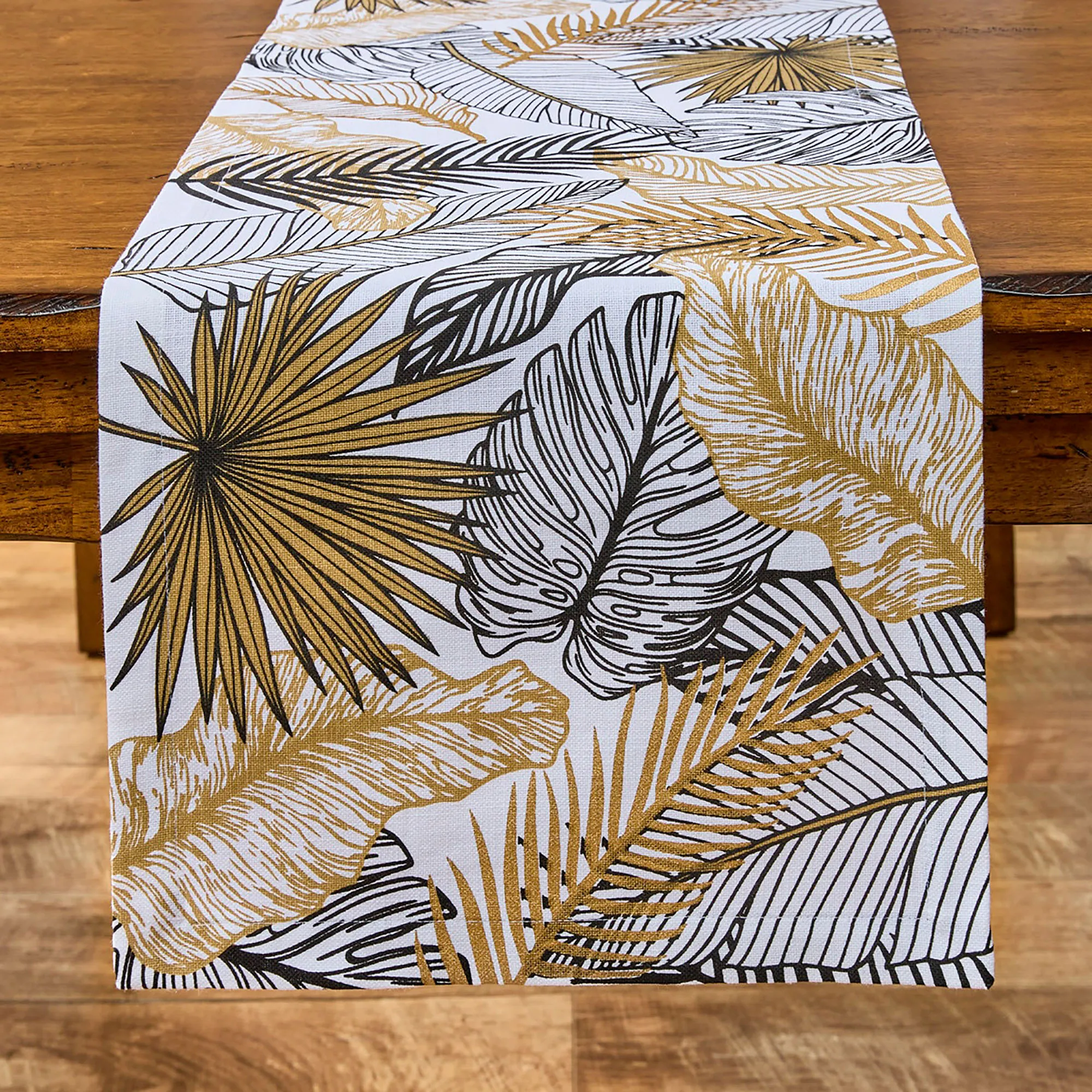 Fern fronds and palm leaves set the table with a Tropical Essence. These cotton table linens have tropical leaves in black and gold on a white background. Specify Table Runner, Placemat Set of 4, or Napkin Set of 4. Table Runner is available in two sizes. Placemats are 19"x13" each. Napkins are 20" sq. each. Machine washable. Imported.