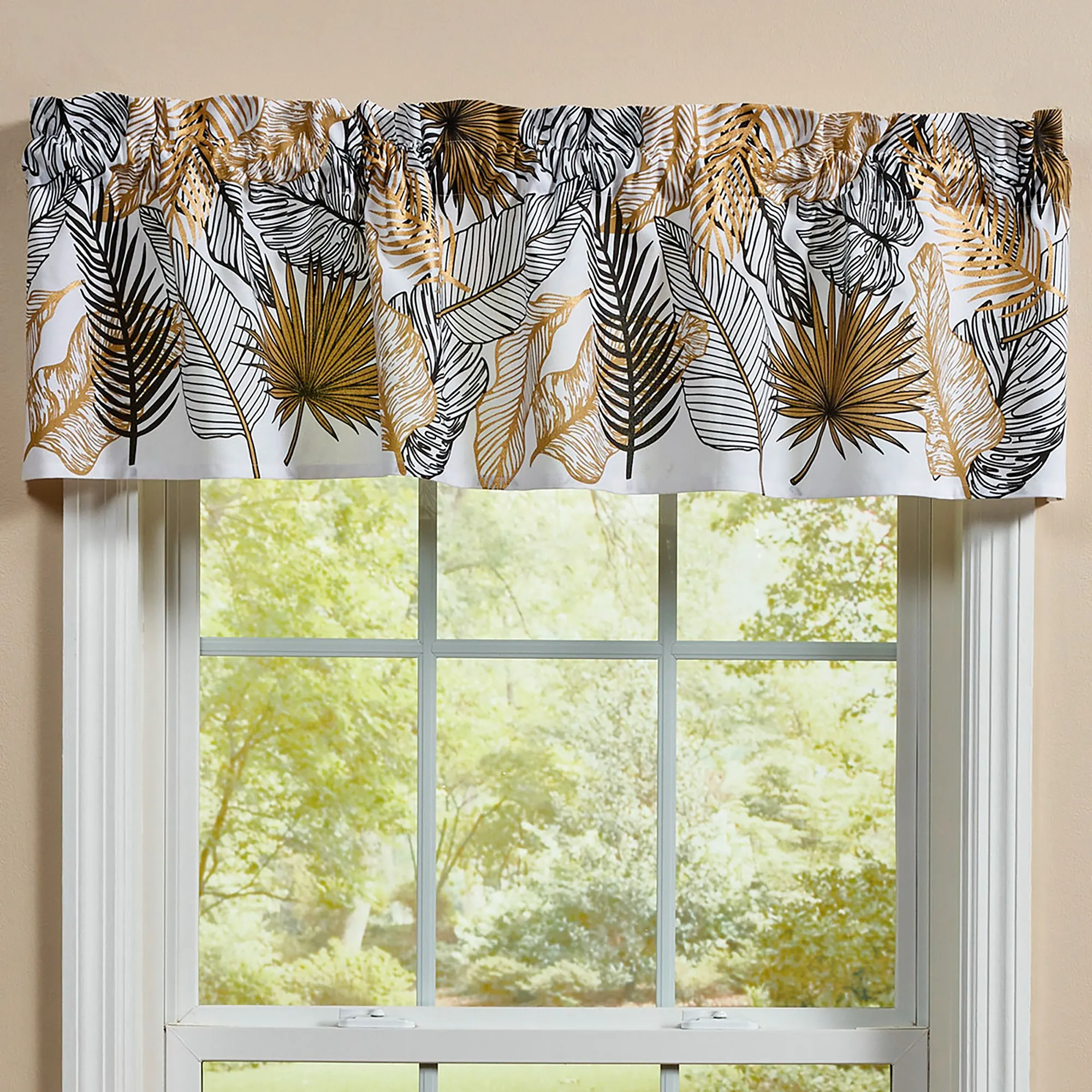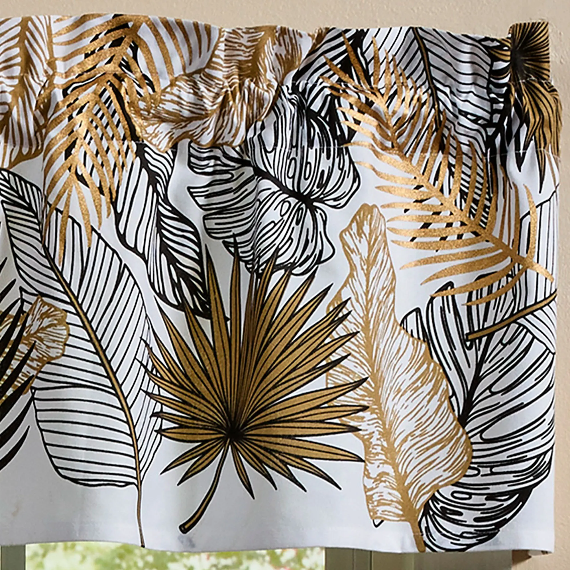 Fern fronds and palm leaves display a Tropical Essence in any space. This cotton window valance has tropical leaves in black and gold on a white background. Rod pocket is 2". Tropical valance measures 60"Wx14"L. Machine washable. Imported.