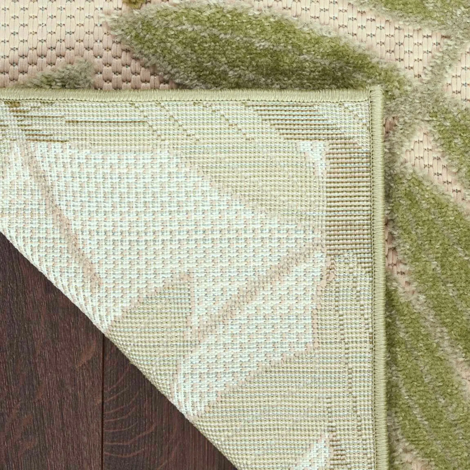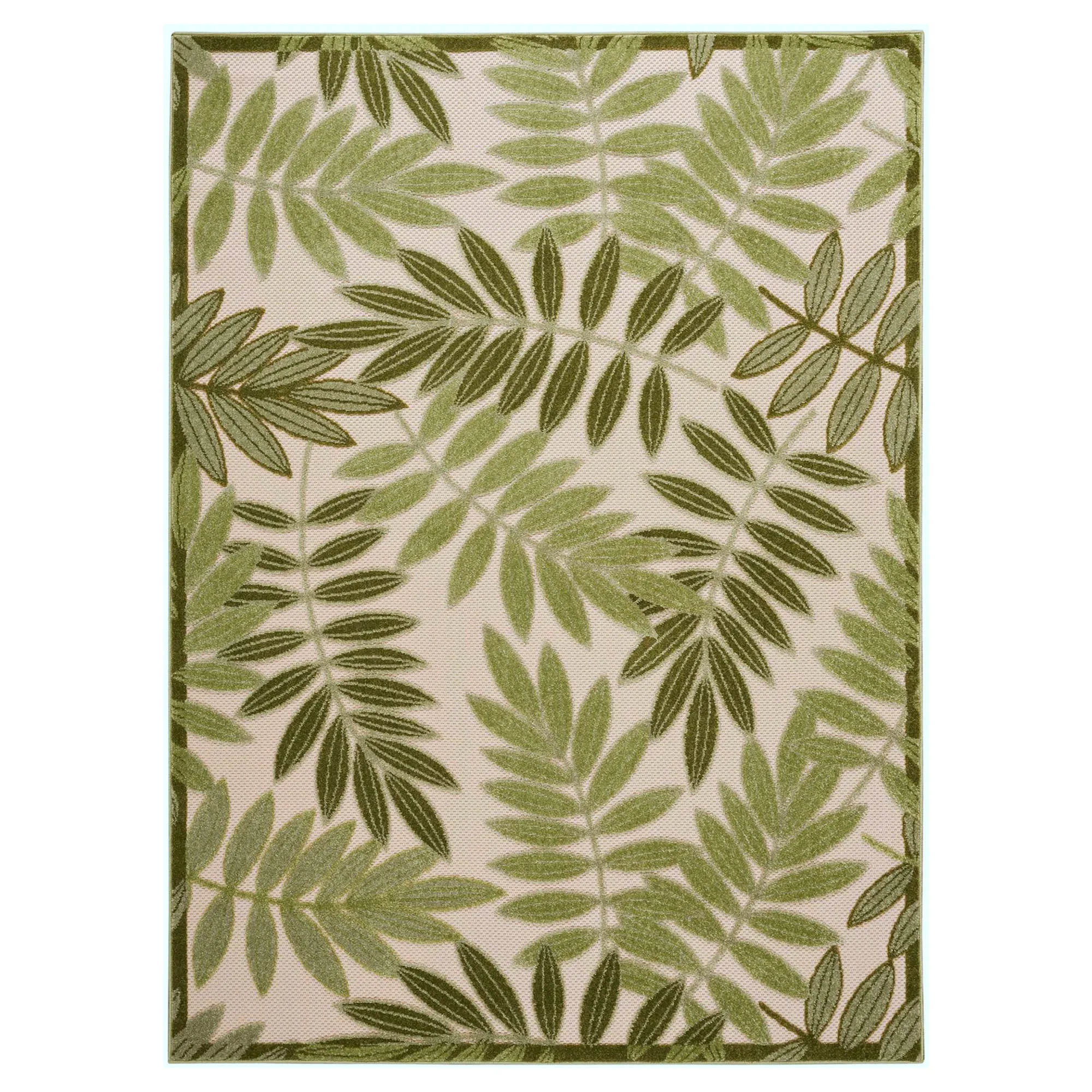 Scattered Tropical Foliage decorates this rug in shades of green. Power-loomed polypropylene area rug, .25" thick, has stain-resistant fibers, features high-low palm fronds on a textured ecru background, and is OEKO-TEX(R) certified, meaning it is free from harmful chemicals and substances. Backing is latex. Rug may be used indoors or outdoors seasonally; do not expose this rug to freezing temperatures. Spot clean and rinse with a garden hose; for stubborn stains, we recommend professional cleaning by a rug cleaner. Imported.