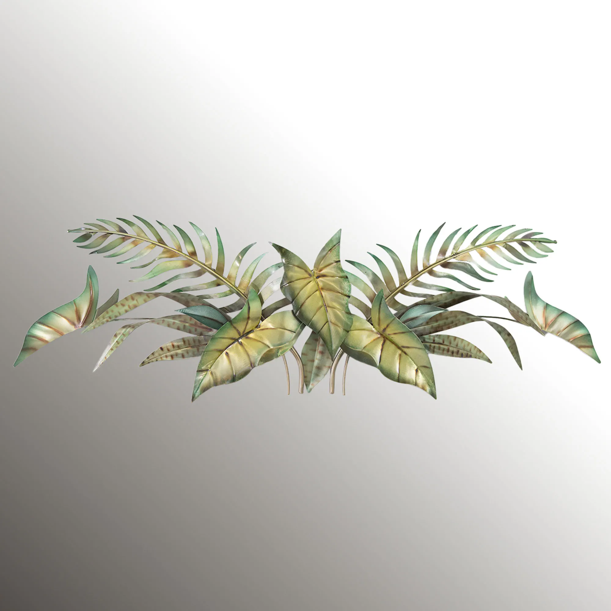 Alocasia fronds and fern leaves create a collage upon the Tropical Foliage Wall Art Sculpture. Made of stainless steel metal, this wall art, by artist Joanne Ferrara, has an exotic variety of green leaves with brown accents. Indoor or covered outdoor use. Tropical wall sculpture measures 41"Wx3"Dx12"H.