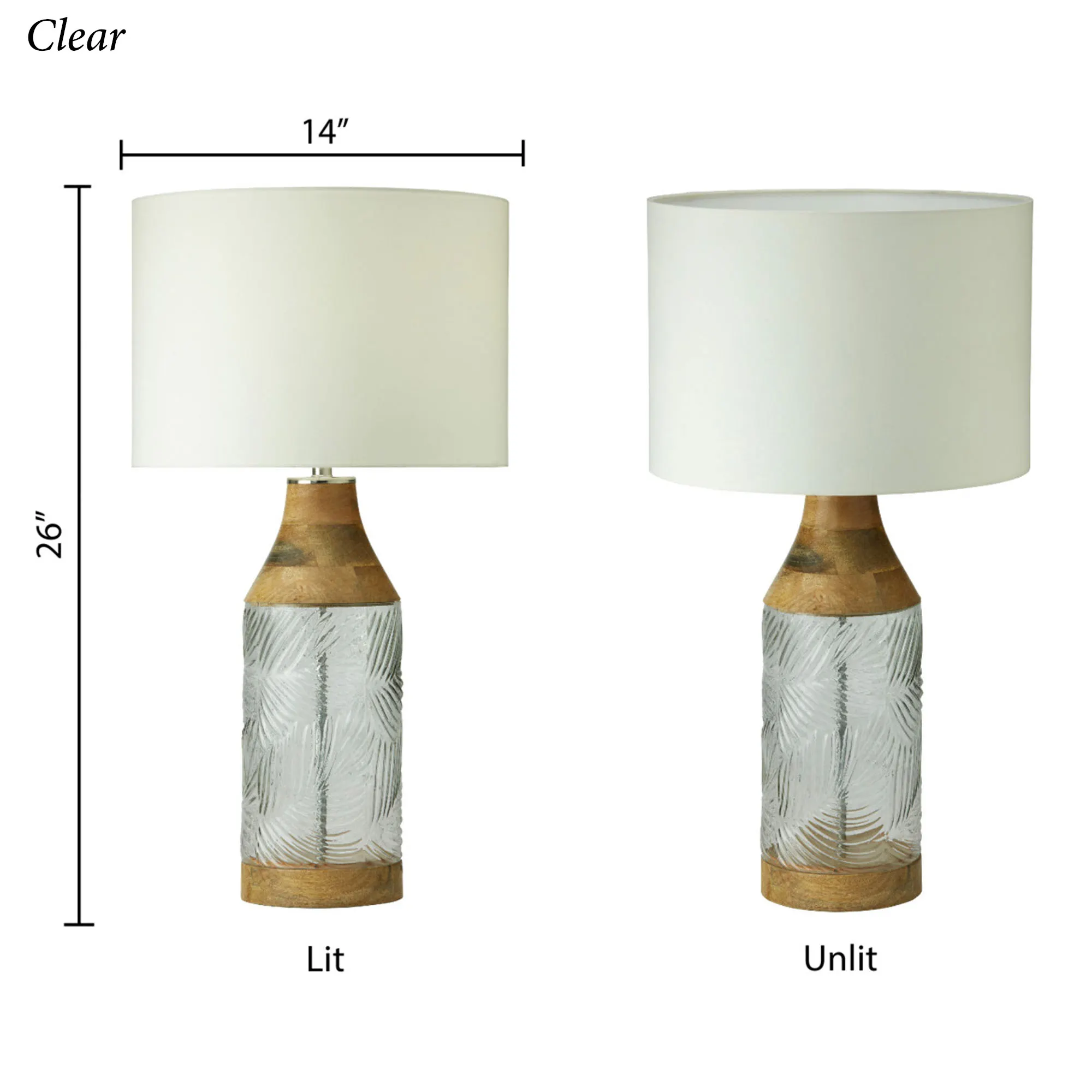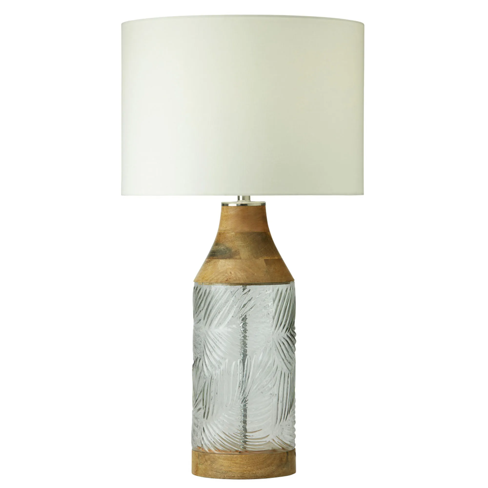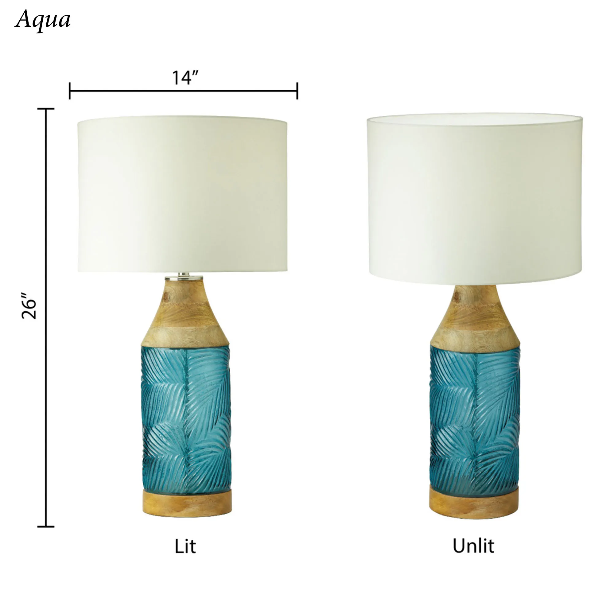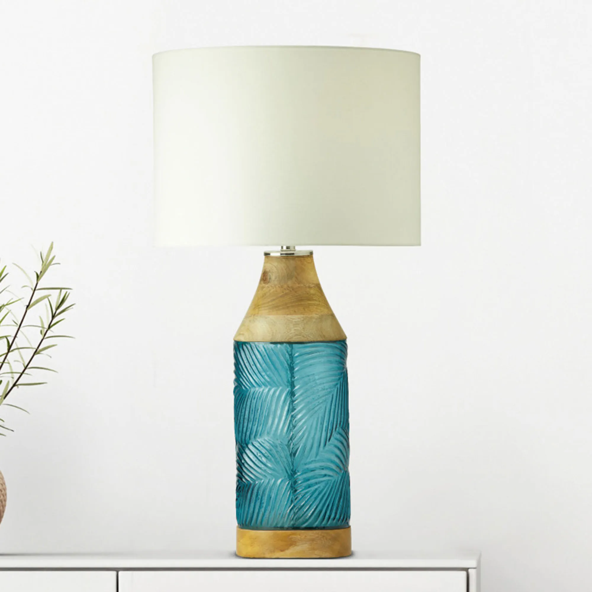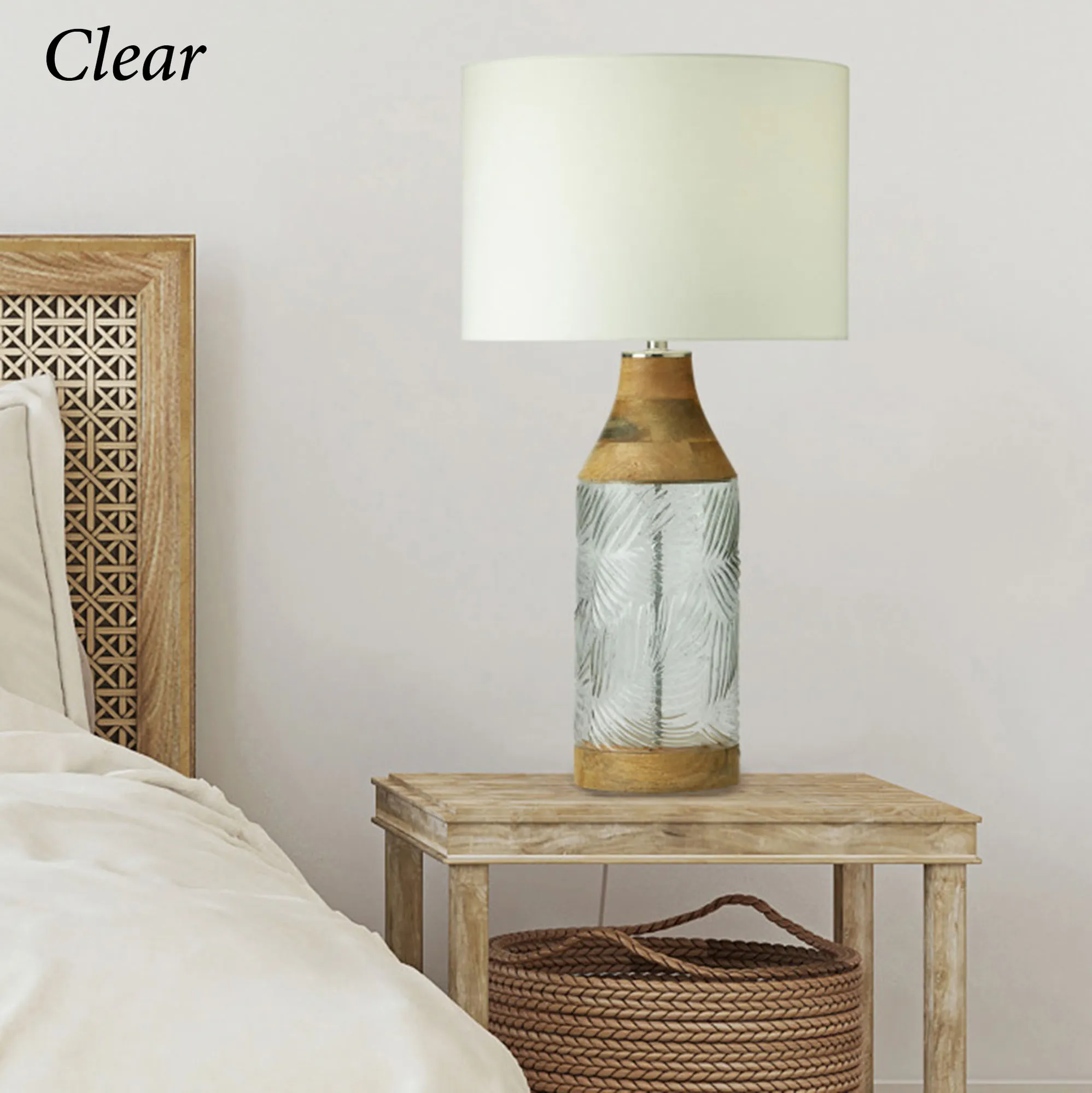 The Tropical Impressions Table Lamp is glass and mango wood with a fabric shade.
