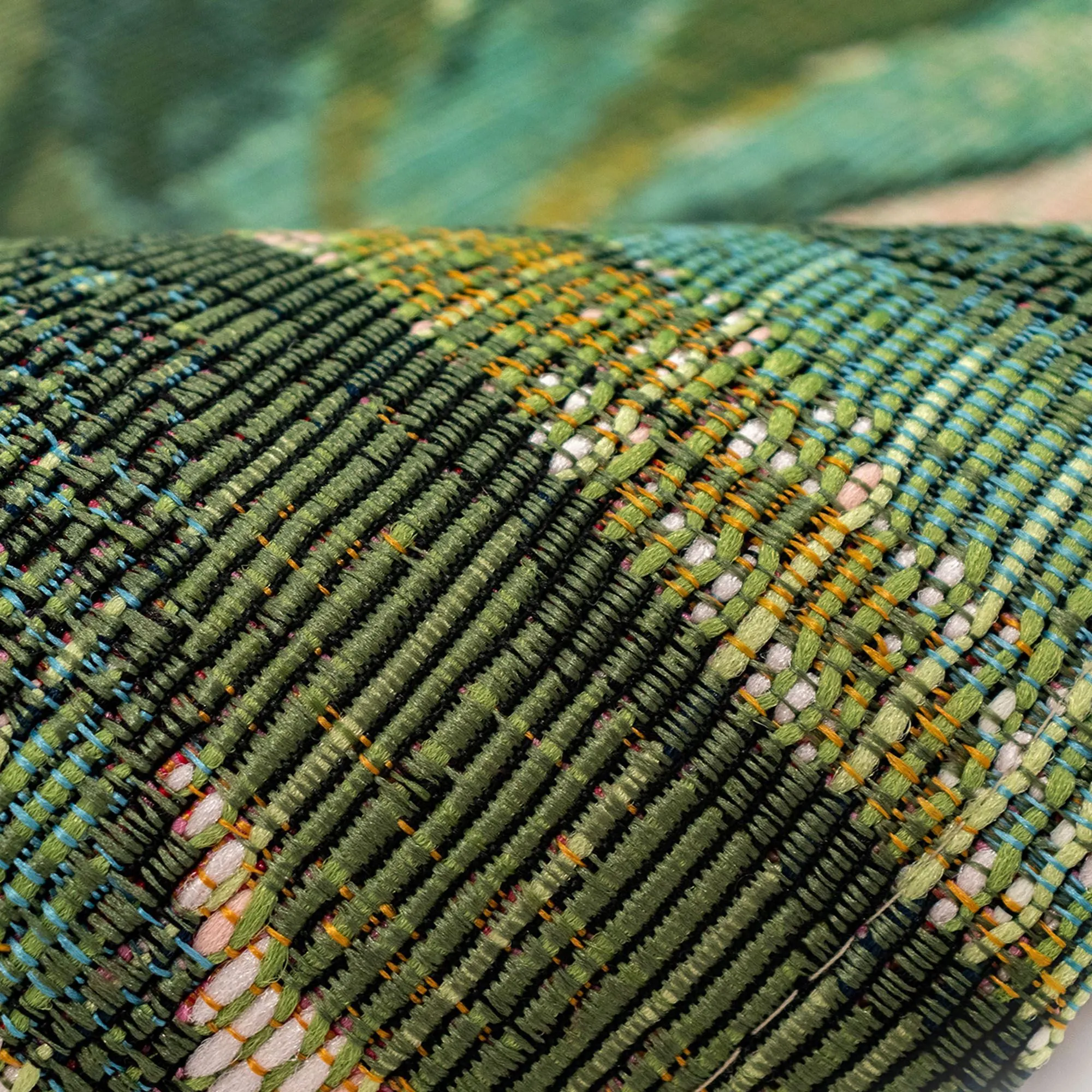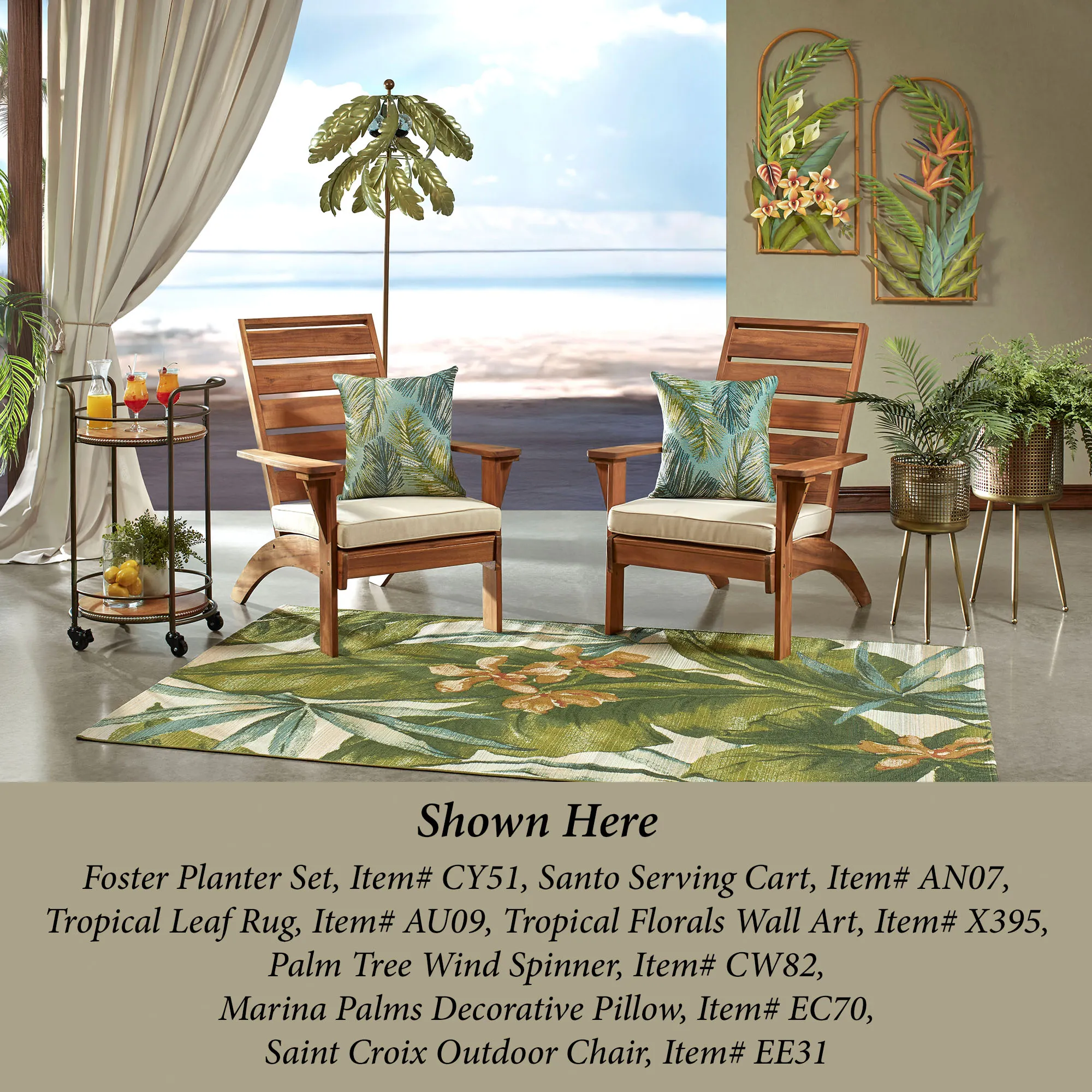 Tropical Leaves are the gateway to an exotic paradise. This Wilton-woven polypropylene/polyester area rug, .12" thick, is designed by Liora Manne and features a large-scale leaf and flower design. Colors include shades of loden, green, dark jade, cream, and rust. Rug may be used indoors or outdoors seasonally; do not expose this rug to freezing temperatures. Spot clean and rinse with a garden hose; for stubborn stains, we recommend professional cleaning by a rug cleaner. Imported.