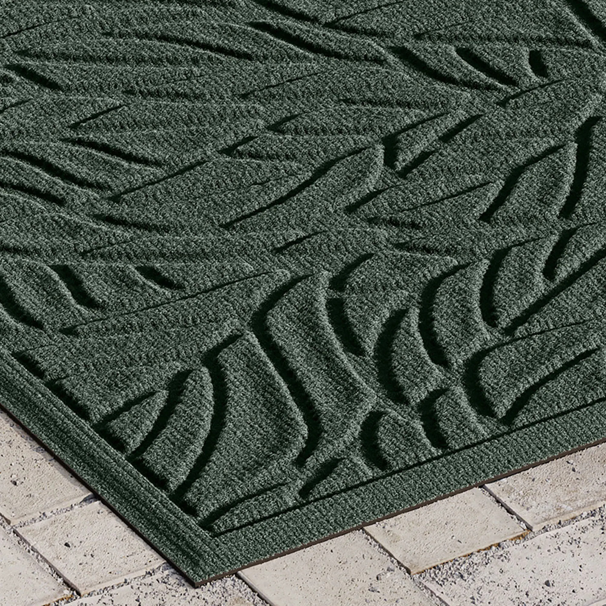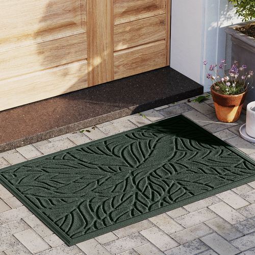 Step on the exotic side of nature with the Tropical Leaves Indoor/Outdoor Doormat. Proudly made in the USA, the .5" thick, molded design resembles a layer of scattered tropical fronds. The antistatic PET polyester floor mat has a skid-resistant SBR rubber backing that is slip-resistant and certified by the National Floor Safety Institute. The WaterHog(R) exclusive Water Dam border keeps dirt and water on the mat and not your floor. Design is mildew-, mold-, and rot-resistant to withstand indoor or outdoor year-round use. Specify Dark Green, Charcoal, Dark Brown, Gray, Khaki, Navy, or Slate Blue. Doormat measures 35"x23". Shake to remove dirt; hose off to clean.
