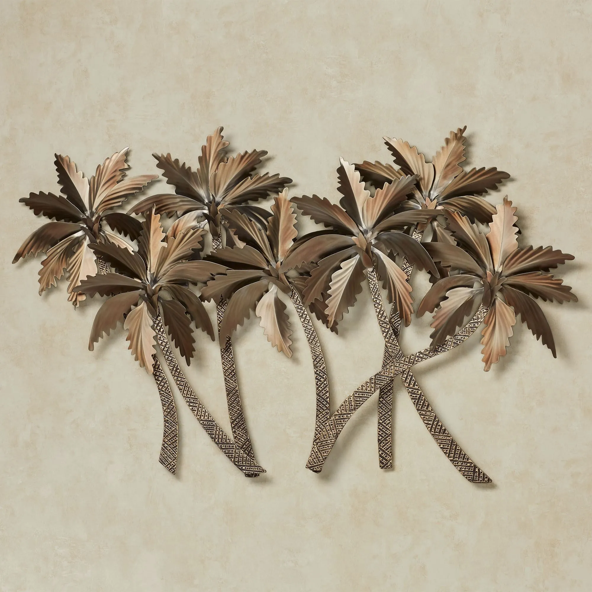 Relax as breezes from the ocean and the Tropical Palm Grove offer a respite from the heat of the sun. Dimensional wall sculpture of swaying palms is handcrafted of stainless steel with hand-brushed elements and has a bronze finish. Leaves are hand-grinded; the trunk is textured. Palm tree metal wall art is approx. 50"Wx4"Dx31"H; weighs 10 lbs.