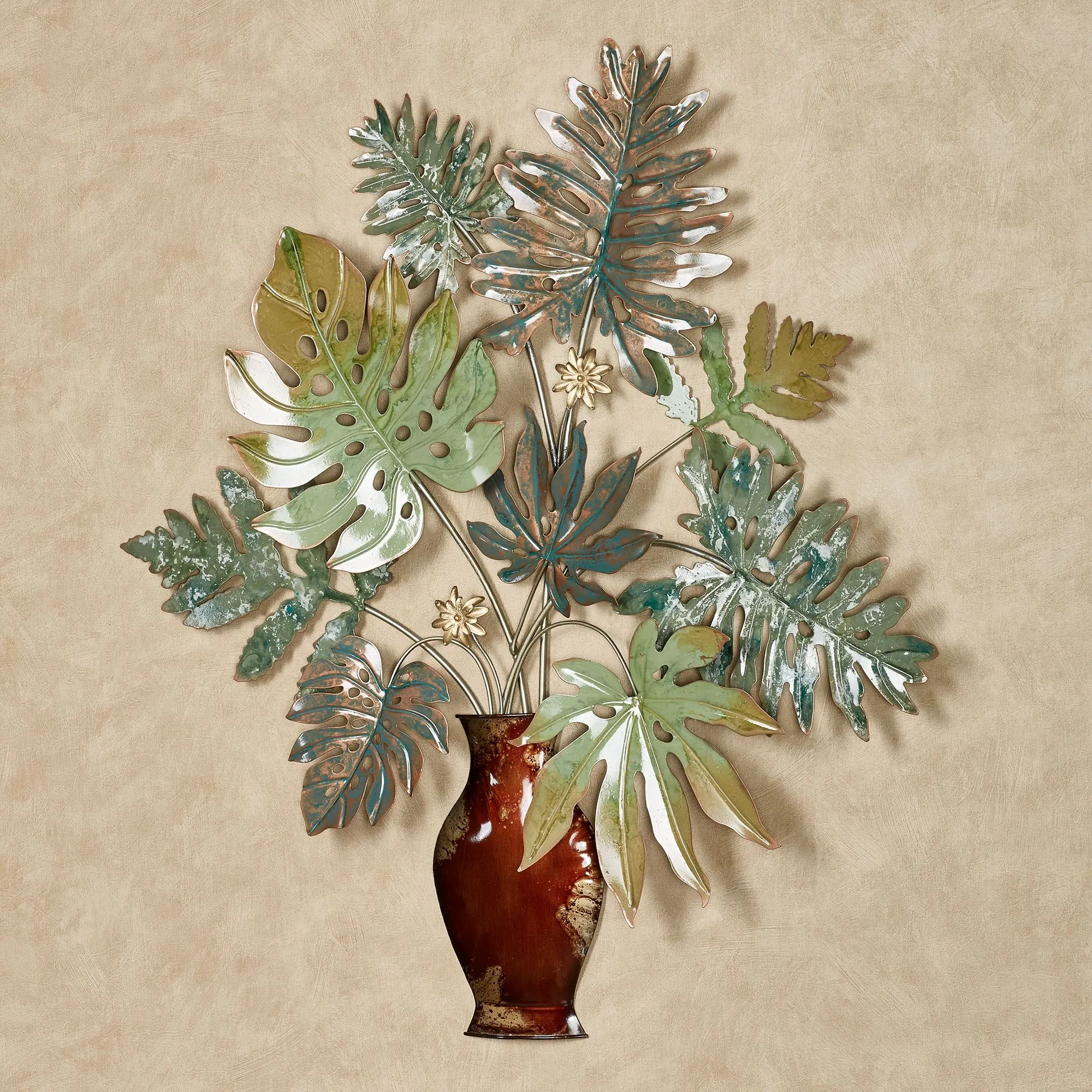 The Tropical Palms in Vase Metal Wall Art elegantly displays palm fronds in various hand-dyed shades of green. Each leaf in the brown vase with gold accents is beautifully embellished with copper, gold, or platinum detailing. Tropical wall art measures 34"Wx3"Dx37"H.