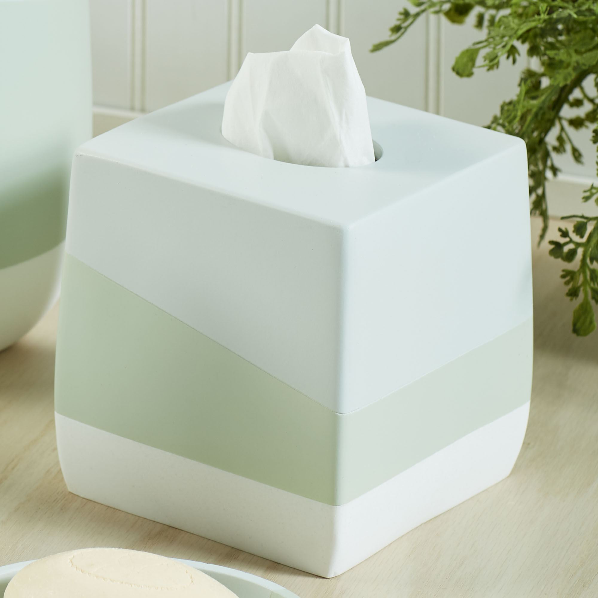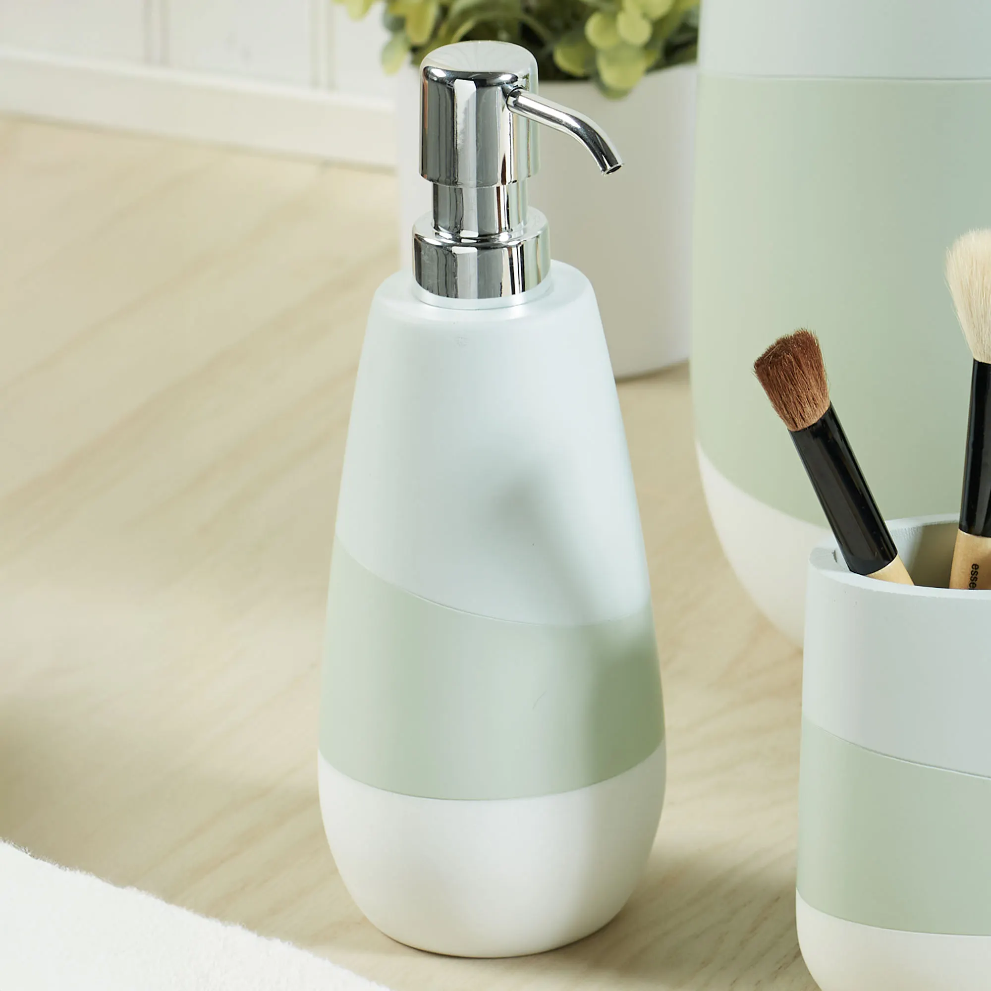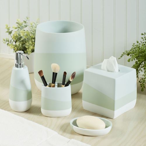The shades of light green, celadon green, and white on the Tropiluxe Bath Accessories offer a soothing complement to any bath area. These resin bath accessories, by Nicole Miller, have irregular bands with a sleek and modern look. The Brush Holder will hold toothbrushes or makeup brushes. Specify Brush Holder, Lotion/Soap Dispenser, Soap Dish, Tissue Cover, or Wastebasket.