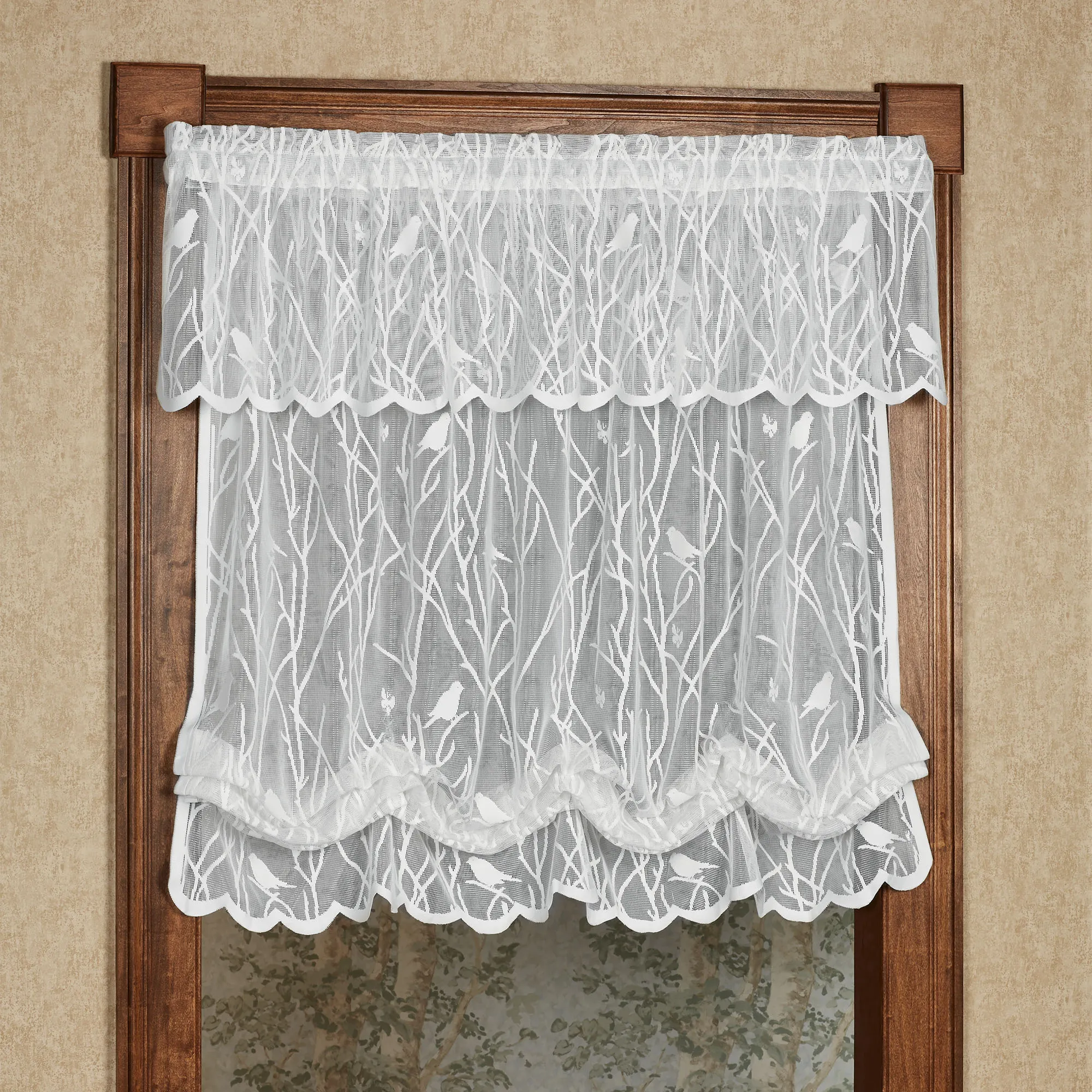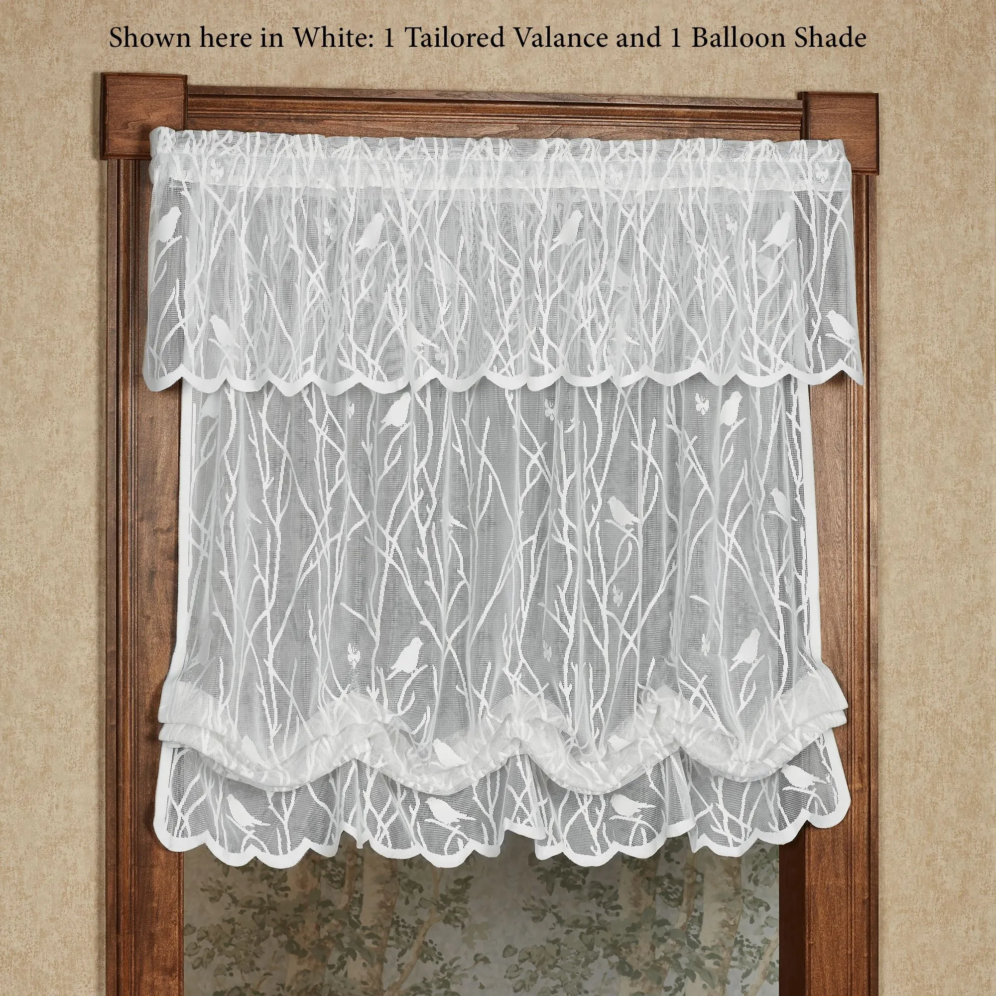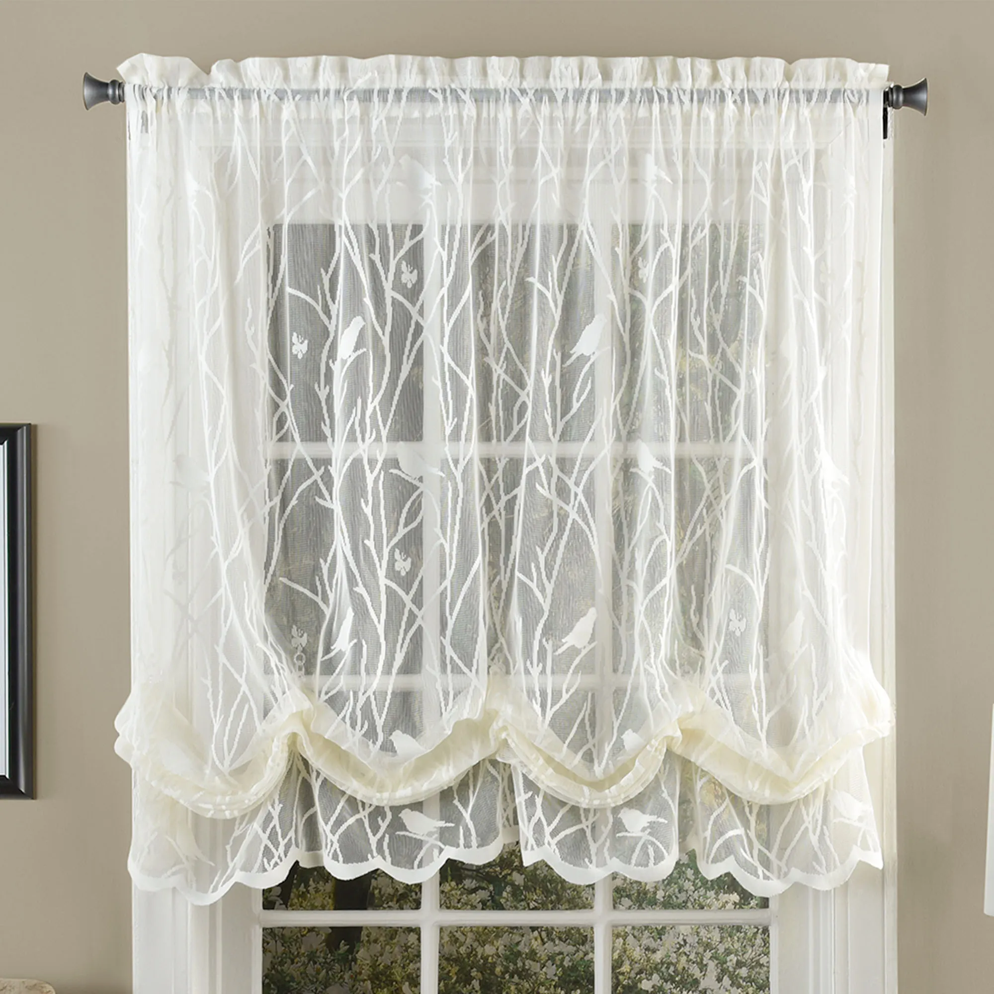 Birds in the forest are singing sweetly on the Troubadour Lace Balloon Shade. Lace, polyester window shade has a lightly textured design and scalloped edges. Balloon shade has rings that can be adjusted to five different lengths. Shade has a 1.5" rod pocket and is 56"Wx63"L. Washable. Imported.
