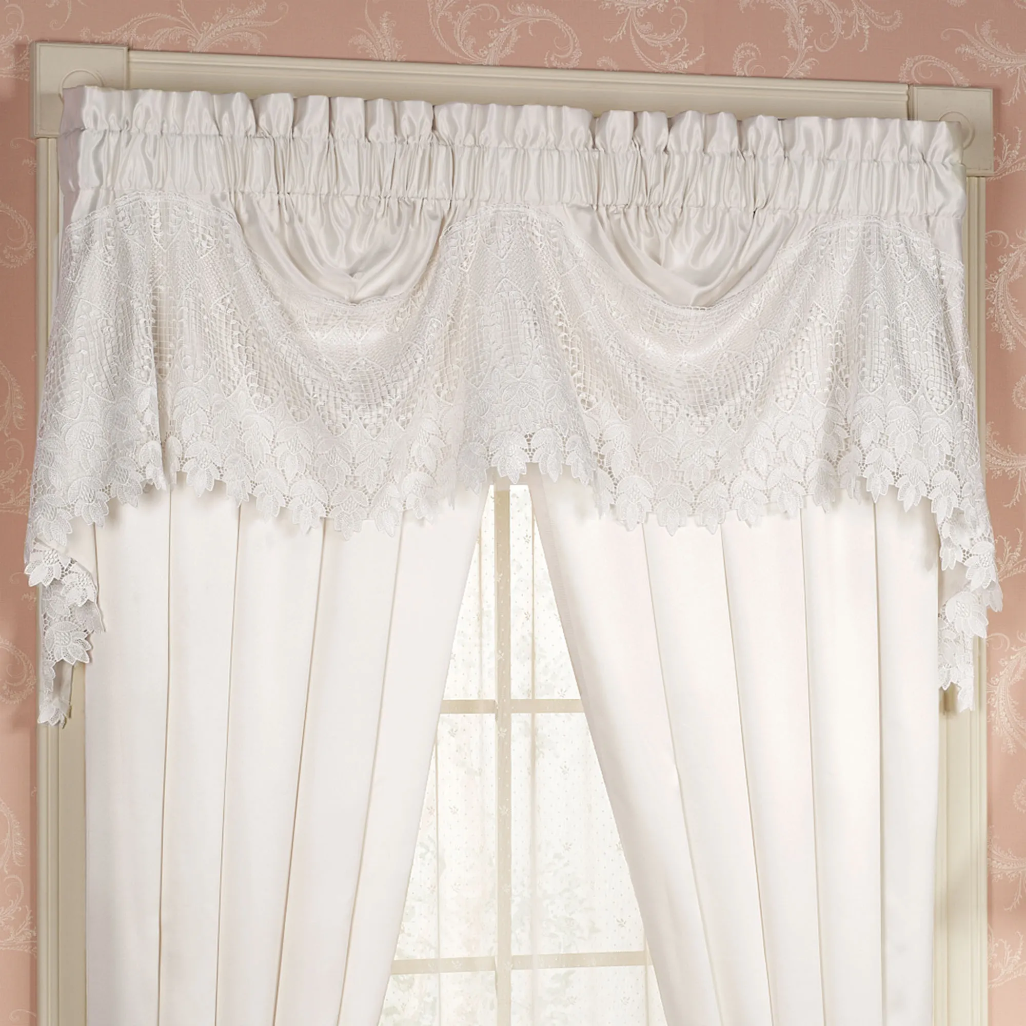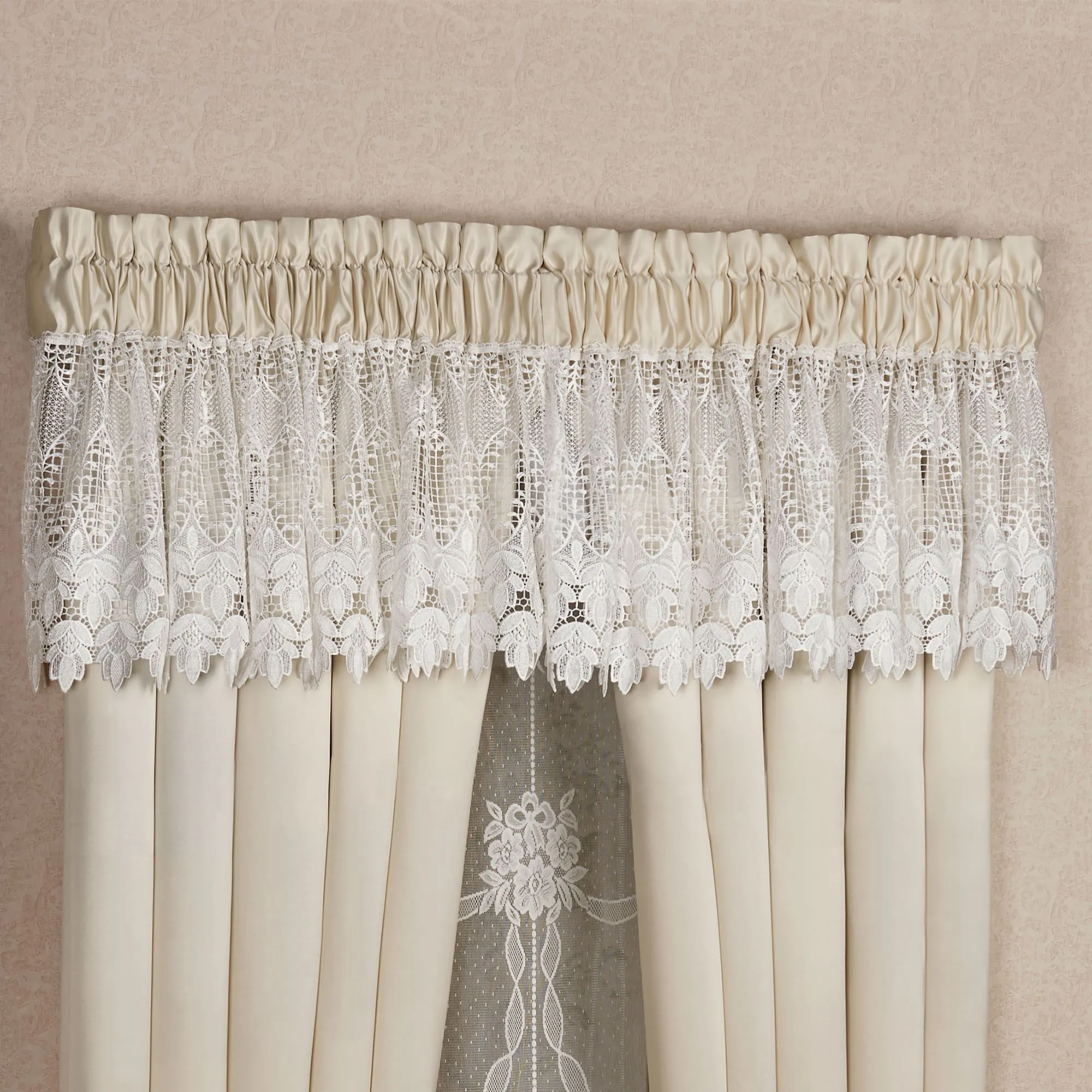 The romantic Trousseau Lace Balloon Shade calls to mind the fine linens that a bride would prepare for her bridal chest. Balloon shade is solid poly satin with lace on bottom edge and has four columns of adjustable rings. Tailored Valance is macrame lace. Poly satin Empire Valance has 14" macrame lace on the bottom; valance fits windows up to 40"W. Polyester window treatment has 3" rod pockets. Hand wash/machine wash. Imported.
