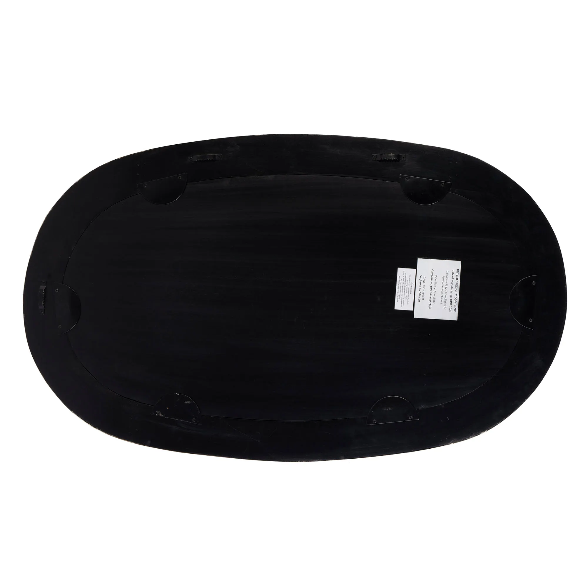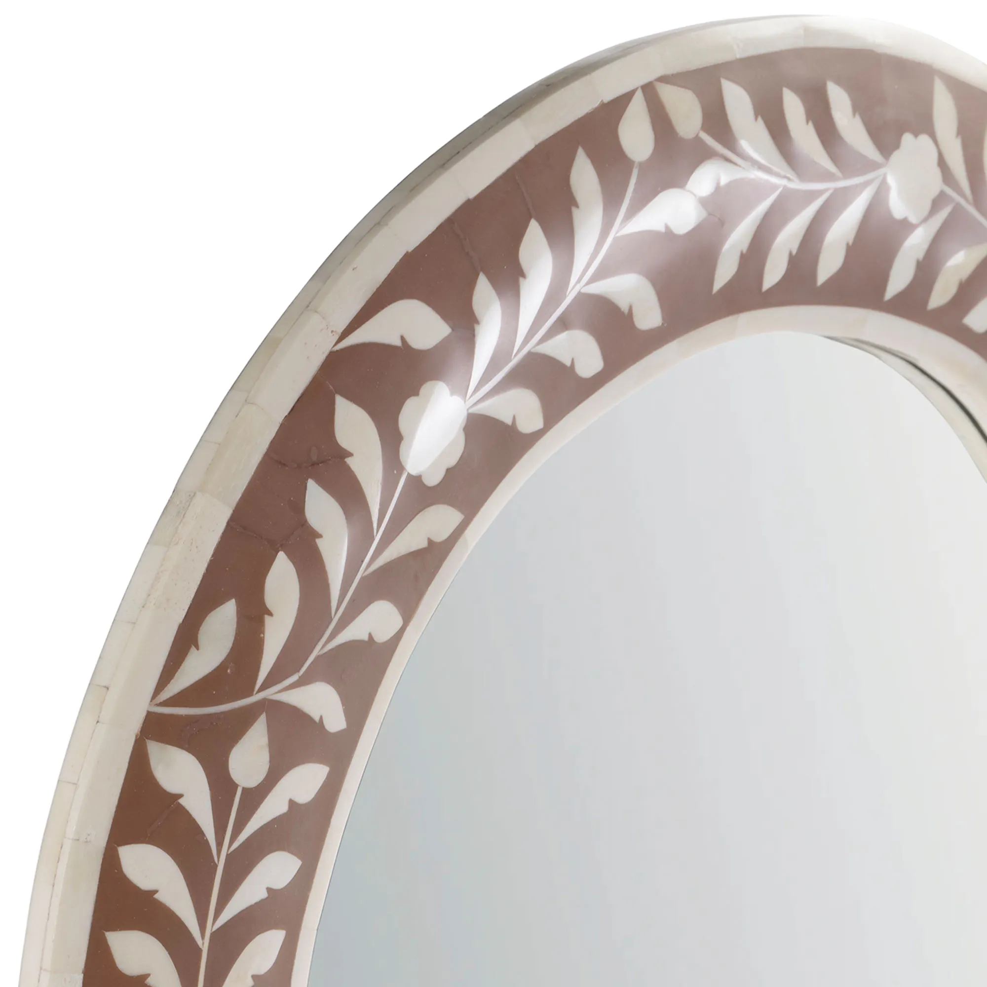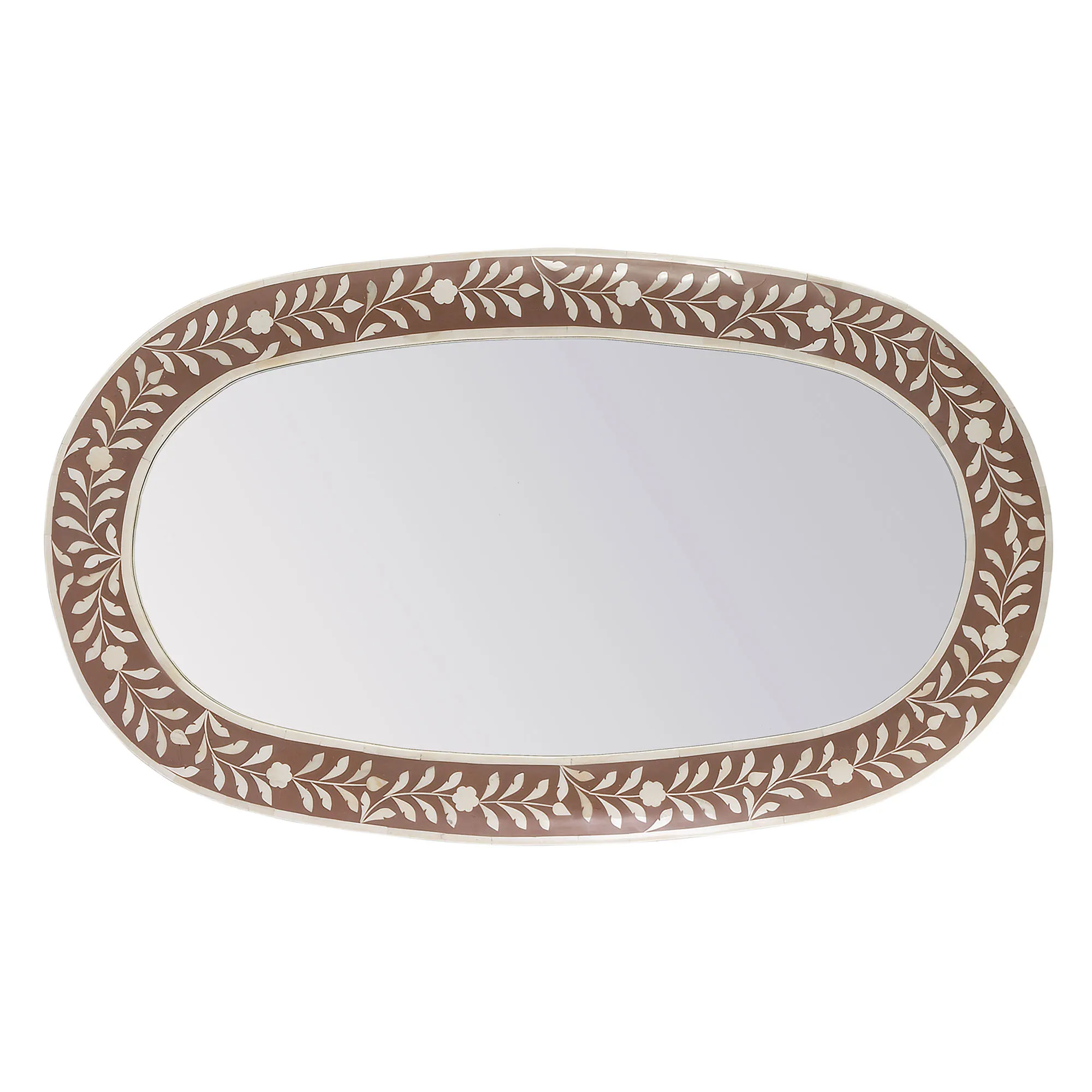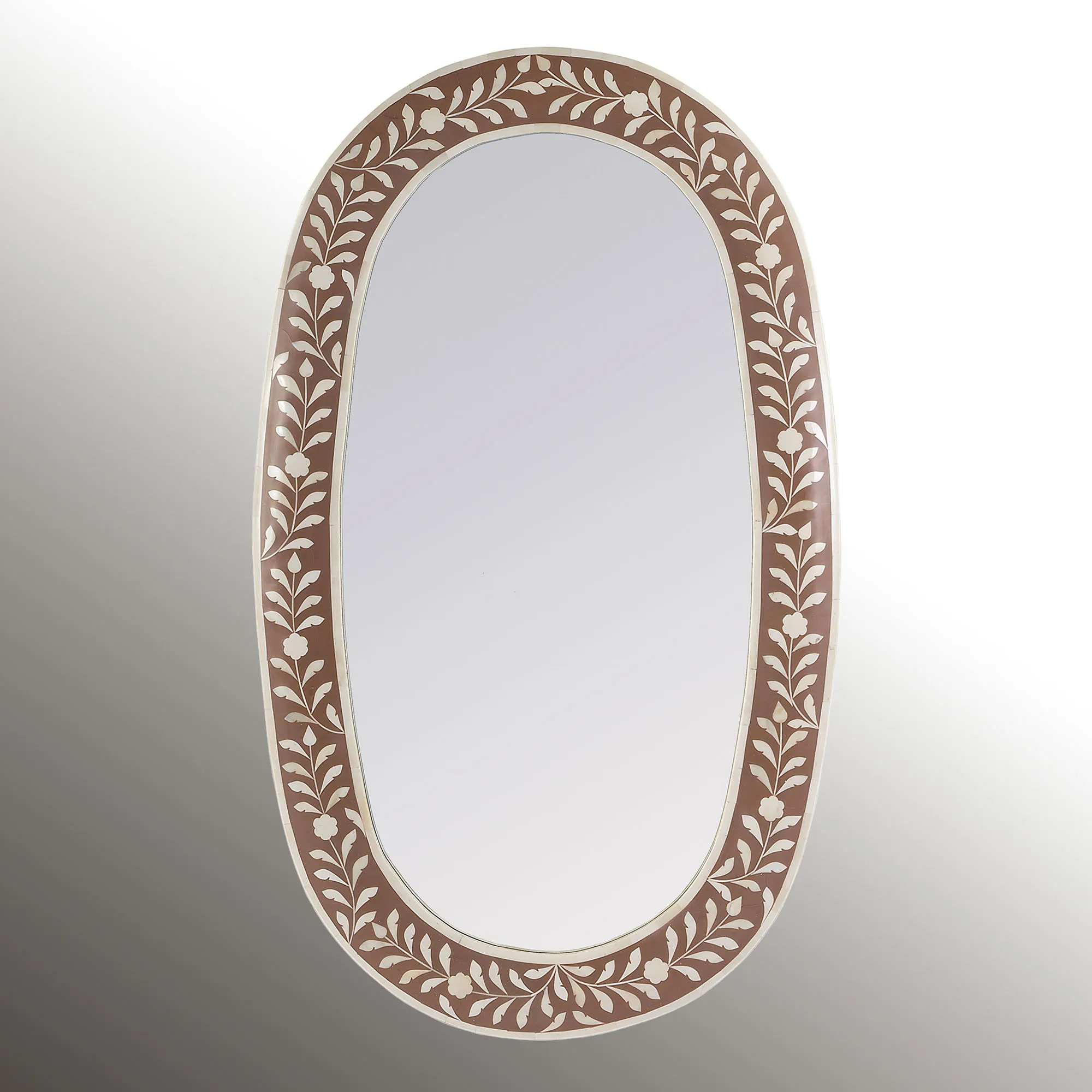 The Trubadur Oval Wall Mirror is glass, bone, resin, and wooden.