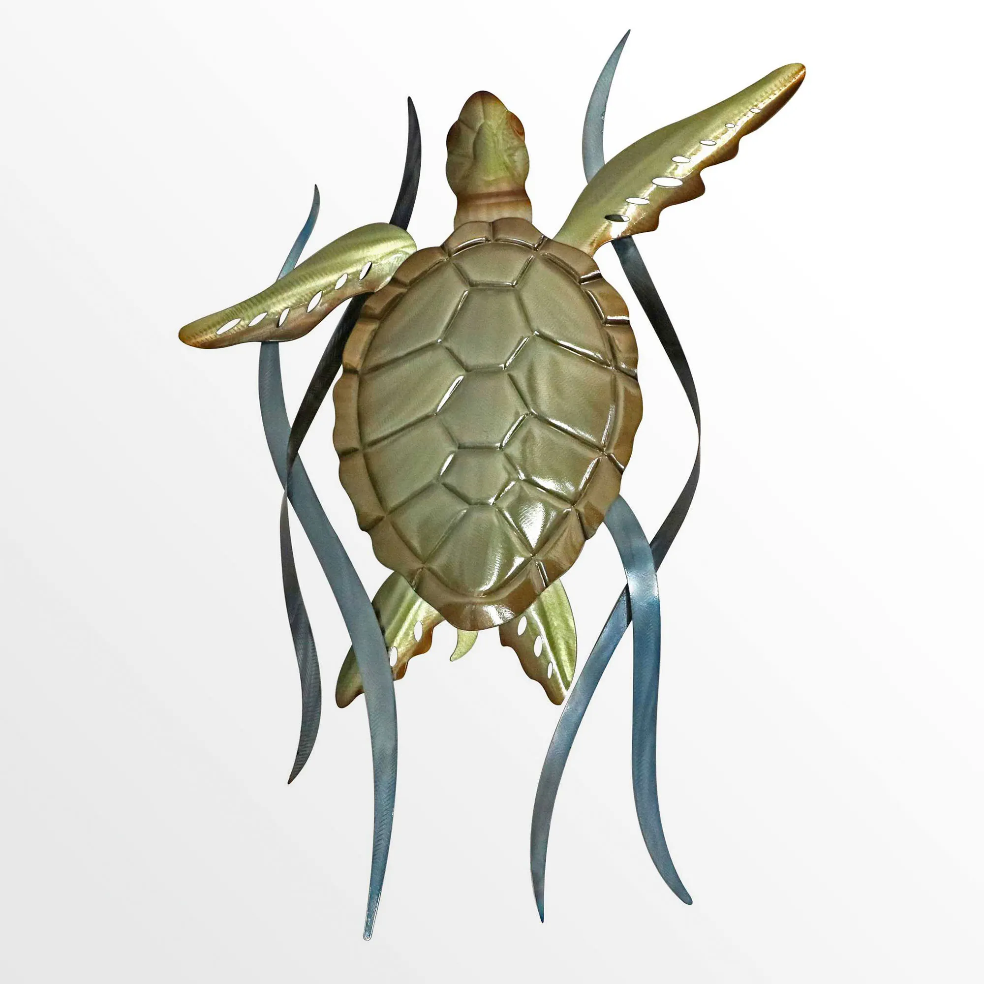 Spotted along the cove, the Turtle and Seagrass stalks ride the ocean current. Designed by artist Joanne Ferrara, the metal and stainless steel wall sculpture features a beautiful sea turtle swimming through swaying blades of seagrass. Hand-dyed hues of bronze, green, and blue bring the design to life beside unique hand-grinded detailing. Perfect for your covered porch, enclosed patio, or indoor space, the sea turtle wall art measures 22"Wx2"Dx31"H.