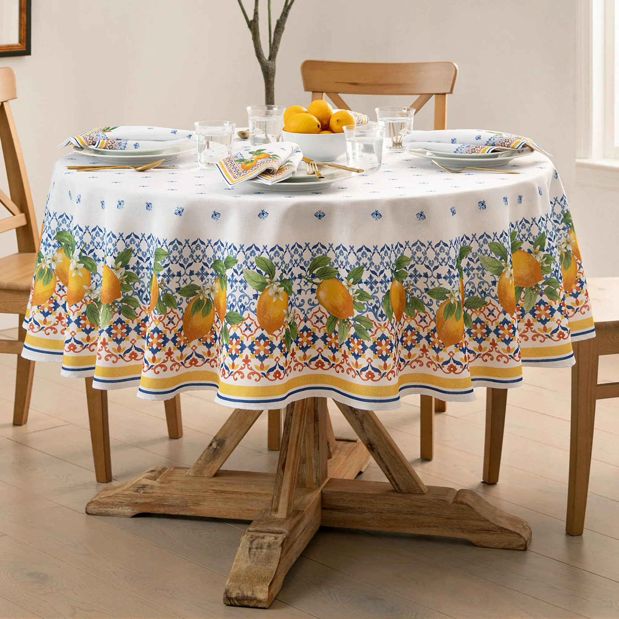 Tuscan Lemons add a little bit of zest to your tabletop. These polyester table linens have citrus bloom clusters, leaves, floral motifs, and ornate designs on a soft white background. Edges are hemmed. Colors are shades of rust, indigo blue, yellow, and green. Choose Napkin Set of 4, Rectangle Tablecloth, Round Tablecloth, Table Runner, or Placemat Set of 4. Machine washable. Imported.