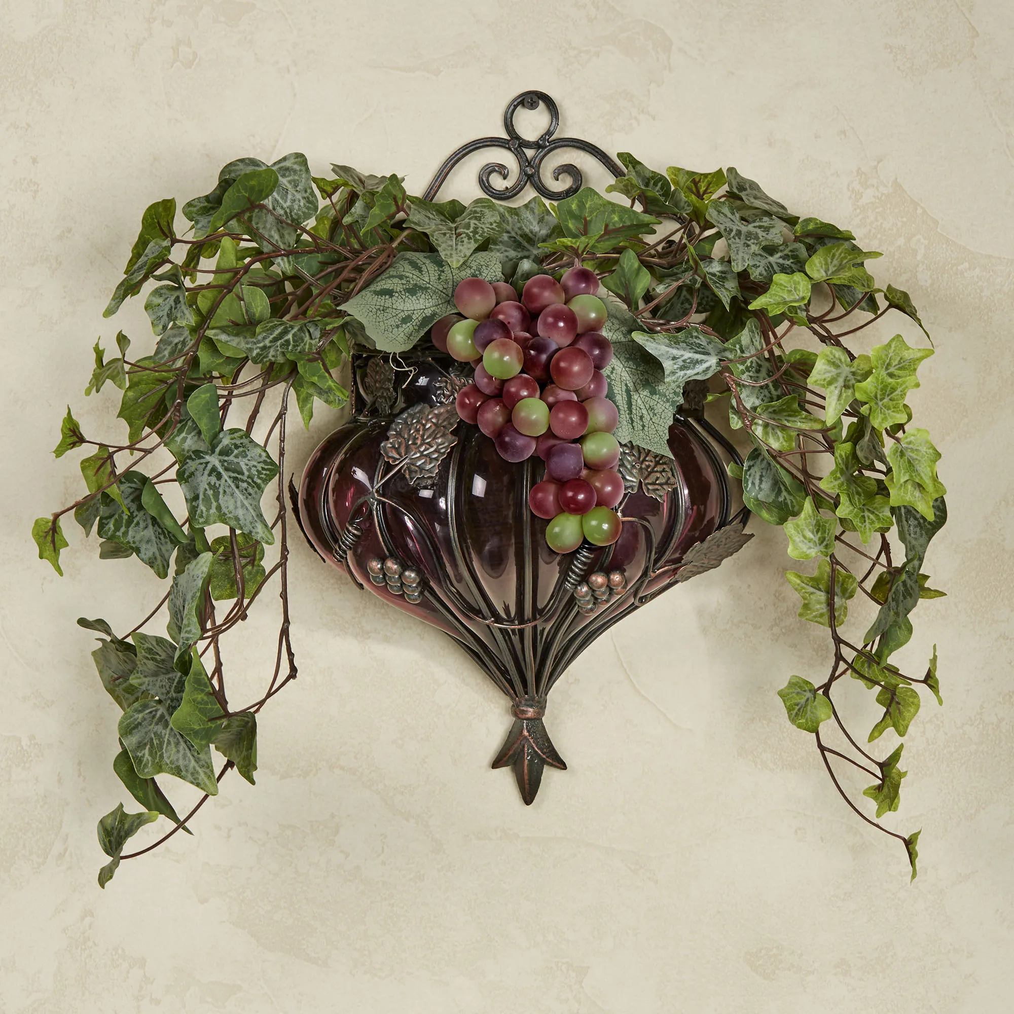 The Tuscania Wall Accent is made from polyester silk ivy, faux grapes, glass, and metal.