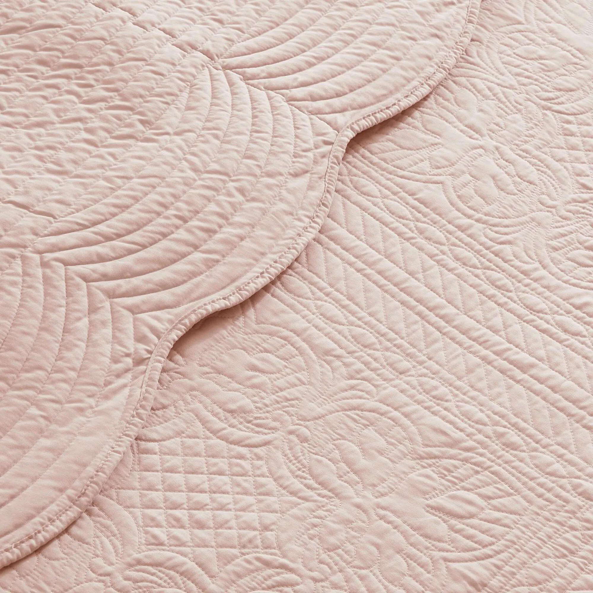 Ornate floral medallion designs beautifully embellish the classic look of the Tuscany Blush Bedding by Madison Park. The Mini Quilt Set includes an oversized quilt and two shams. This lightweight, polyester microfiber bedding features intricate quilted motifs and has an antimicrobial treatment for built-in freshness protection that reduces the growth of odor-causing bacteria. The reversible, solid blush quilt has scalloped, bound ends. Fill is a cotton blend. Machine washable. Imported.