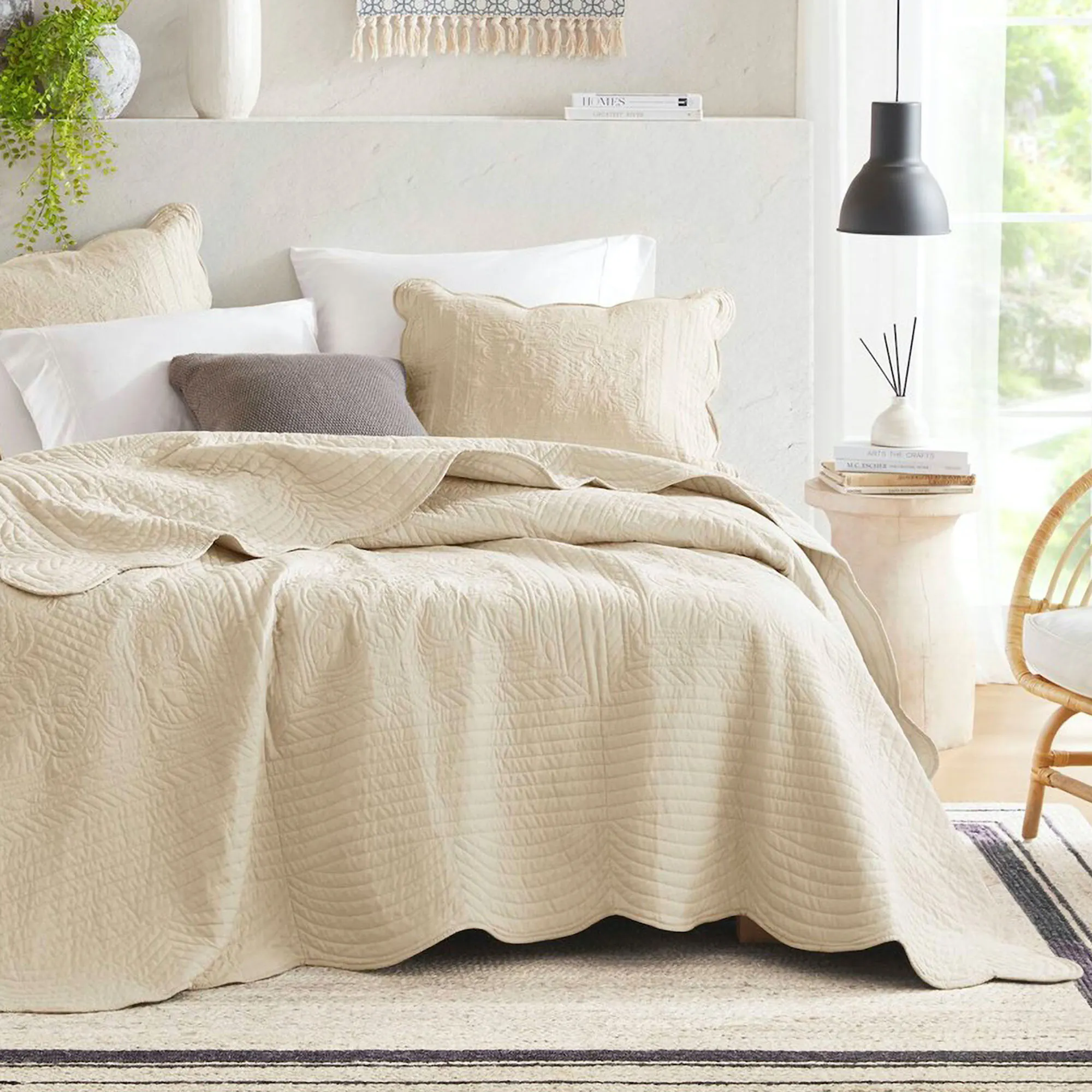 The shams mimic the quilt and have scalloped, bound ends and French back closures.
