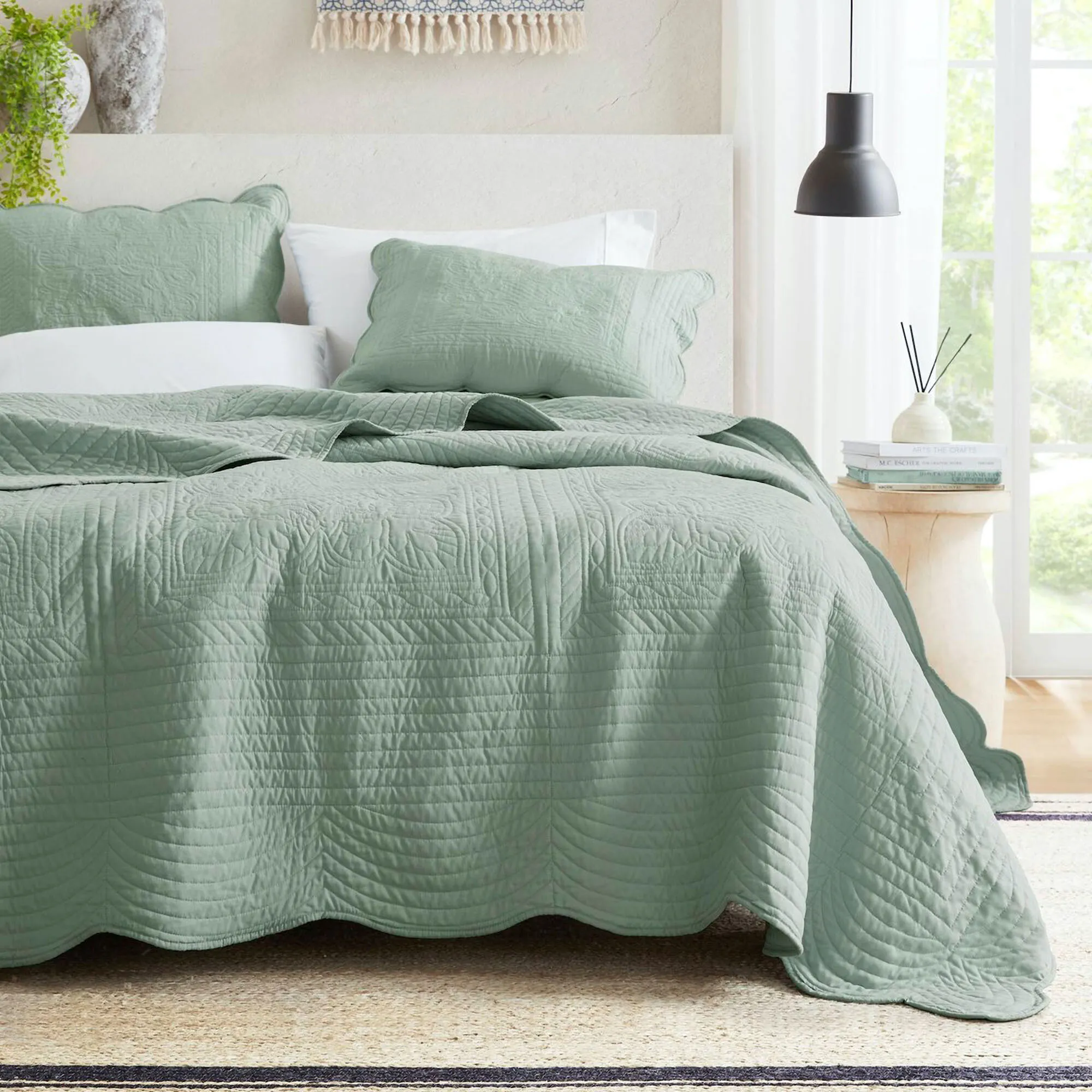 The shams mimic the quilt and have scalloped, bound ends and French back closures.